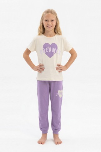 Garson Kız Çocuk Kalp Baskılı %100 Pamuk Reaktif Boyama Süprem Kumaş Kısa Kollu Pijama Takımı
