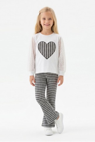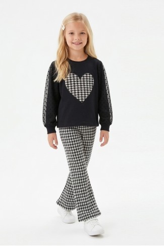 Kız Çocuk Süprem Jogger Kumaş Kalp Desenli Tül Detaylı Tişört Ve İspanyol Paça Pantolon Takımı