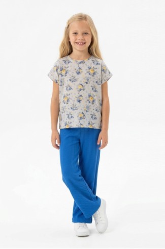 Kız Çocuk Puantiyeli Çiçek Desenli Kısa Kollu Bluz Fitilli Pantolon İkili Takım