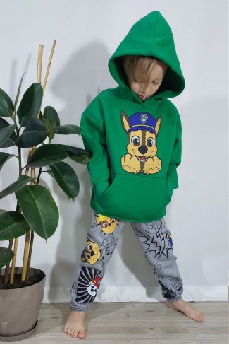 Üç İplik Şardonlu Kapşonlu Baskılı Yeşil Takım