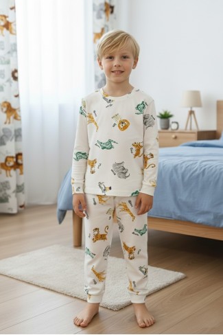 Erkek Çocuk Safari Hayvan Desenli %100 Pamuk Reaktif Boyalı İnterlok Kumaş Uzun Kollu Pijama Takımı