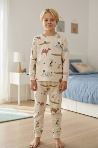 Garson Erkek Çocuk Safari Hayvan Desenli %100 Pamuk Reaktif Boyalı İnterlok Kumaş Uzun Kollu Pijama Takımı