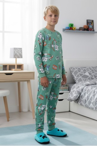 Erkek Çocuk Desenli %100 Pamuk Reaktif Boyalı İnterlok Kumaş Uzun Kollu Pijama Takımı