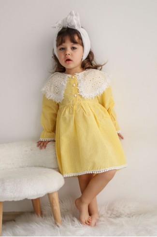 2-8 Yaş Bebe Yaka Pitikareli Sarı Elbise