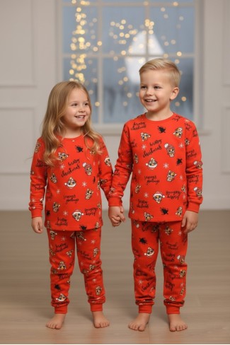 Garson Uniseks Çocuk Mutlu Yıllar Temalı %100 Pamuk Reaktif Boyalı Süprem Kumaş Uzun Kollu Pijama Takımı