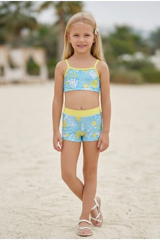Kız Çocuk Polyester + Elastan Tropikal Yaprak Desenli Büstiyer ve Şort İkili Mayo