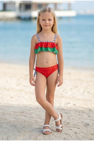 Kız Çocuk Polyester + Elastan Karpuz Desenli Çizgili Askılı ve Yanları Bağlamalı Şık Tasarım İkili Mayo