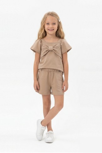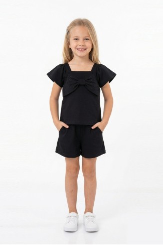 • Kız çocuklar için tasarlanan önü fiyonk taş baskılı kare yaka tişört ve cepli şortlu takım şık ve rahat bir kullanım sunar;