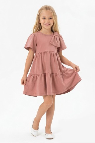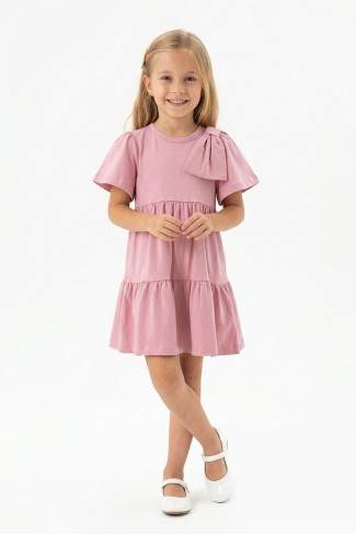 Kız Çocuk Bel Büzgülü Omuz Taş Baskılı Fiyonklu %100 Pamuk Süprem Kumaş Yazlık Elbise
