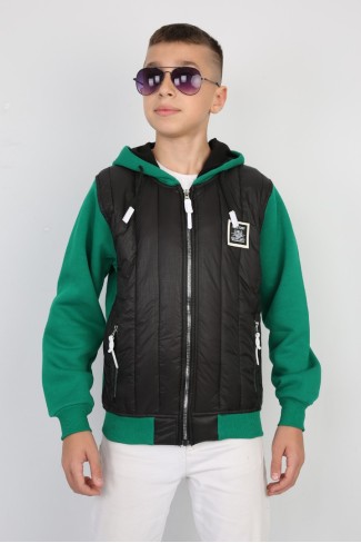 Üç İplik Kapşonlu Fermuarlı Baskılı Yeşil Sweat