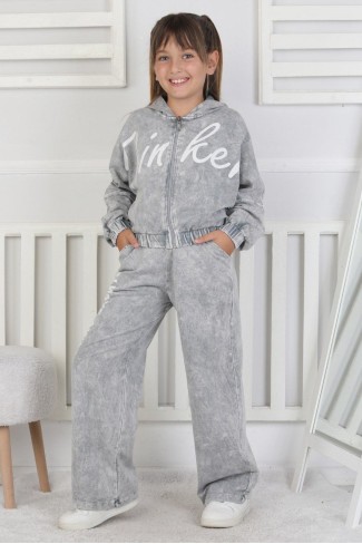 Yıkamalı Kapüşonlu Baskılı Kız Çocuk Takım