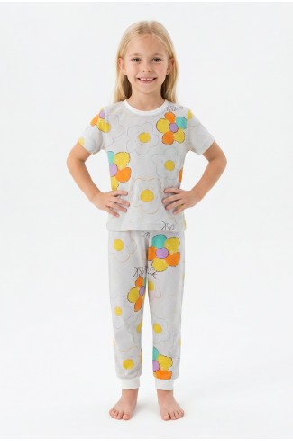 · Kız çocuk renkli papatya çiçek desenli pijama takımı %100 pamuk süprem kumaşı ile yumuşak ve konforlu kullanım sunar;