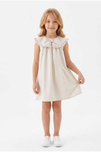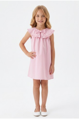 Kız Çocuk %100 Pamuk Poplin Kumaş Ön Fiyonklu Yaka Fırfırlı Astarlı Arkası Düğmeli Sıfır Kol Elbise