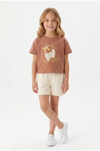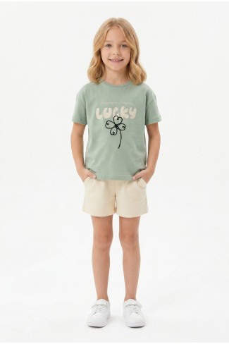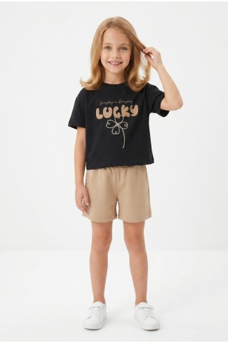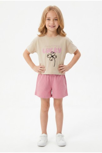 Kız Çocuk %100 Pamuk Lucky Baskılı Süprem Tişört Alt İki İplik Cepli Şortlu Takım