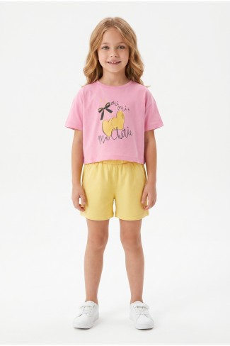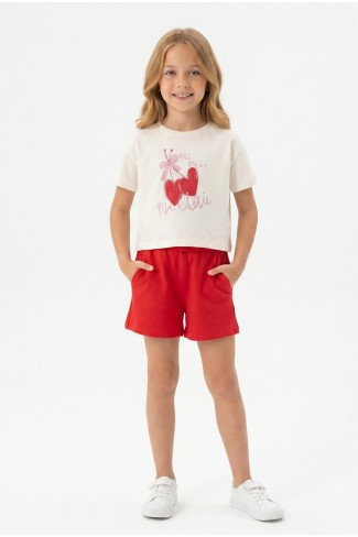 Kız Çocuk %100 Pamuk Ön Kiraz Kalp Baskılı Süprem Tişört Alt İki İplik Cepli Şortlu Takım