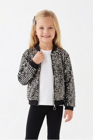 • Kız çocuk payetli bomber ceket, şık tasarımıyla özel gün kombinlerine uyum sağlar.;
