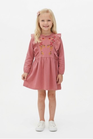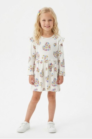 · Kız çocuk çiçek ve kalp desenli fırfır detaylı uzun kollu fitilli elbise, şık ve sevimli tasarımıyla öne çıkar;