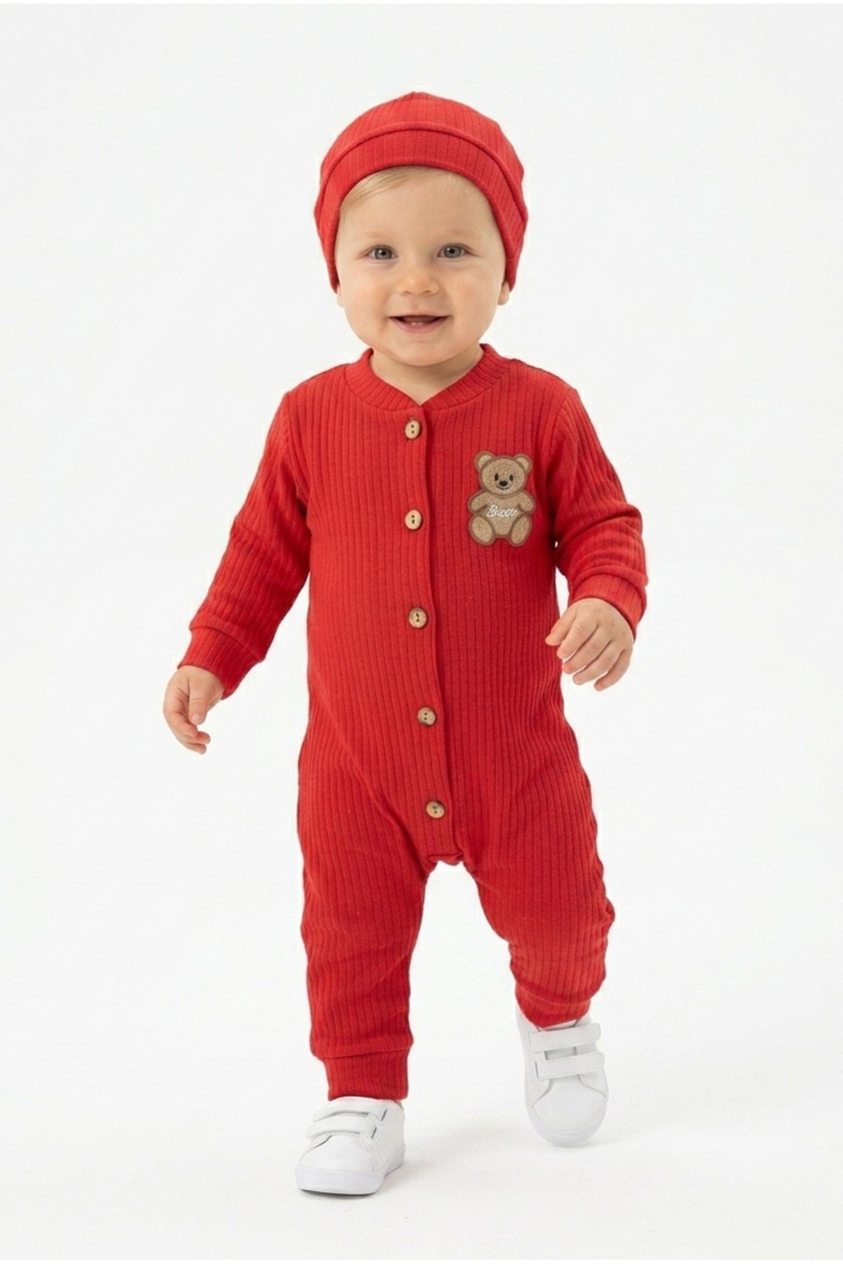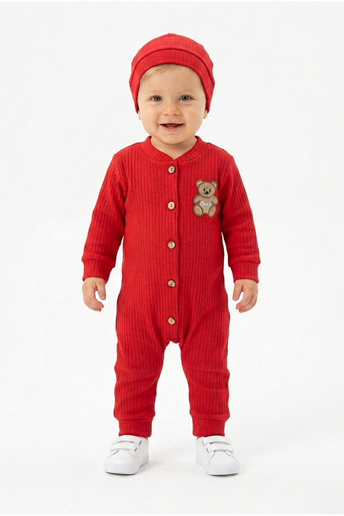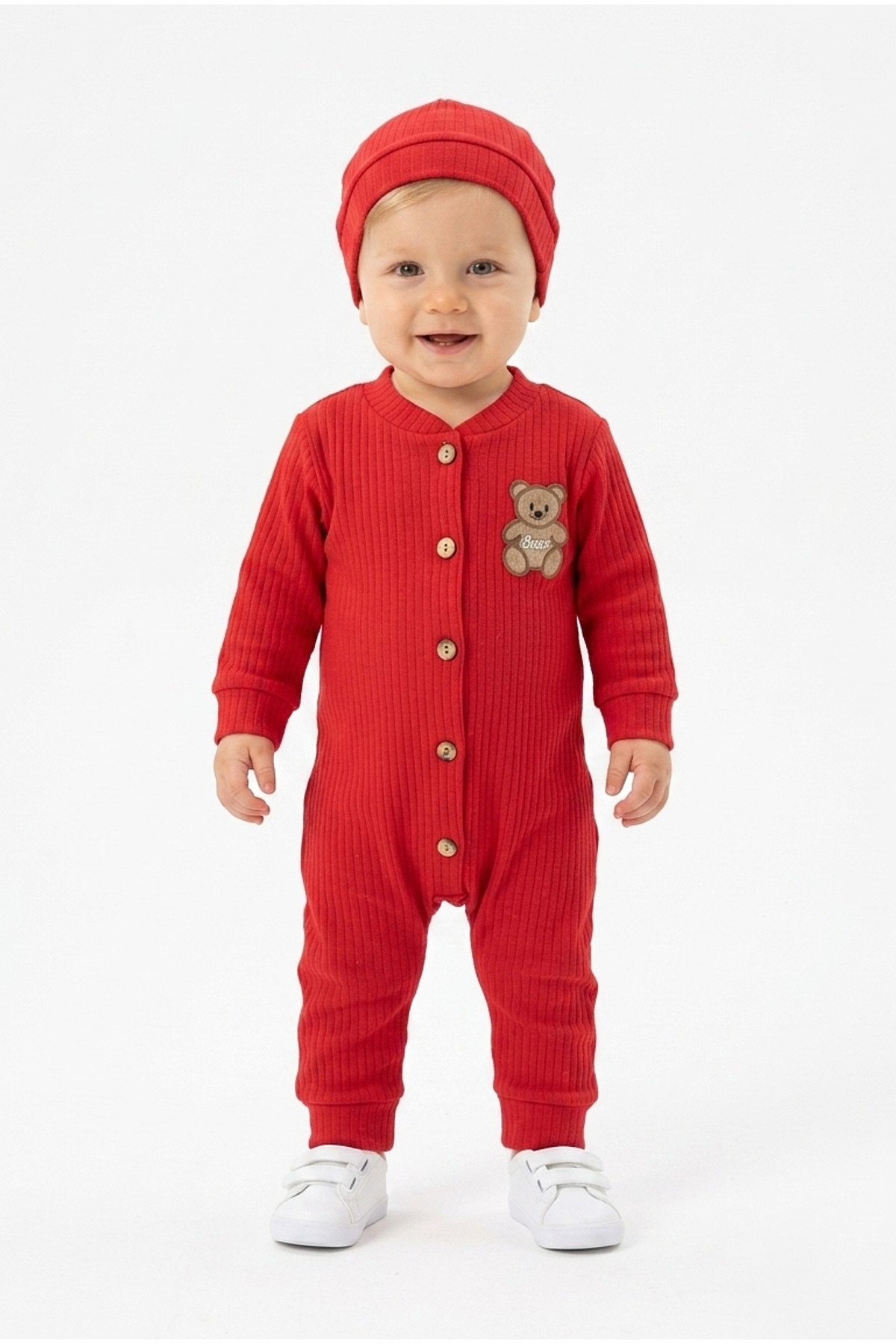 Şardonlu Bear Düğmeli Şapkalı Kırmızı Tulum