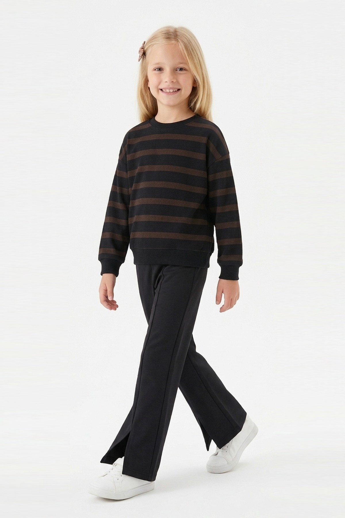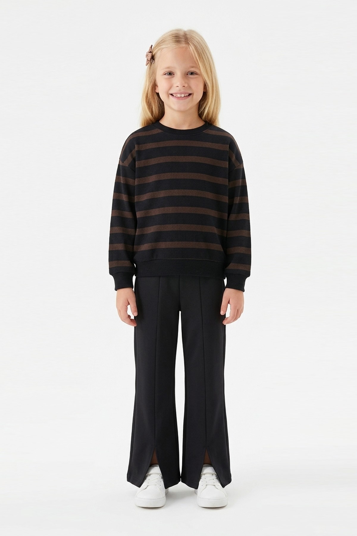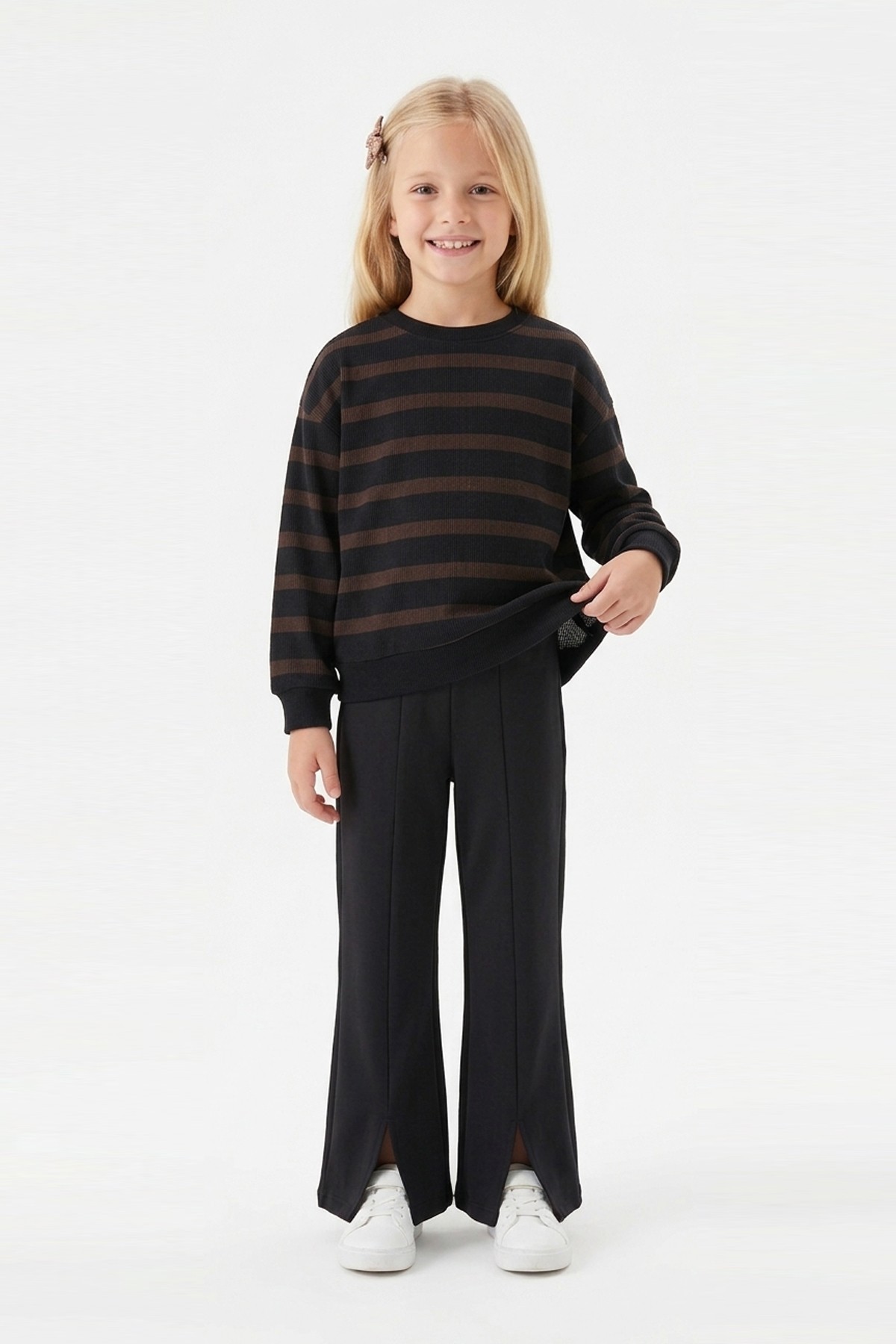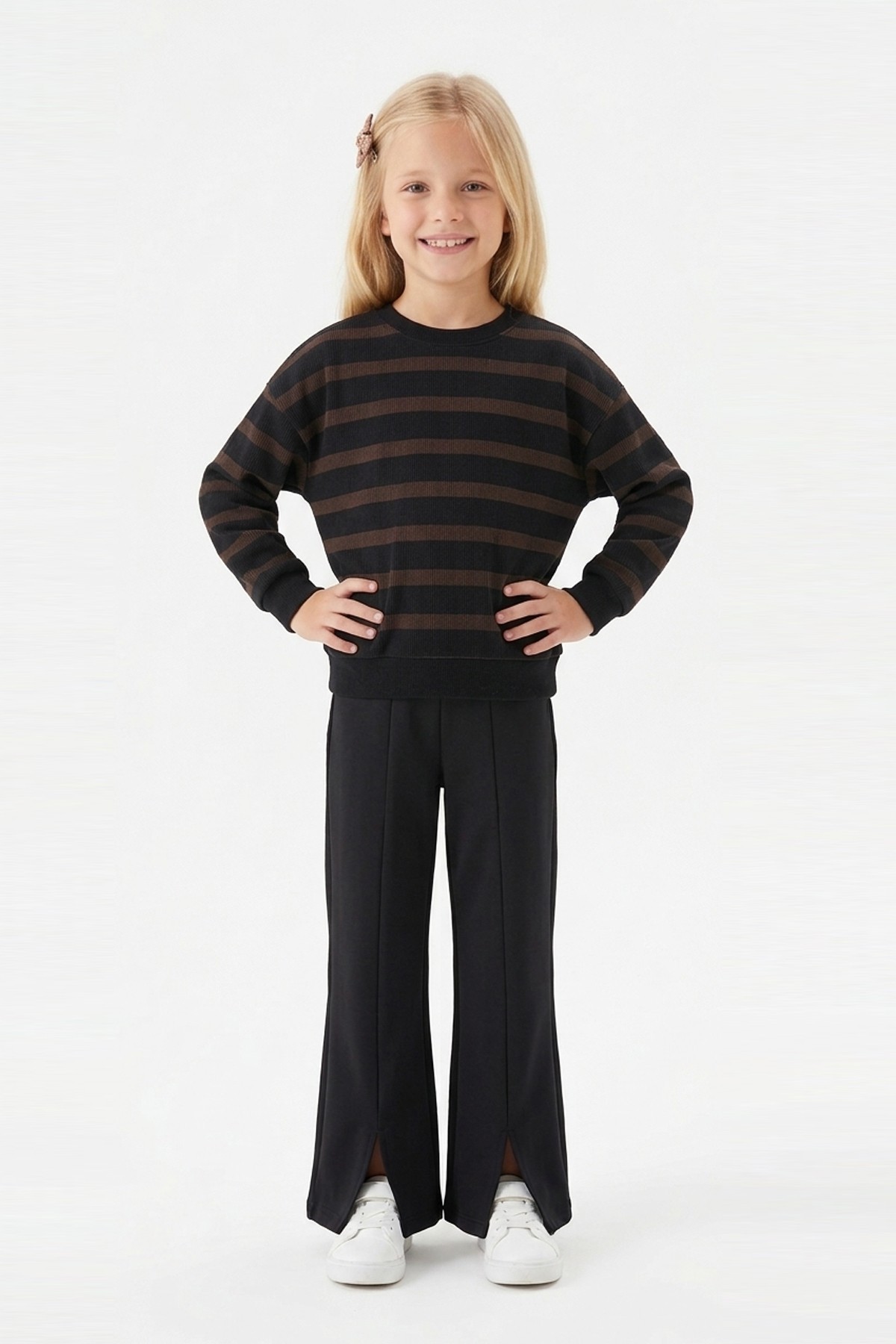 Kız Çocuk İki İplik Çizgili Sweatshirt ve İspanyol Paça Pantolon Takımı