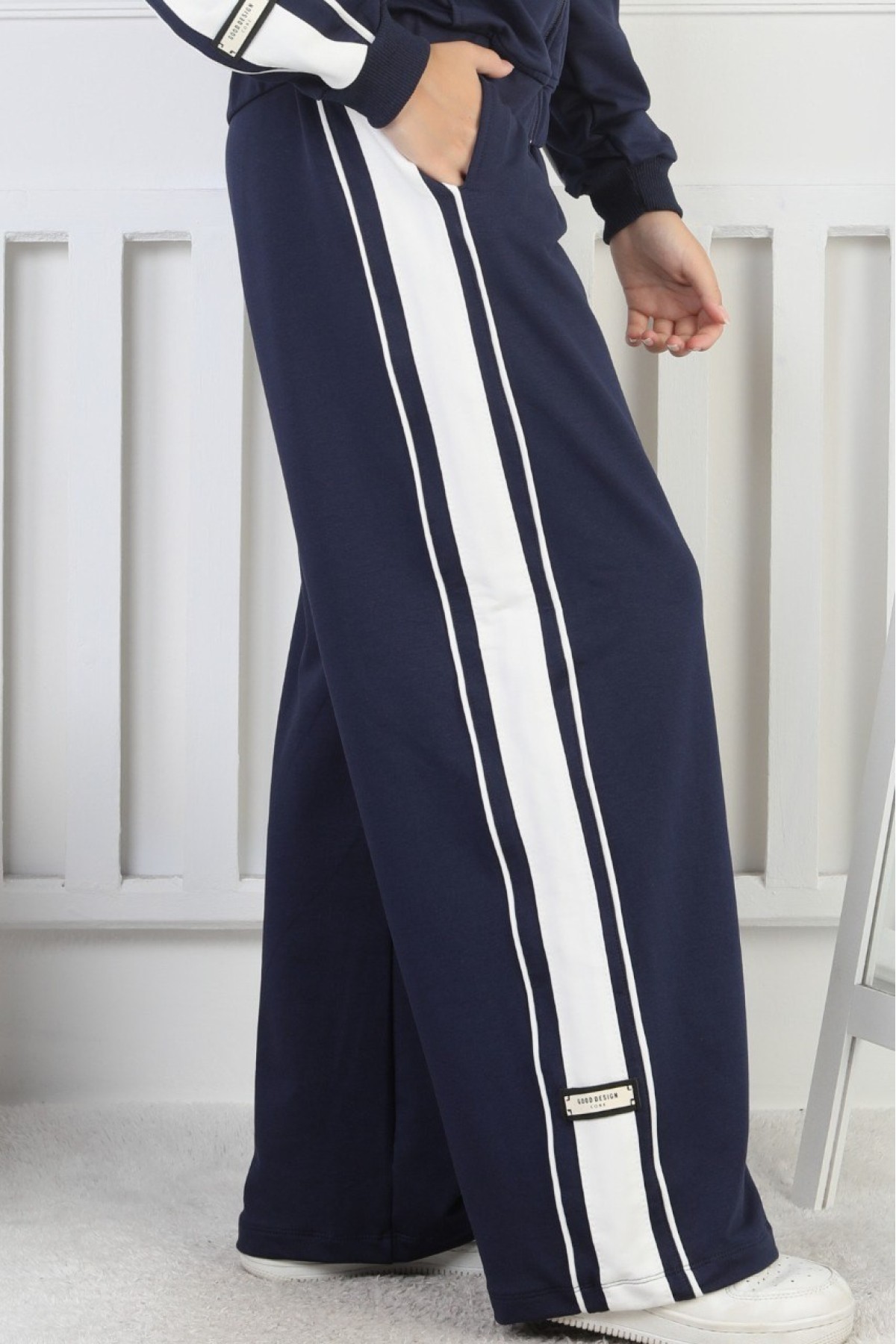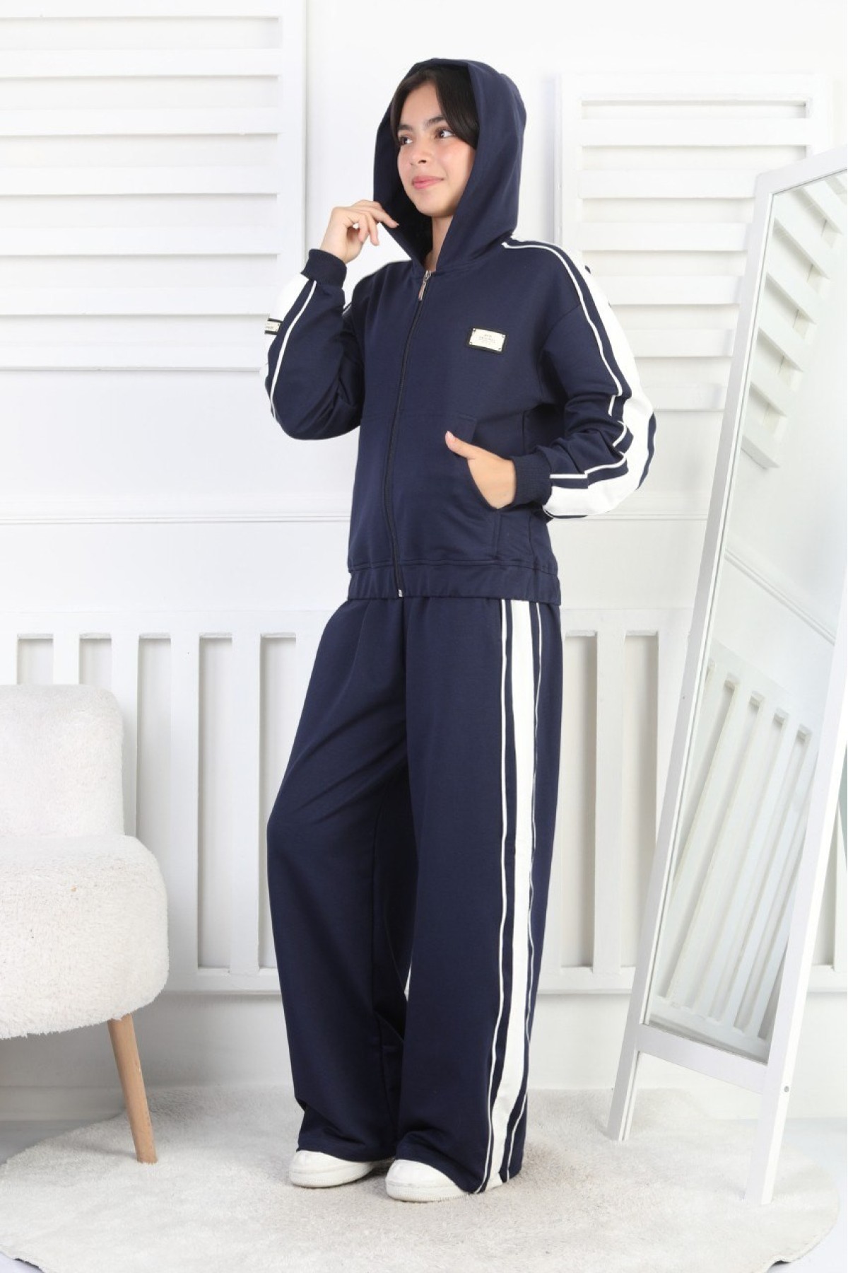 İki İplik Çizgili Kapşonlu Fermuarlı Kız Çocuk Takım