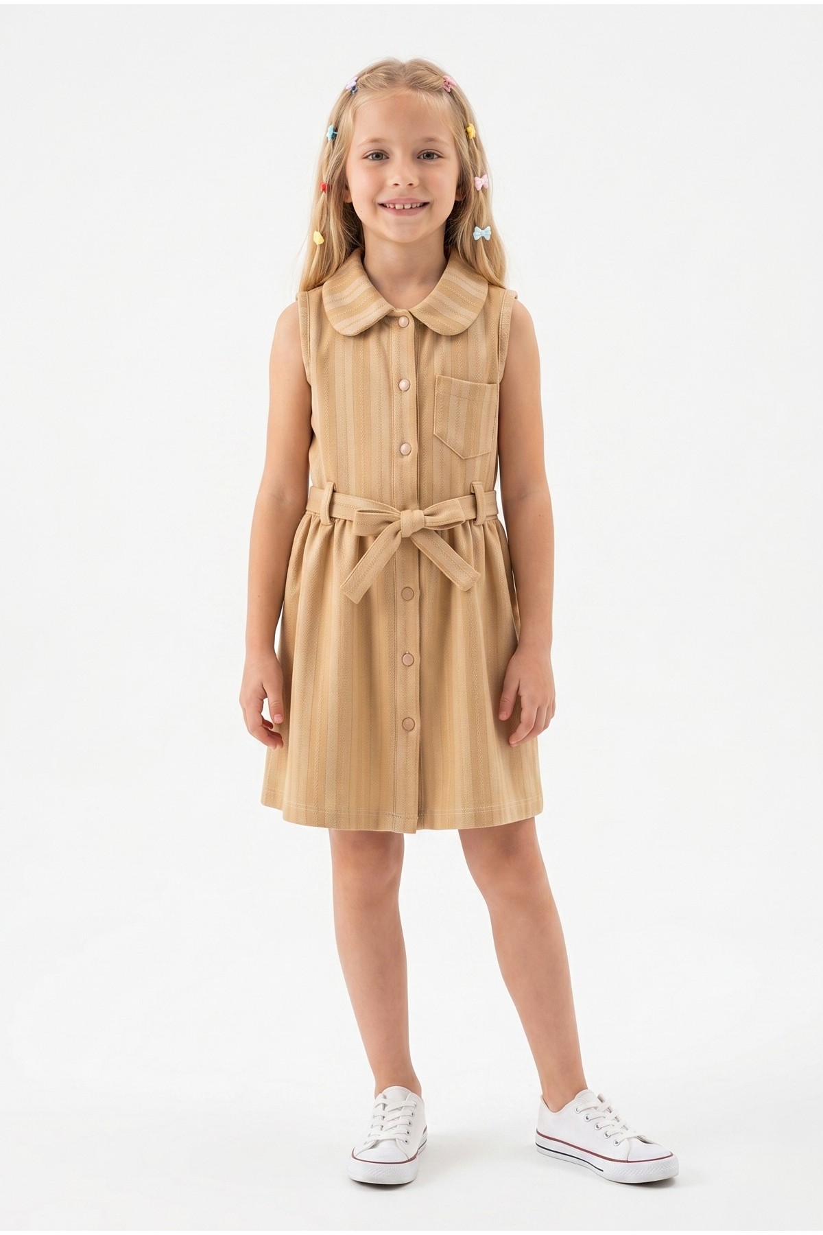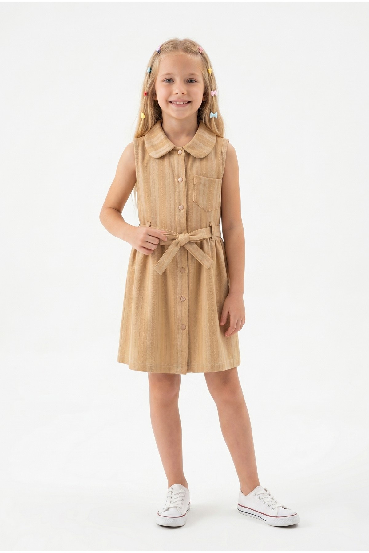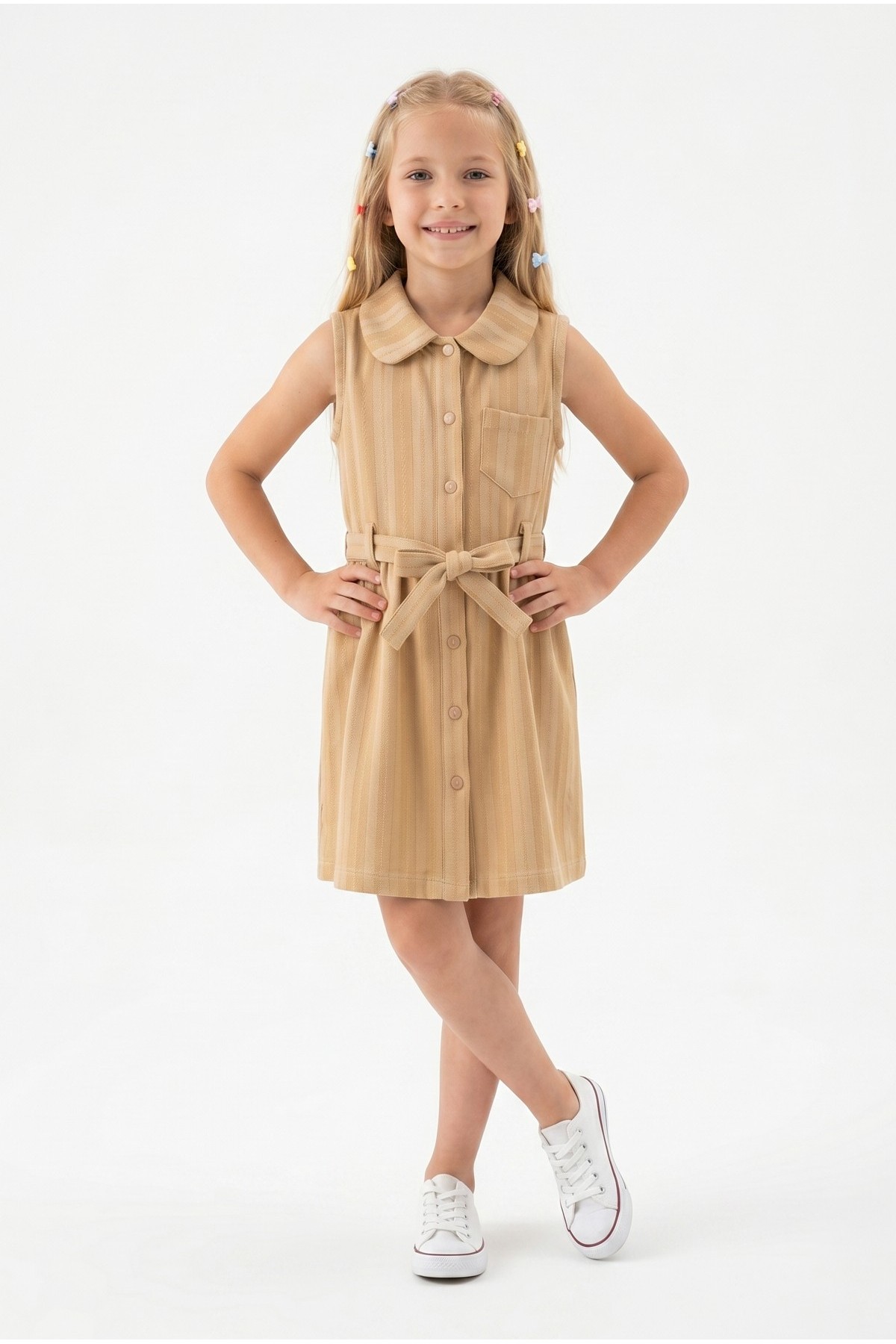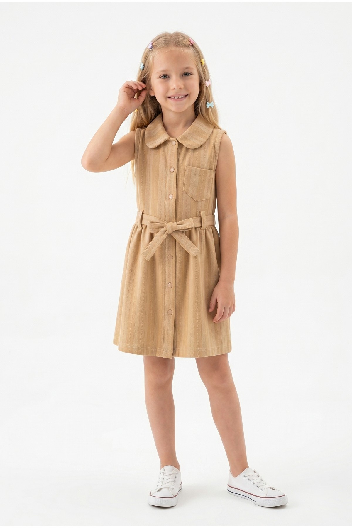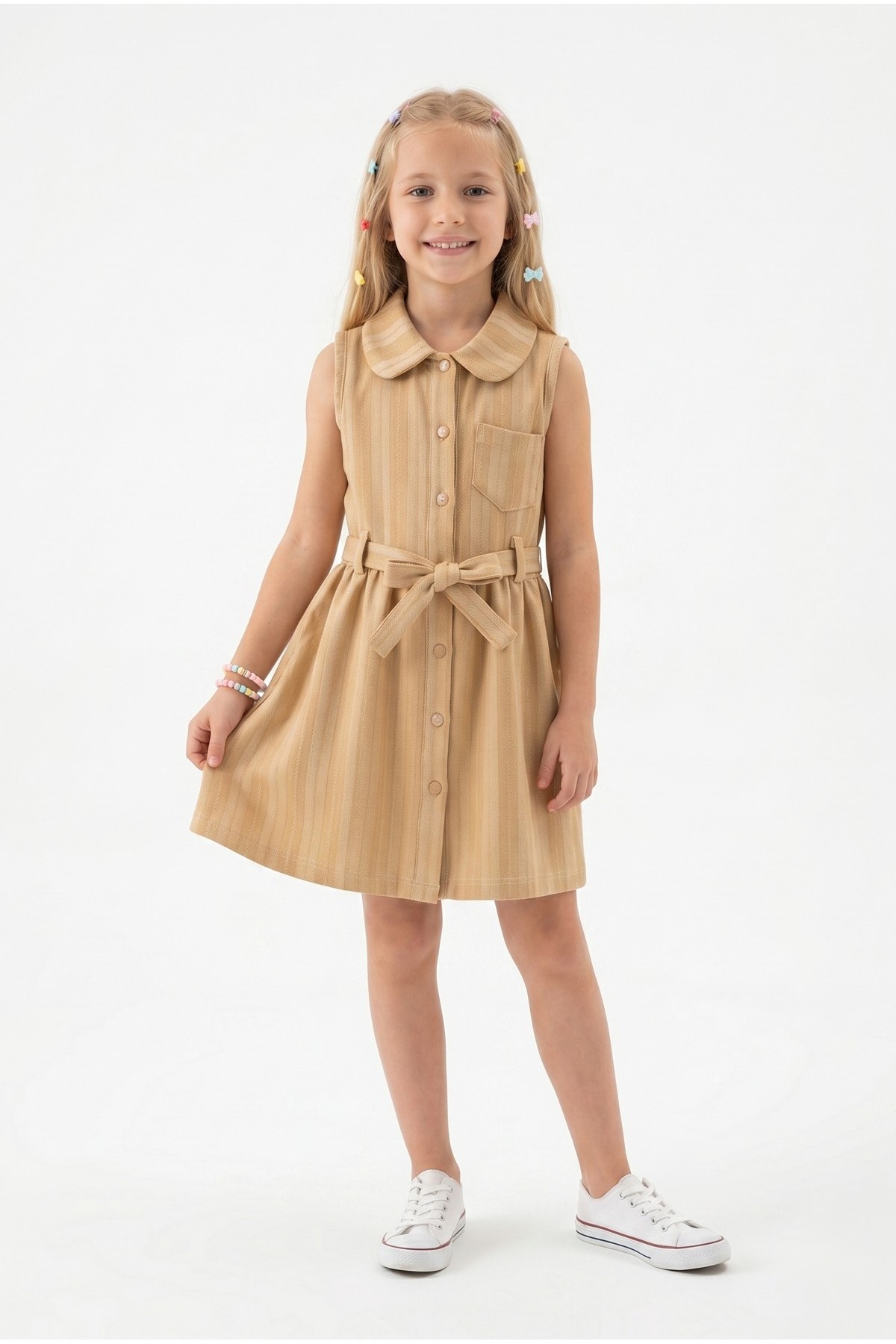 Kız Çocuk Çizgili Kolsuz Bebek Yaka Önden Düğmeli Ve Belden Bağlamalı Pamuklu Yazlık Elbise