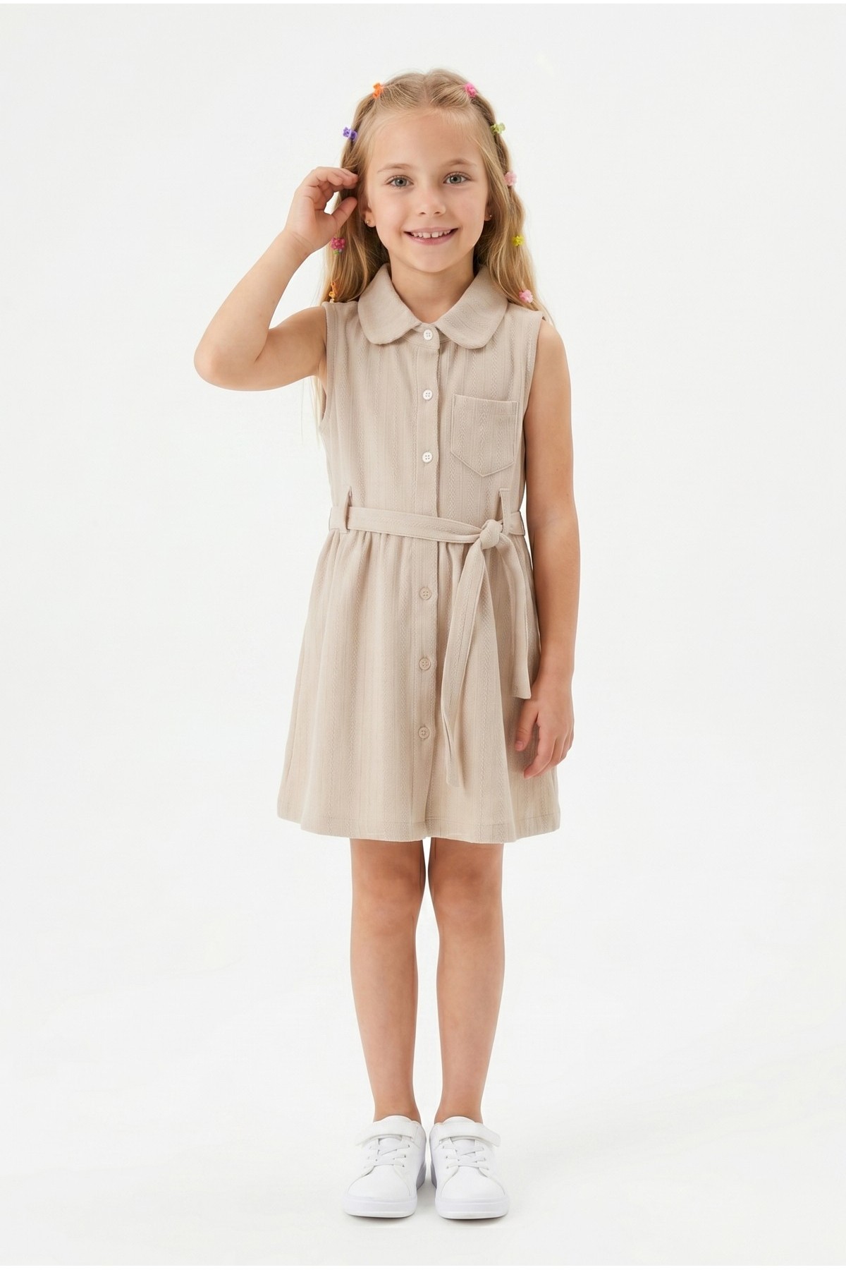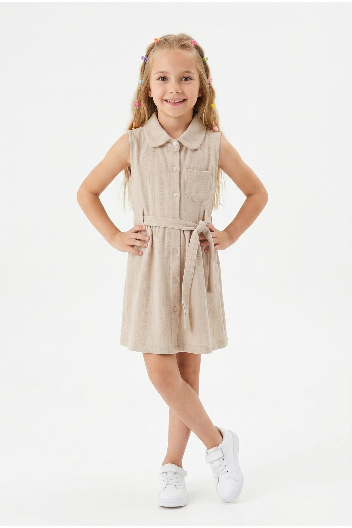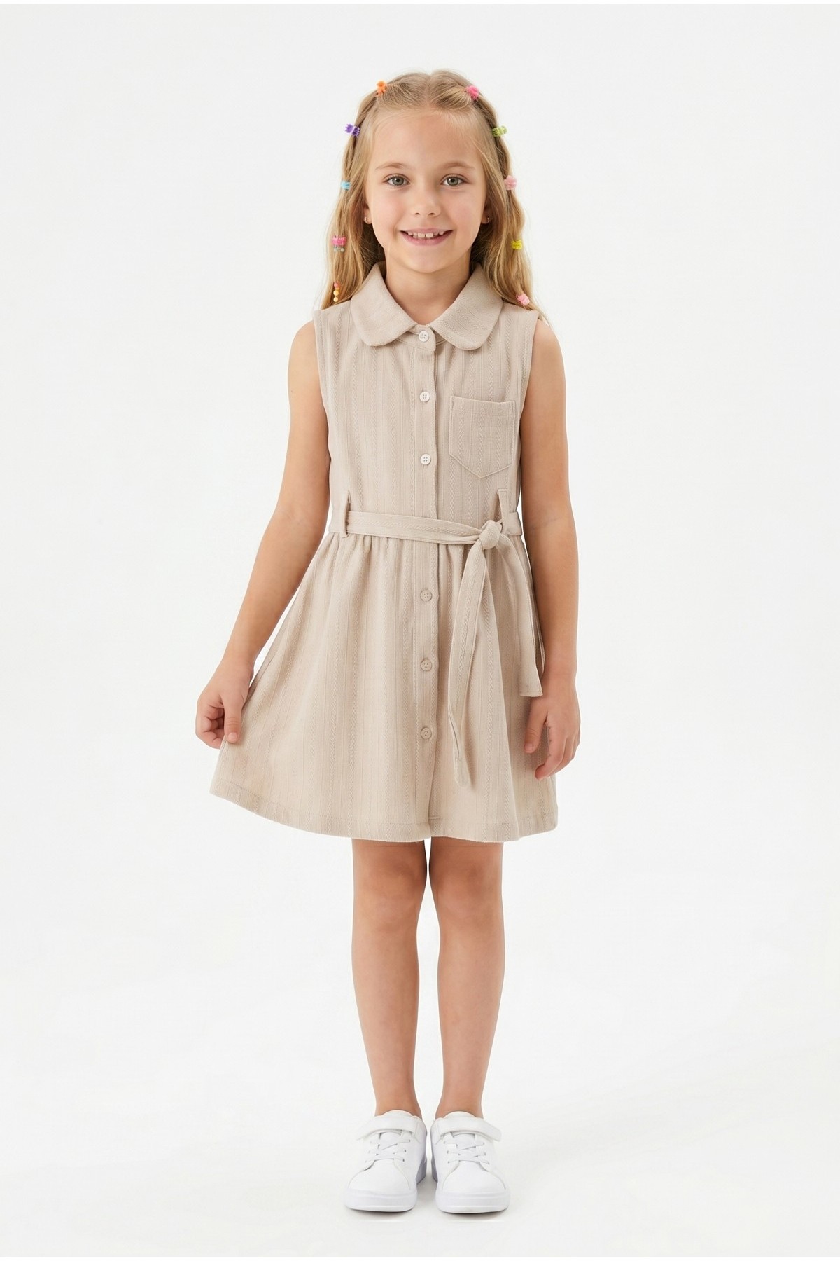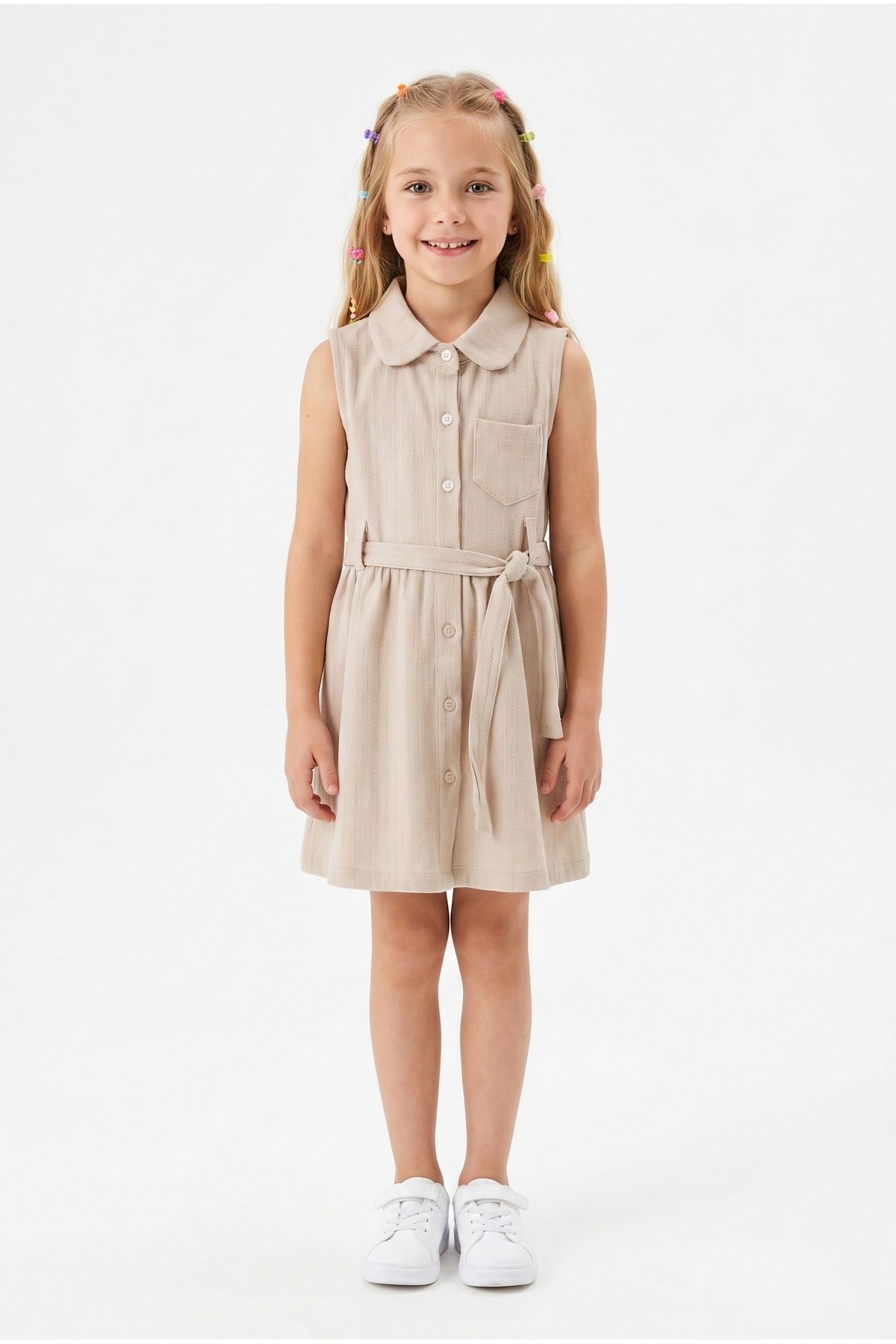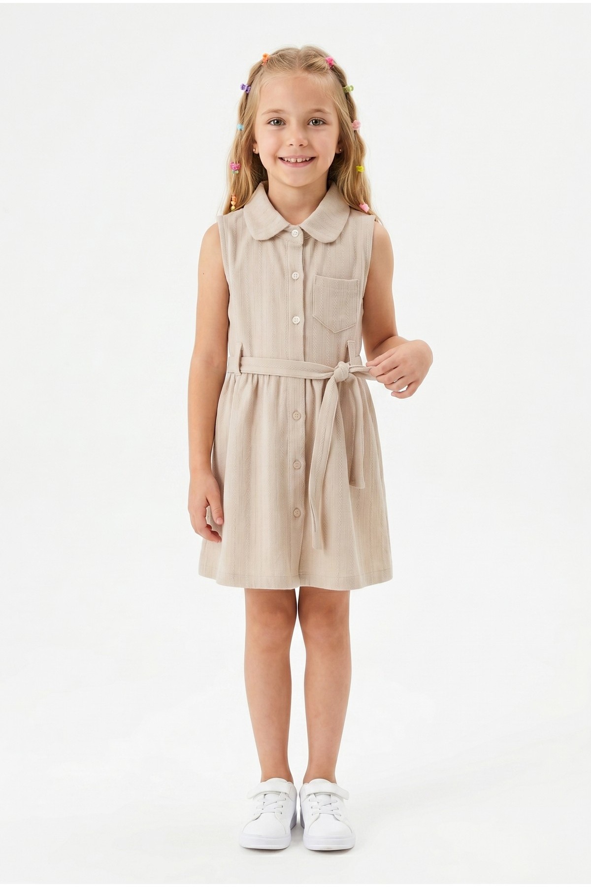 Kız Çocuk Çizgili Kolsuz Bebek Yaka Önden Düğmeli Ve Belden Bağlamalı Pamuklu Yazlık Elbise