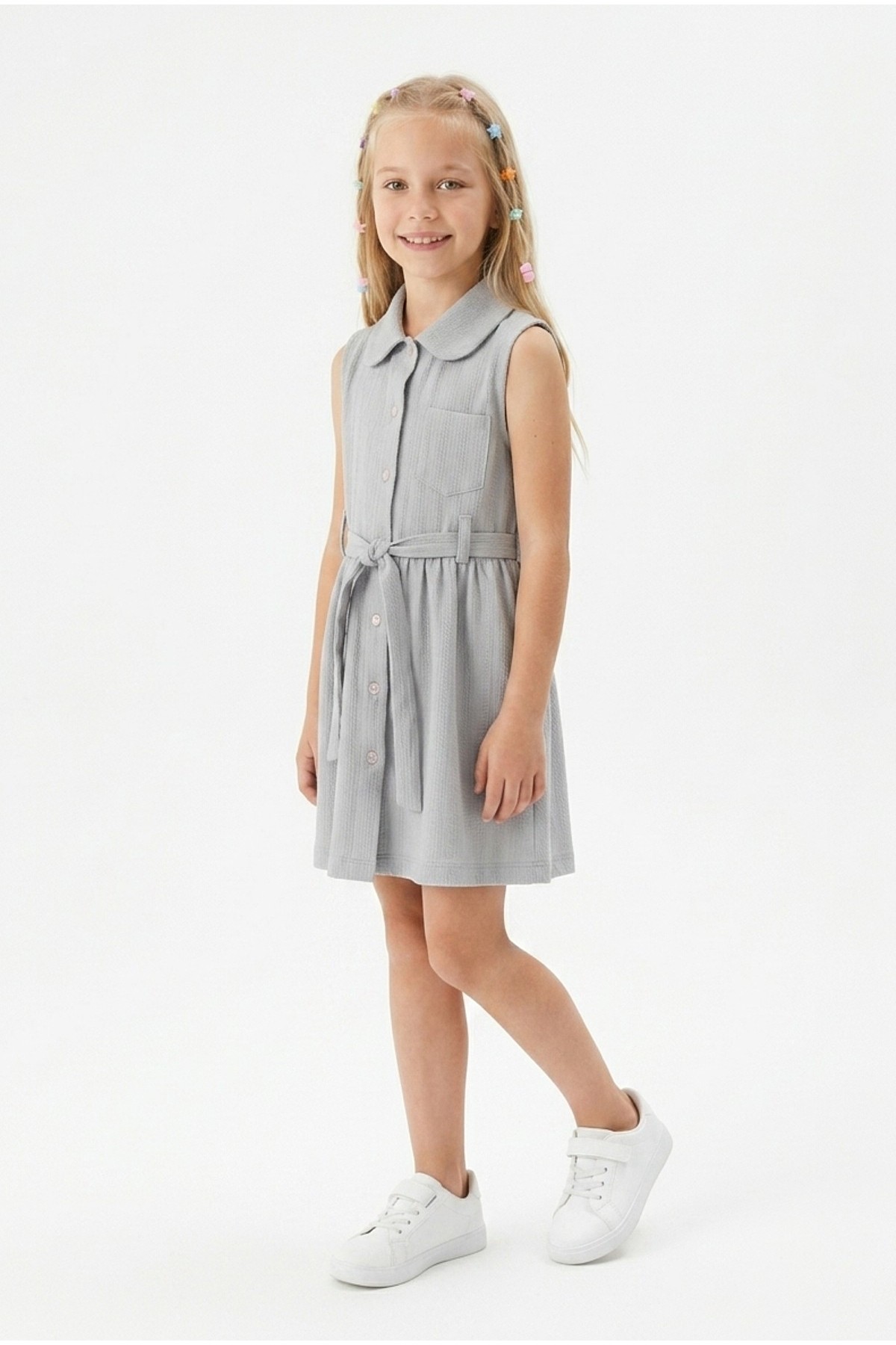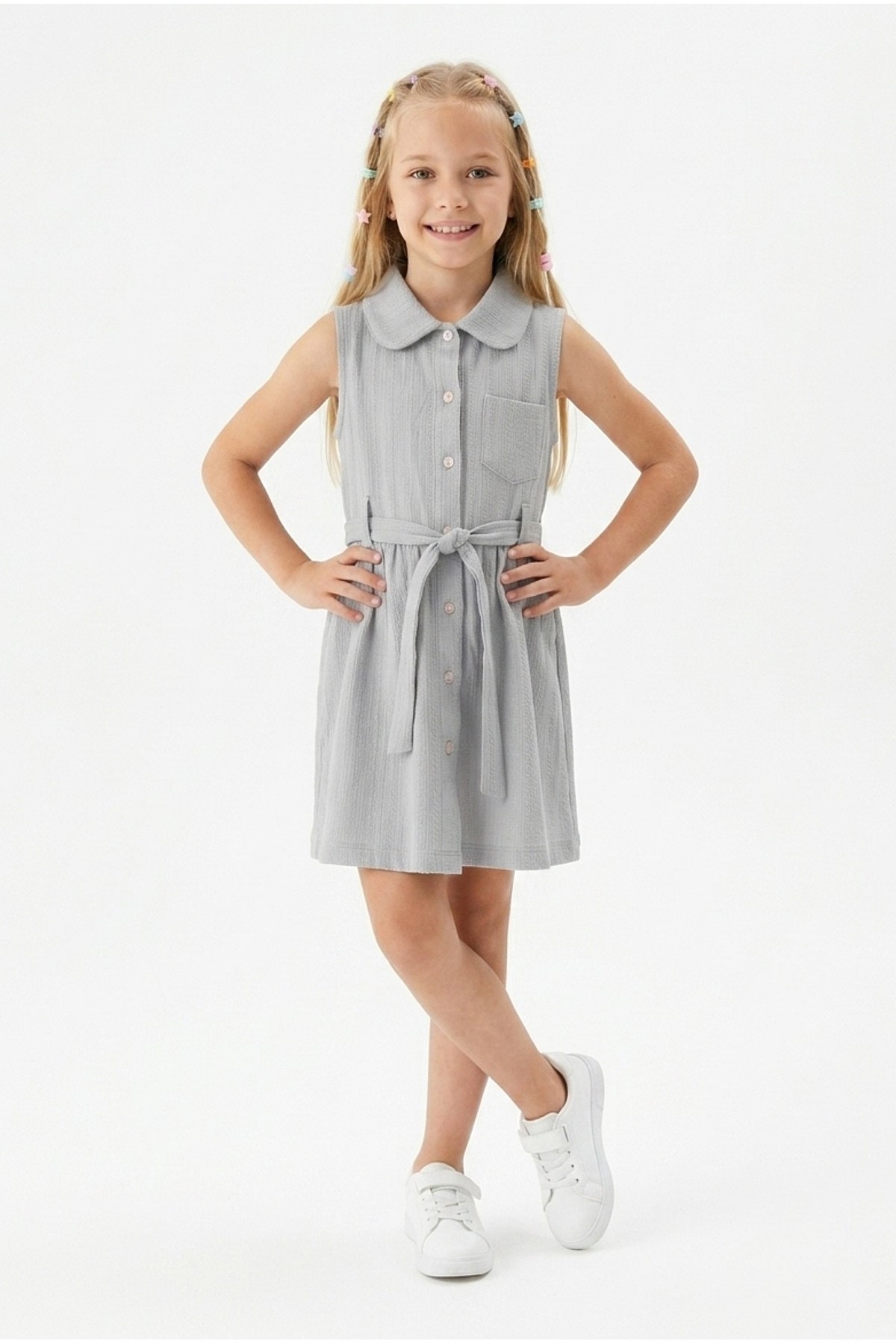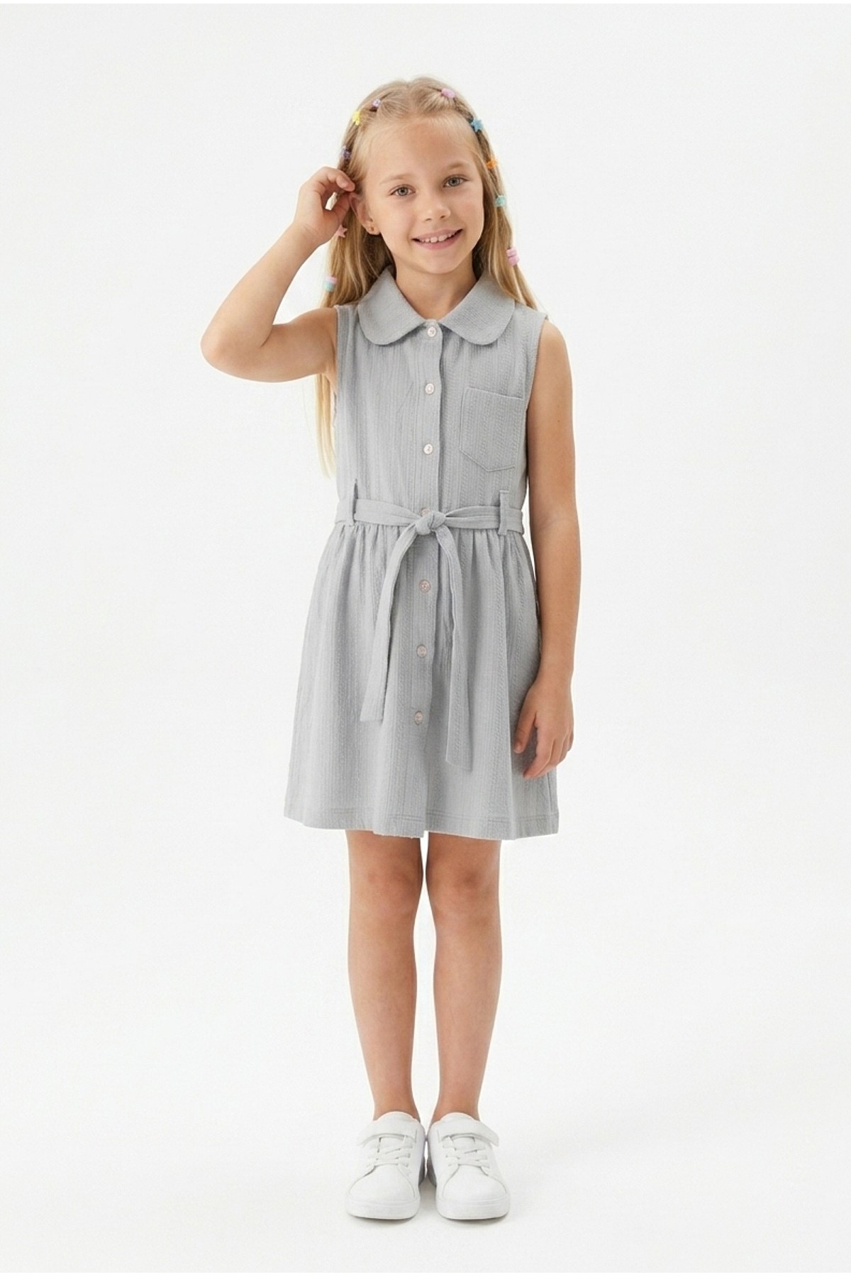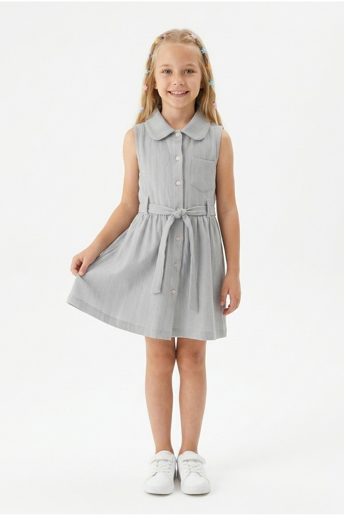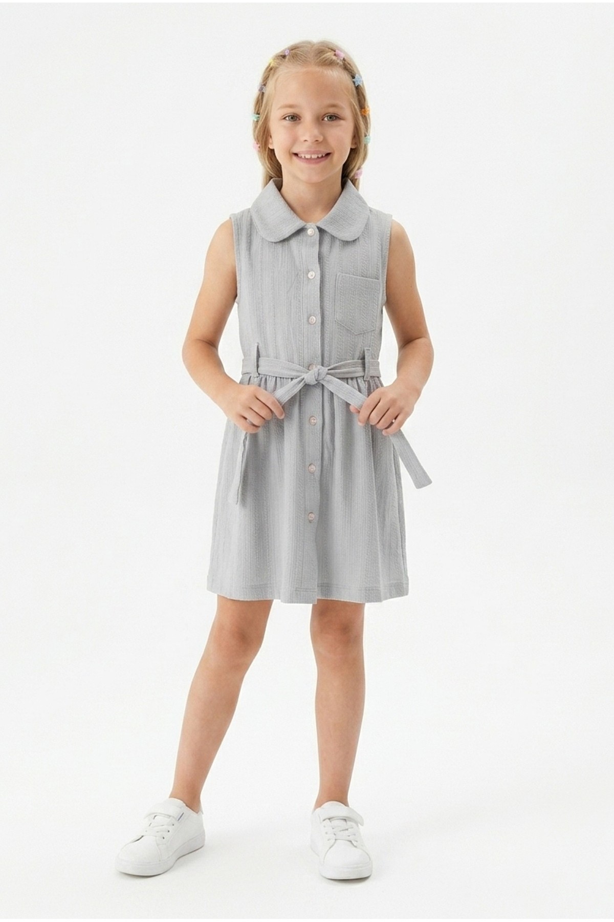 Kız Çocuk Çizgili Kolsuz Bebek Yaka Önden Düğmeli Ve Belden Bağlamalı Pamuklu Yazlık Elbise