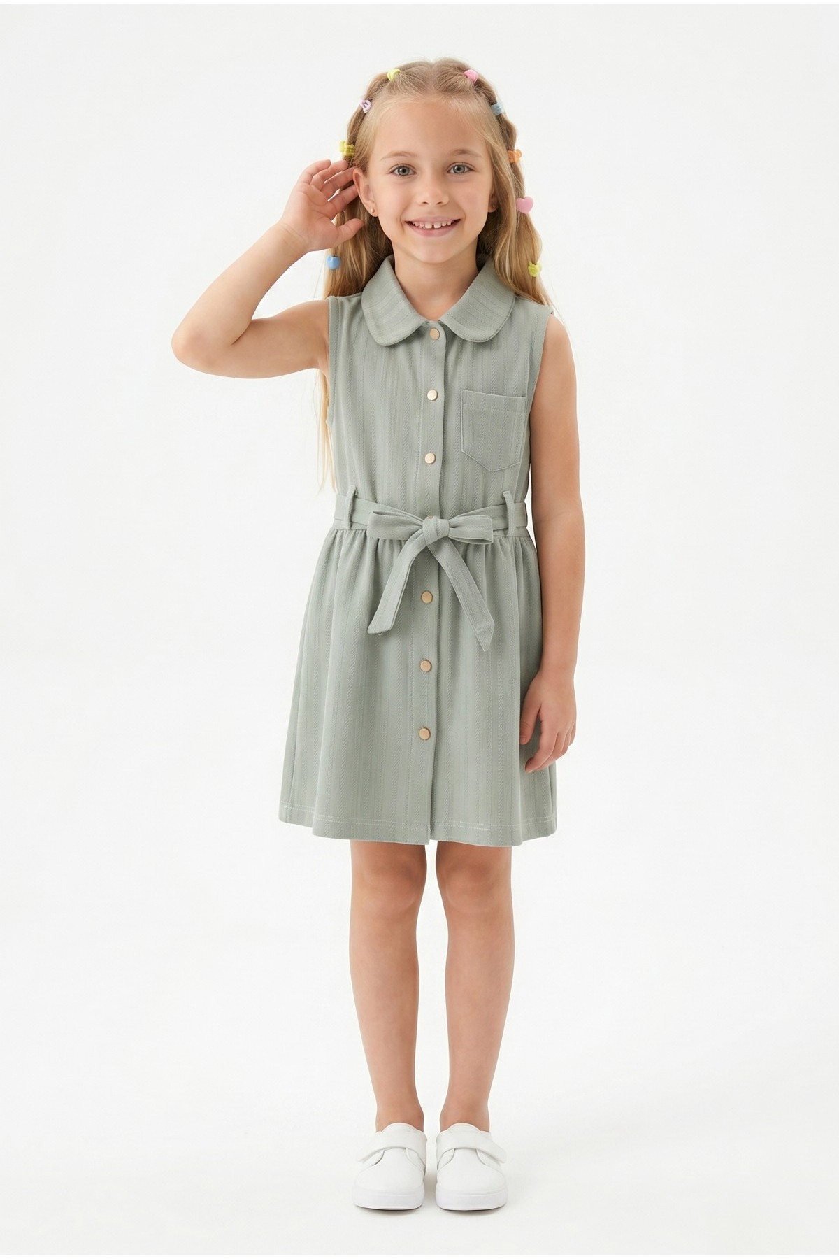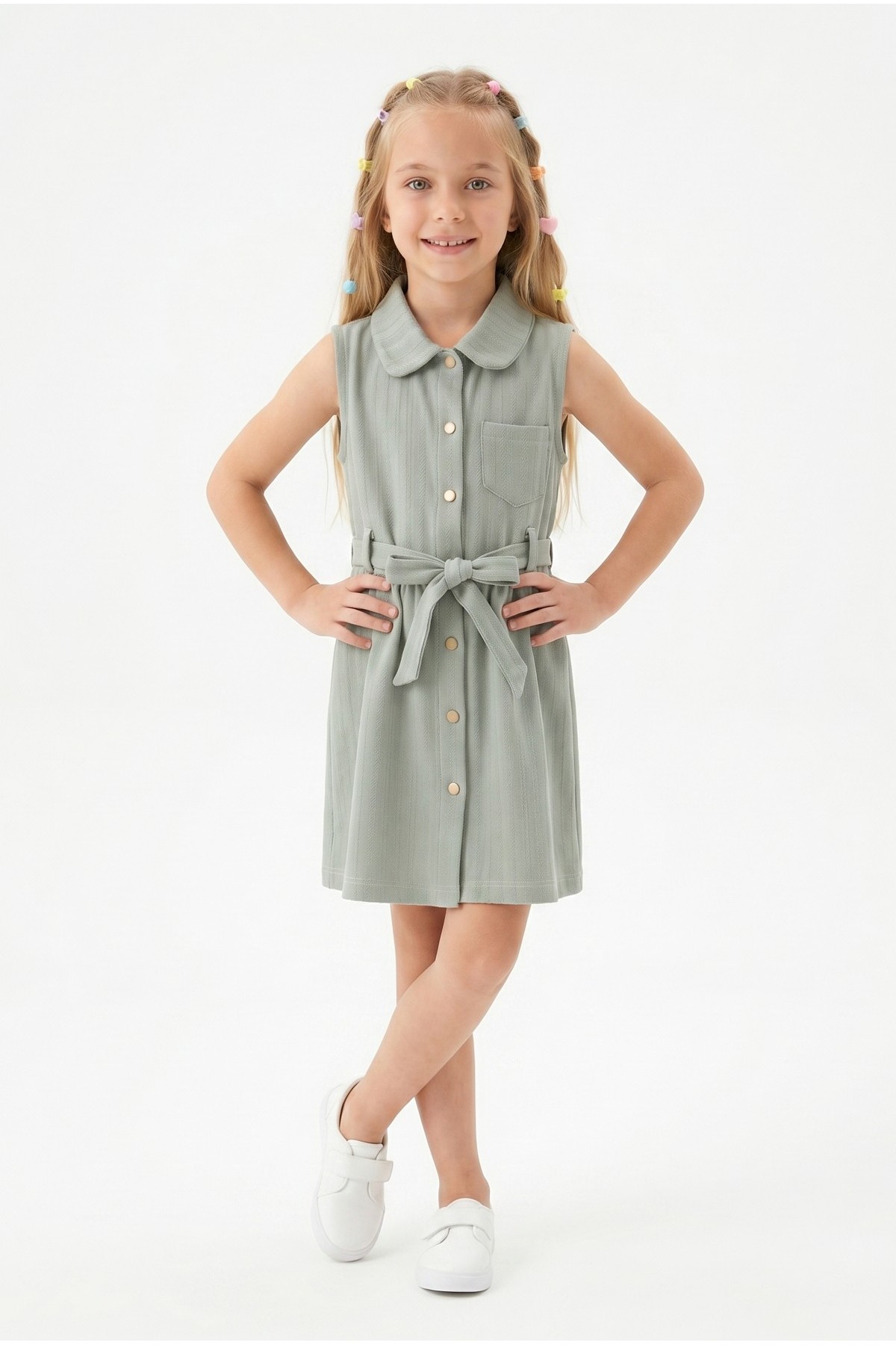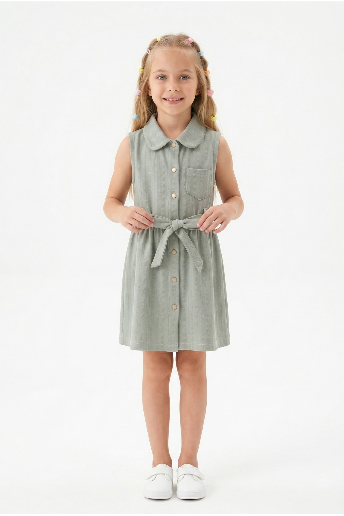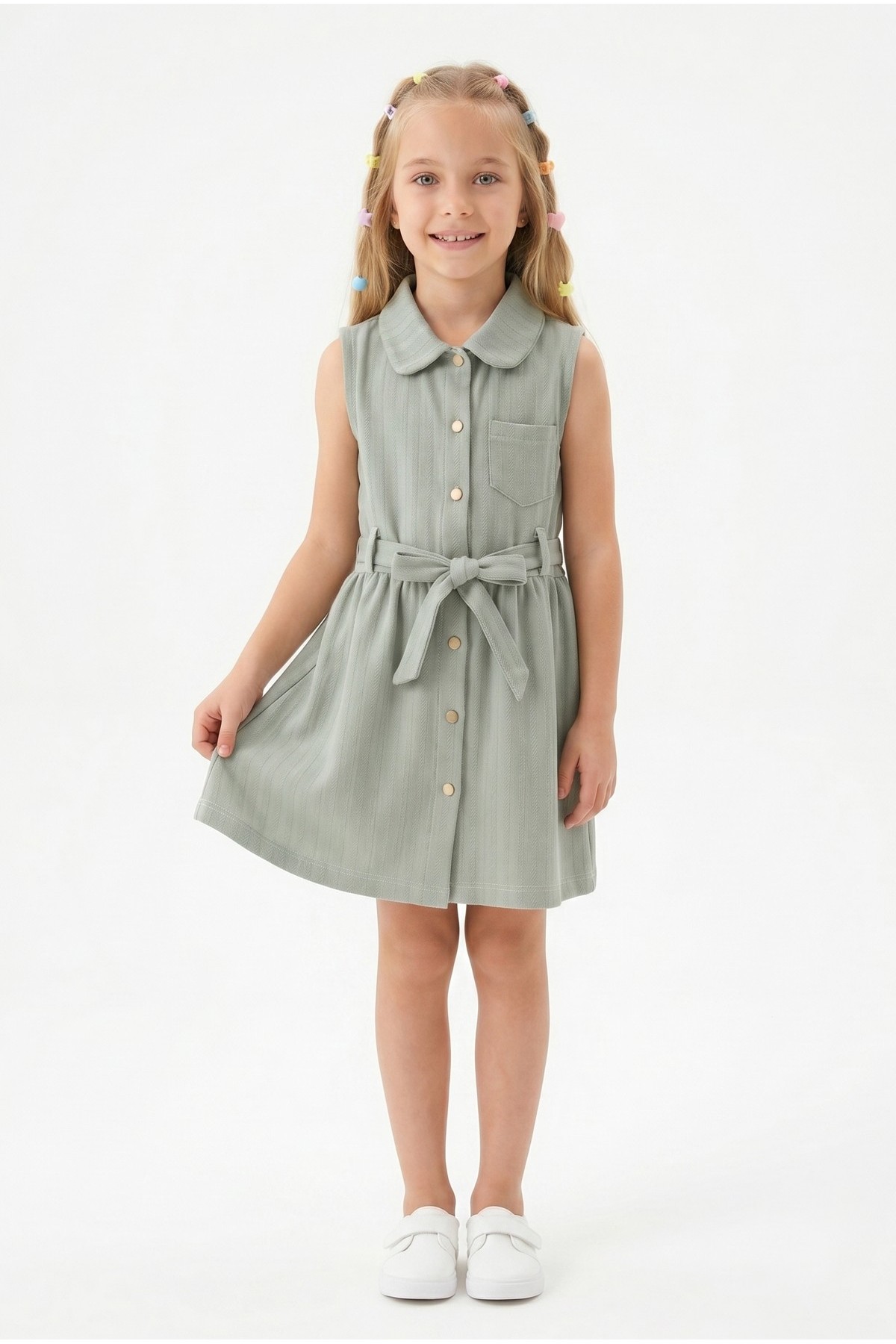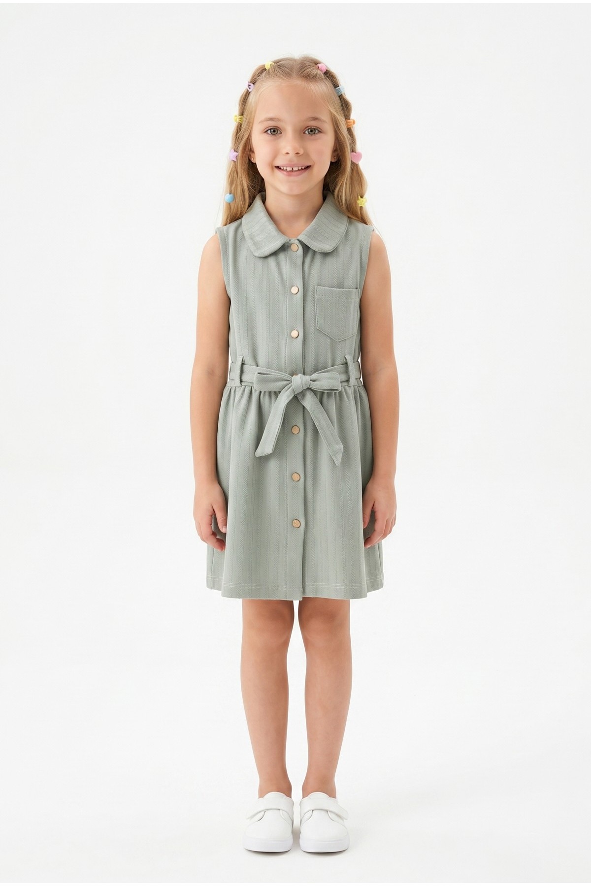 Kız Çocuk Çizgili Kolsuz Bebek Yaka Önden Düğmeli Ve Belden Bağlamalı Pamuklu Yazlık Elbise