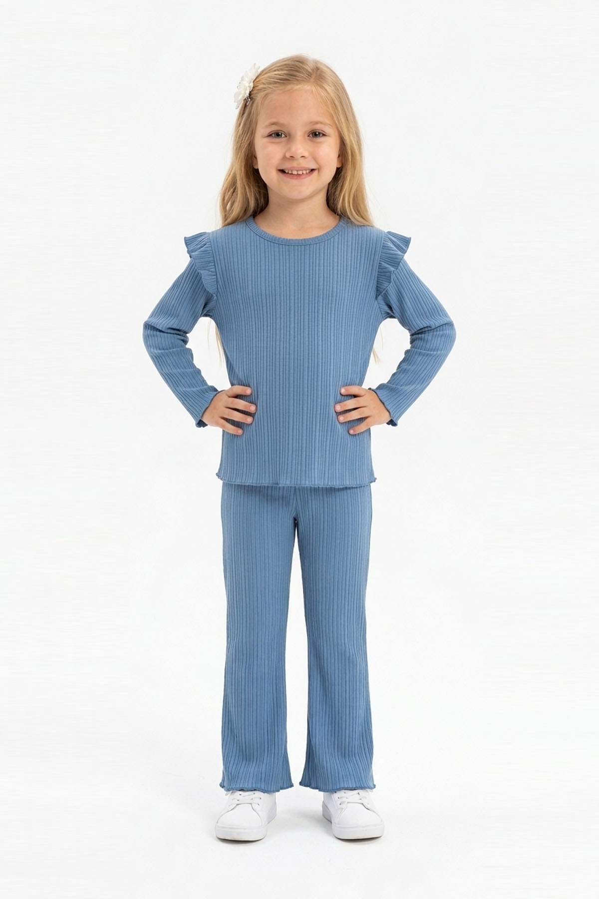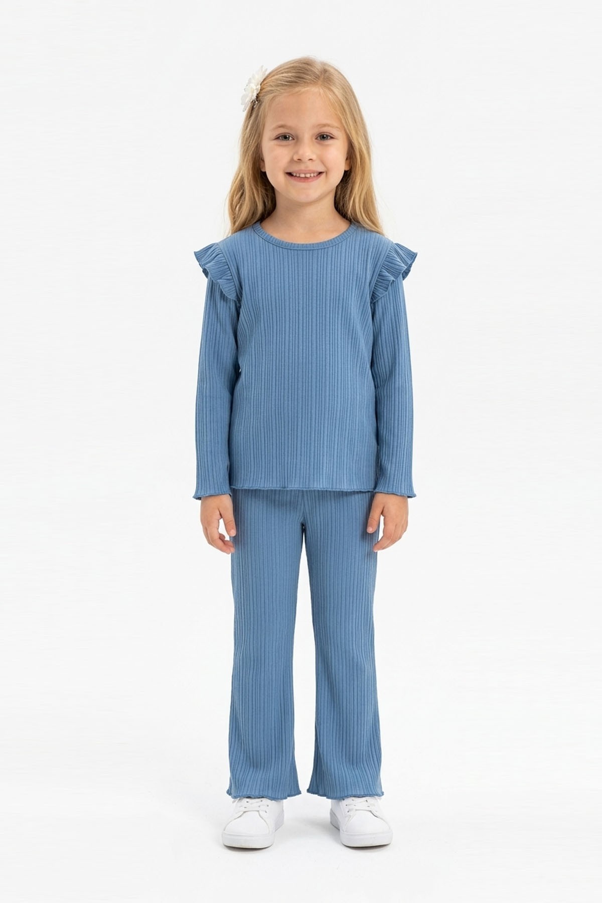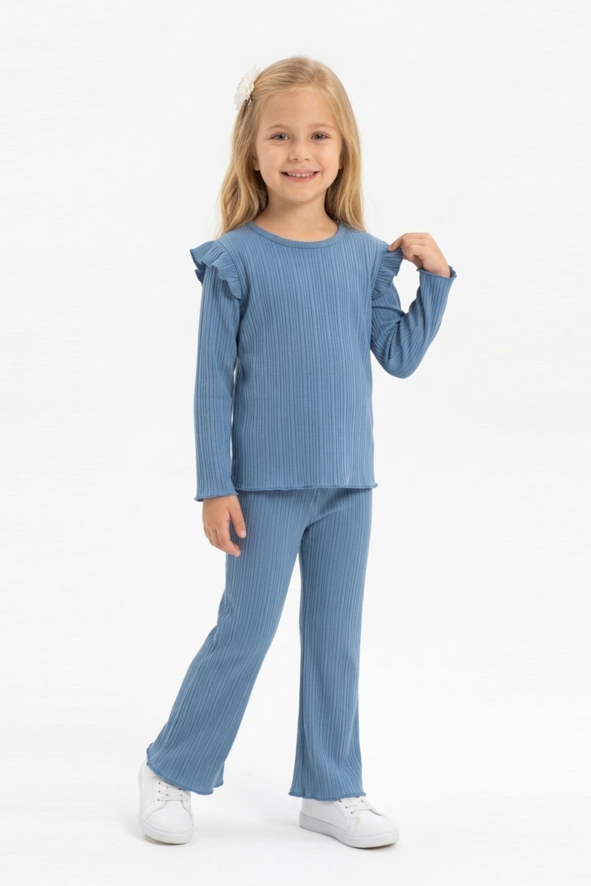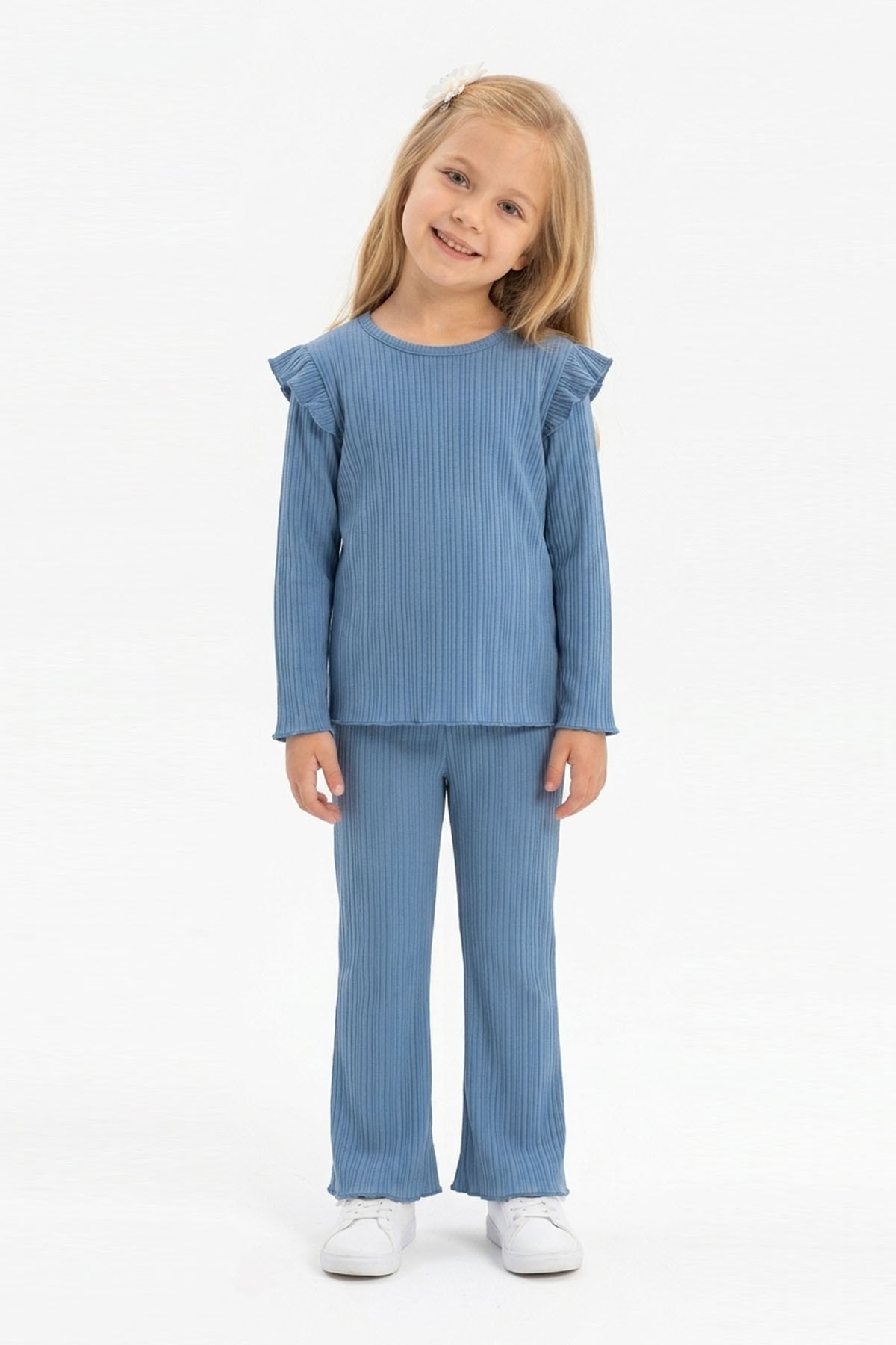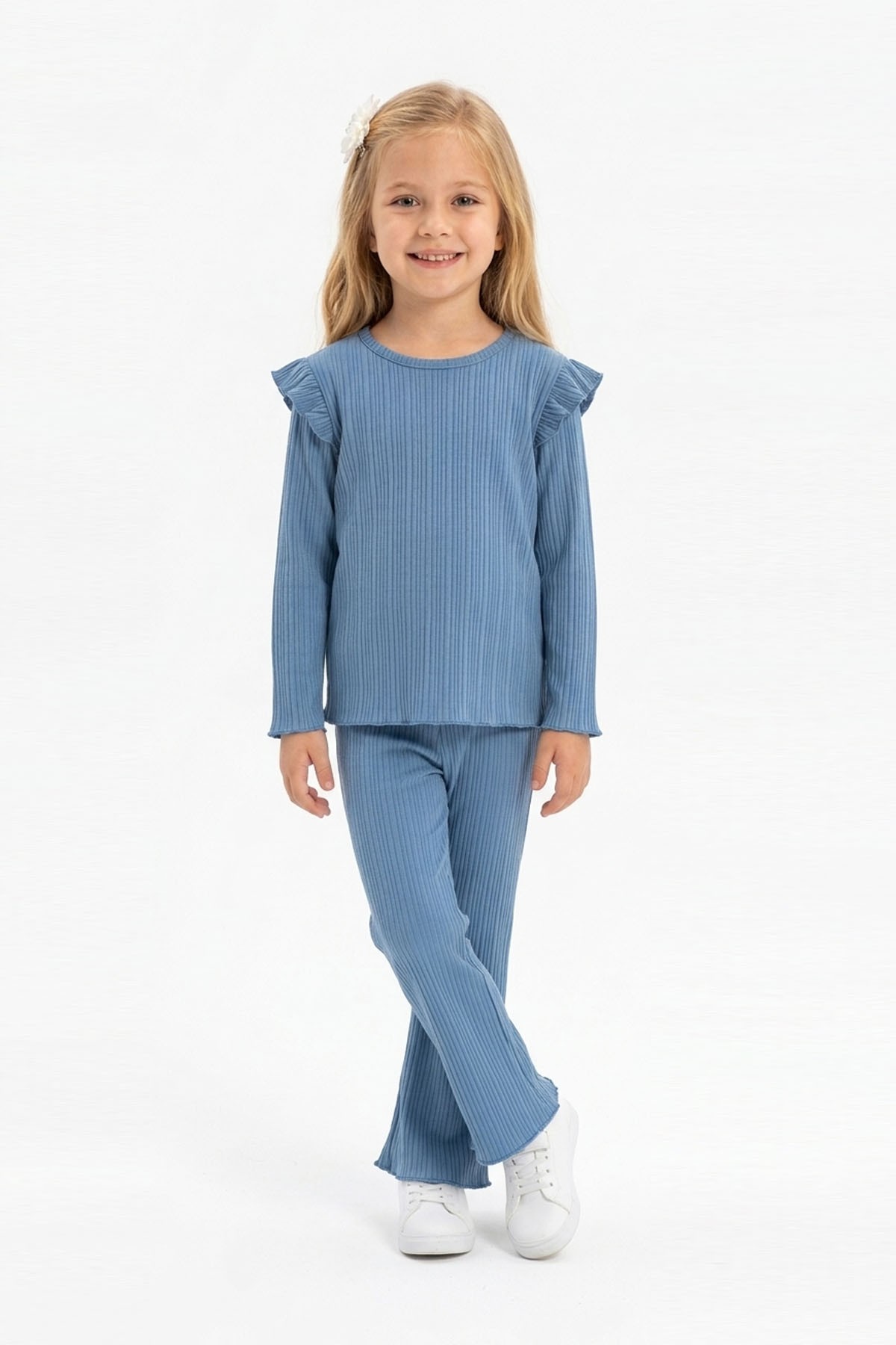 Kız Çocuk Omuz Fırfırlı Fitilli Kumaş Uzun Kollu Tişört Ve İspanyol Paça Pantolon Takım