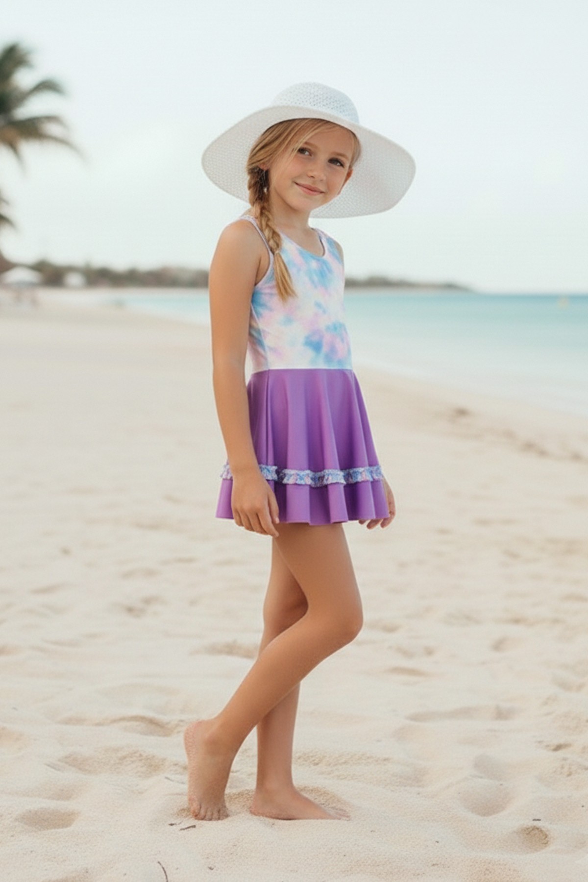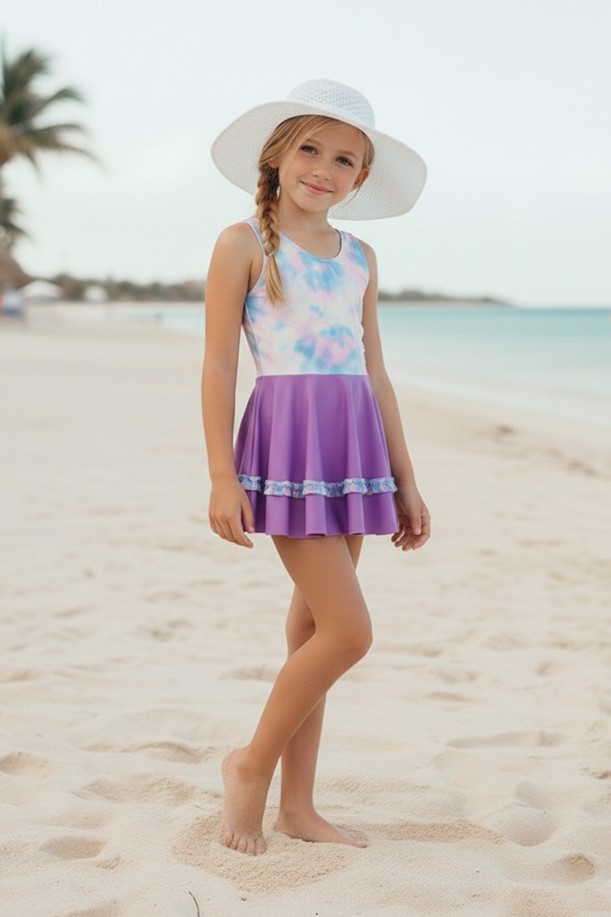 Kız Çocuk Polyester + Elastan Batik Desenli ve Fırfır Detaylı Etekli Kalın Askılı Şık Tasarım Yüzücü Mayosu