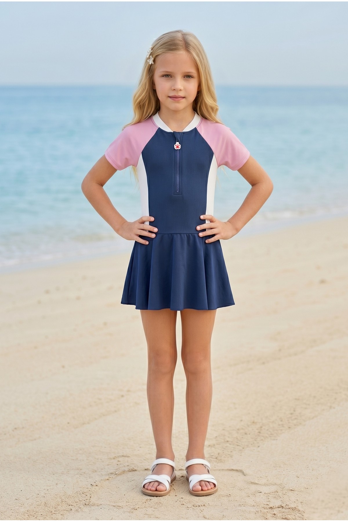 Kız Çocuk Polyester + Elastan Kısa Kollu ve Fermuarlı Etekli Şık Tasarım Elbise Mayo