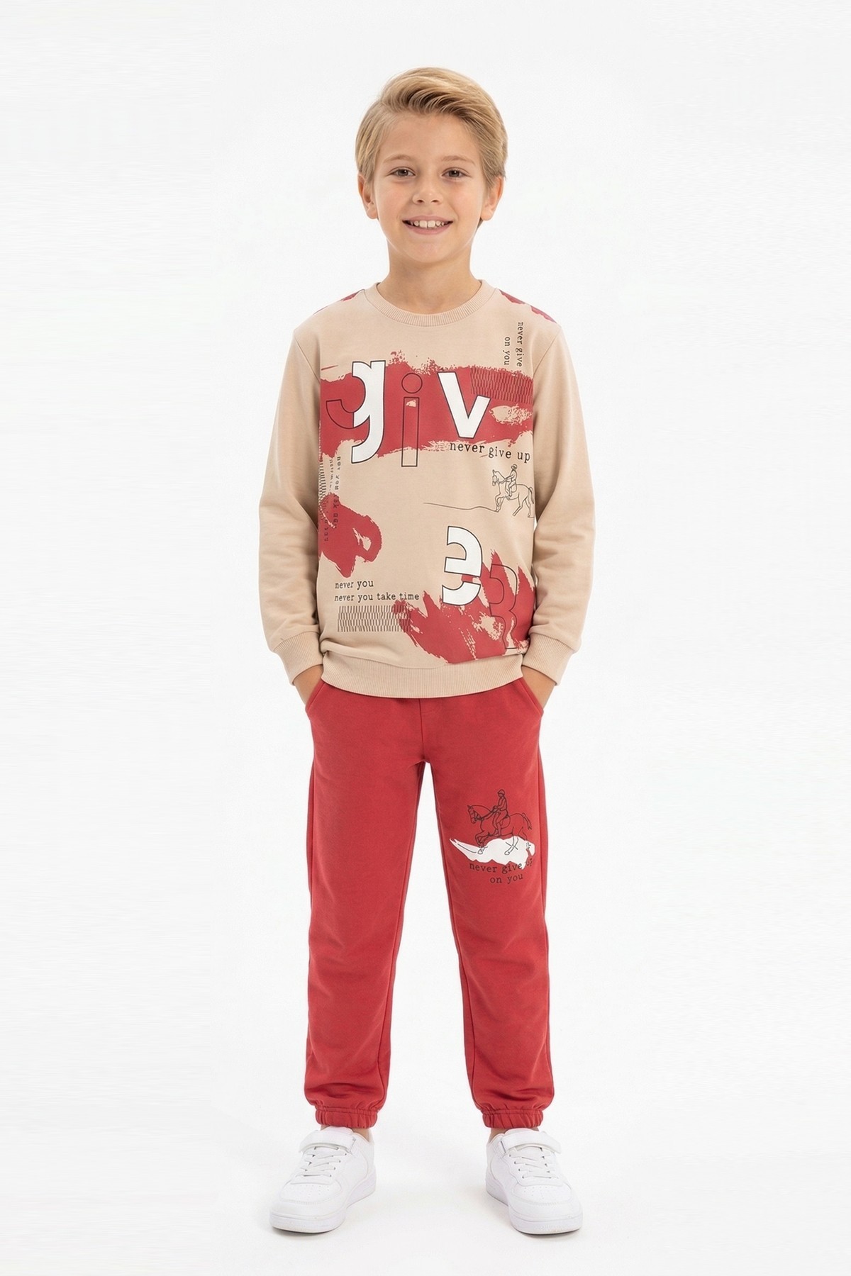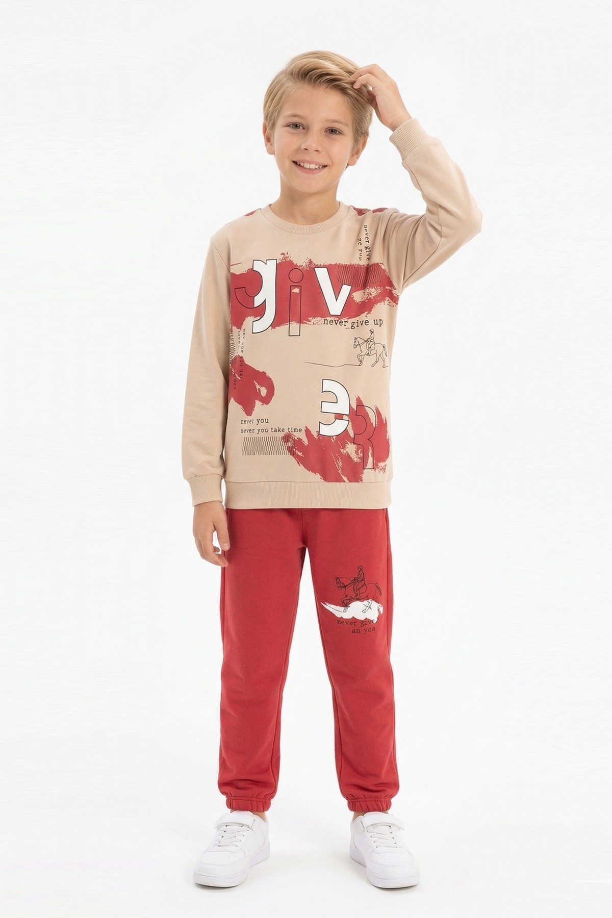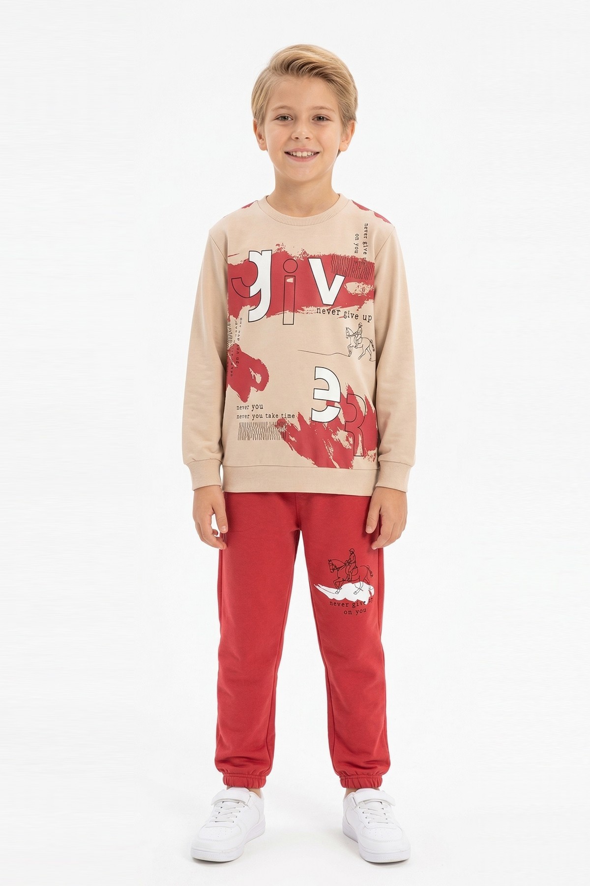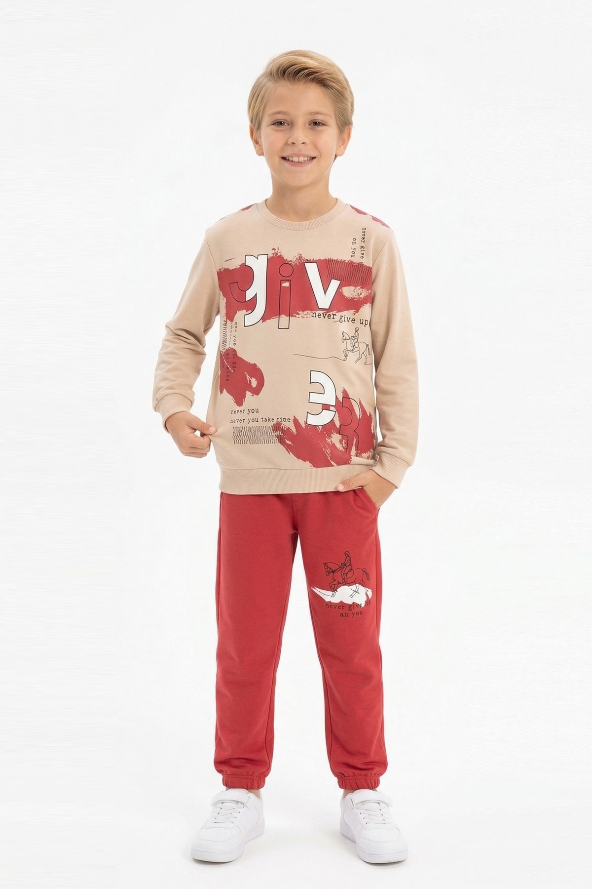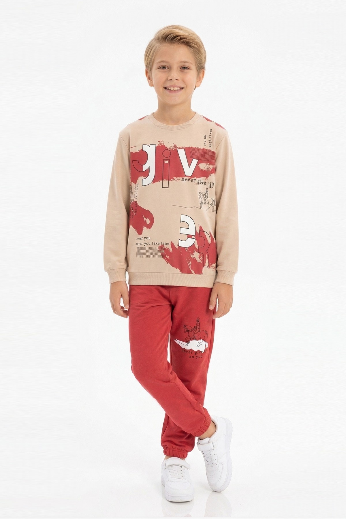 Erkek Çocuk Give Baskılı %100 Pamuk Süprem Kumaş Uzun Kollu Takım