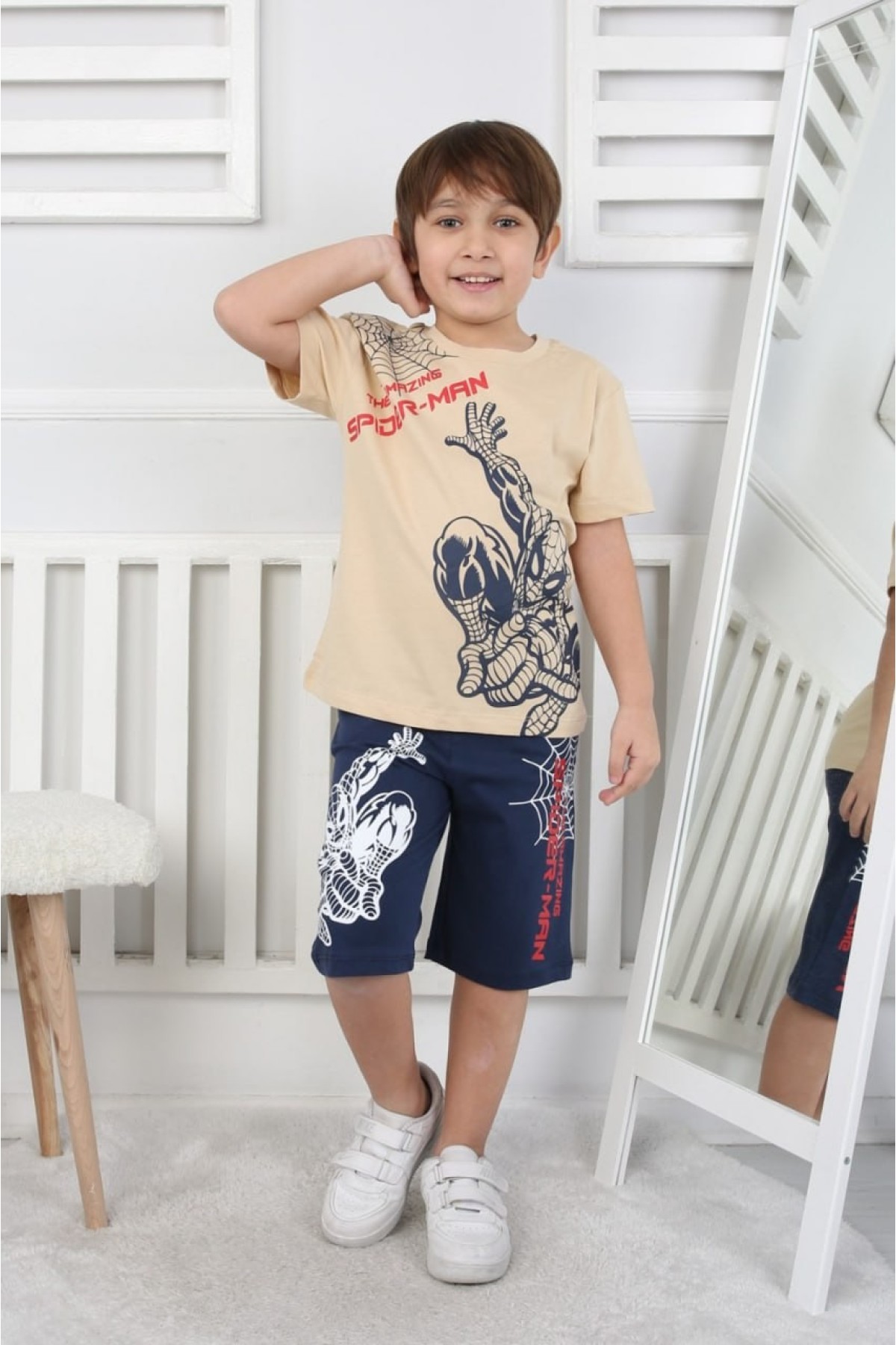 Erkek Çocuk Baskılı %100 Pamuk Süprem Kumaş Reaktif Boyama Şortlu Takım