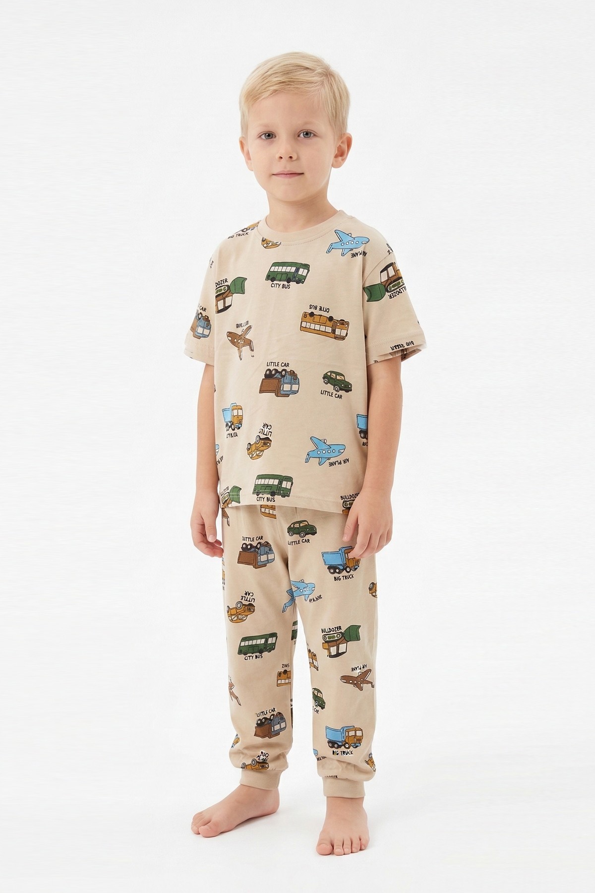 Erkek Çocuk Uçak ve Araba Desenli %100 Pamuk Reaktif Boyalı Süprem Kumaş Kısa Kollu Pijama Takımı