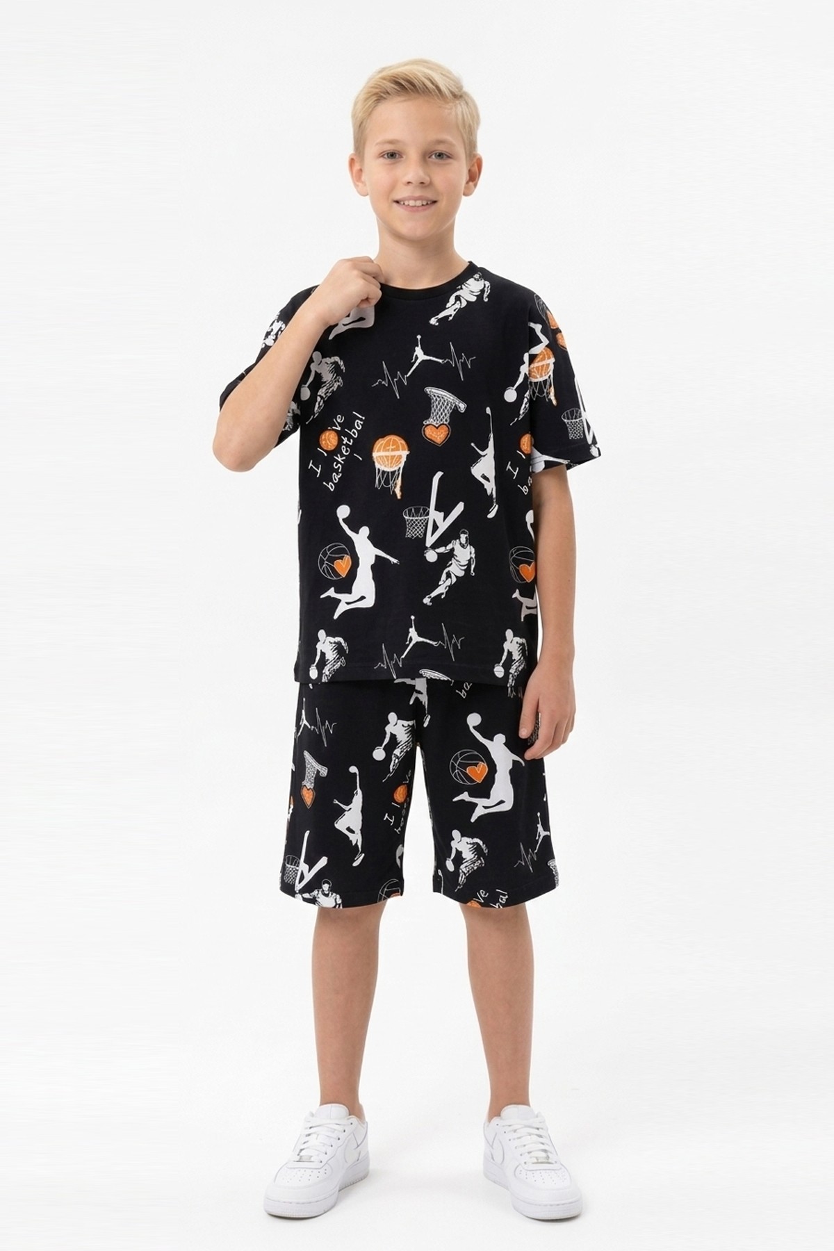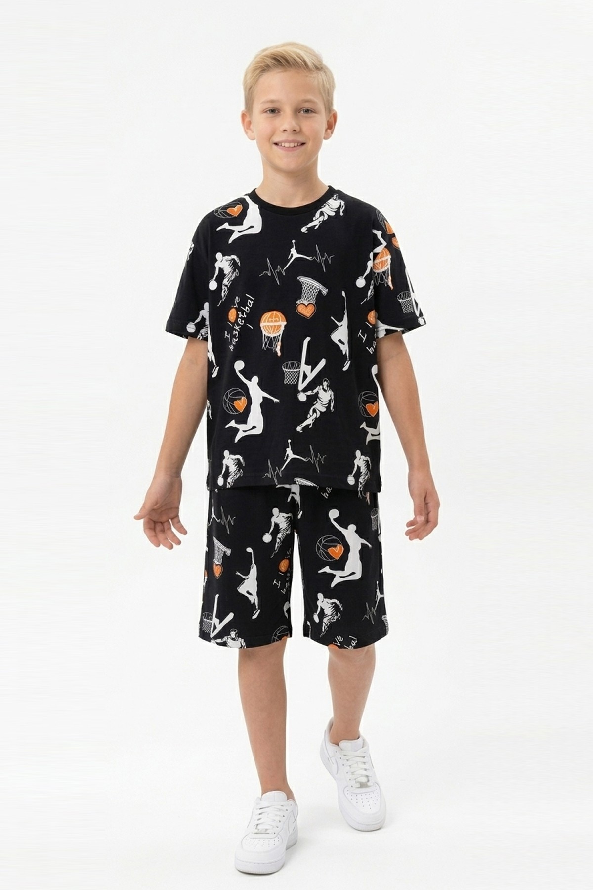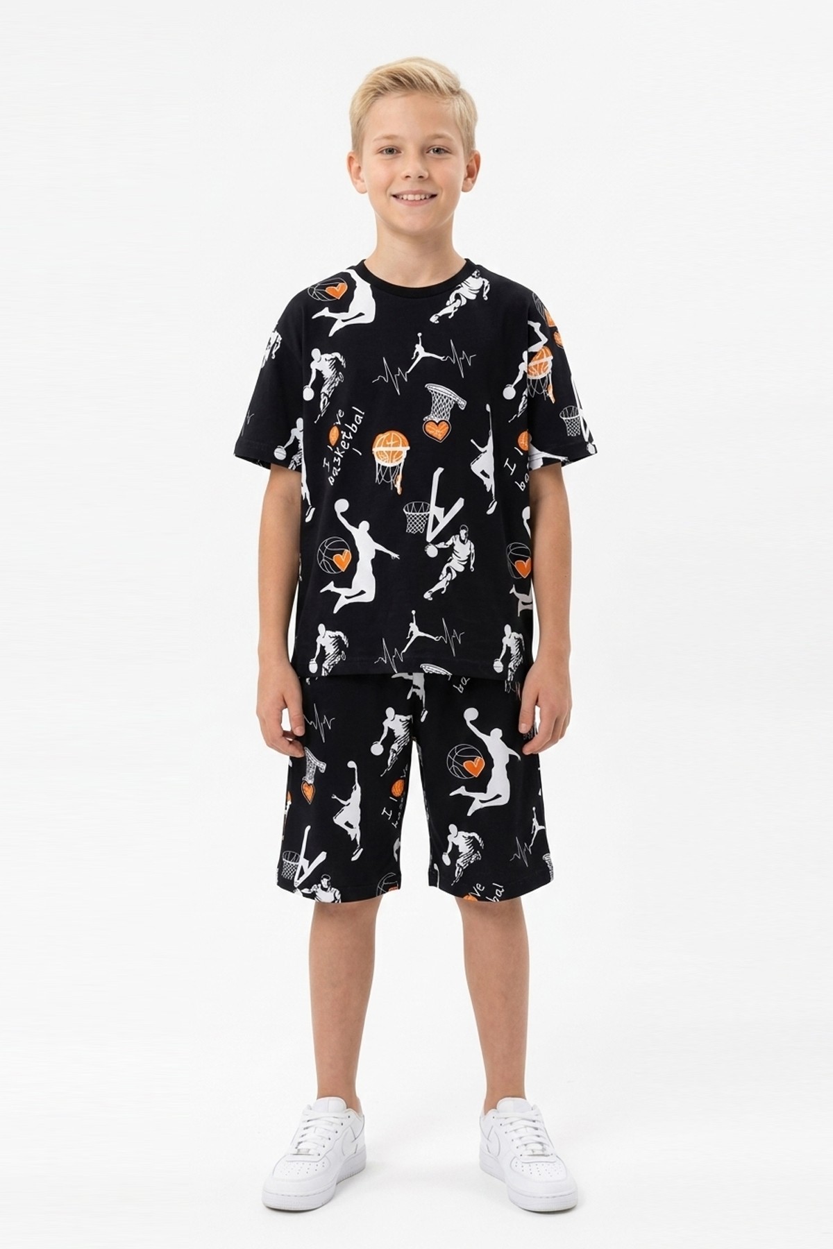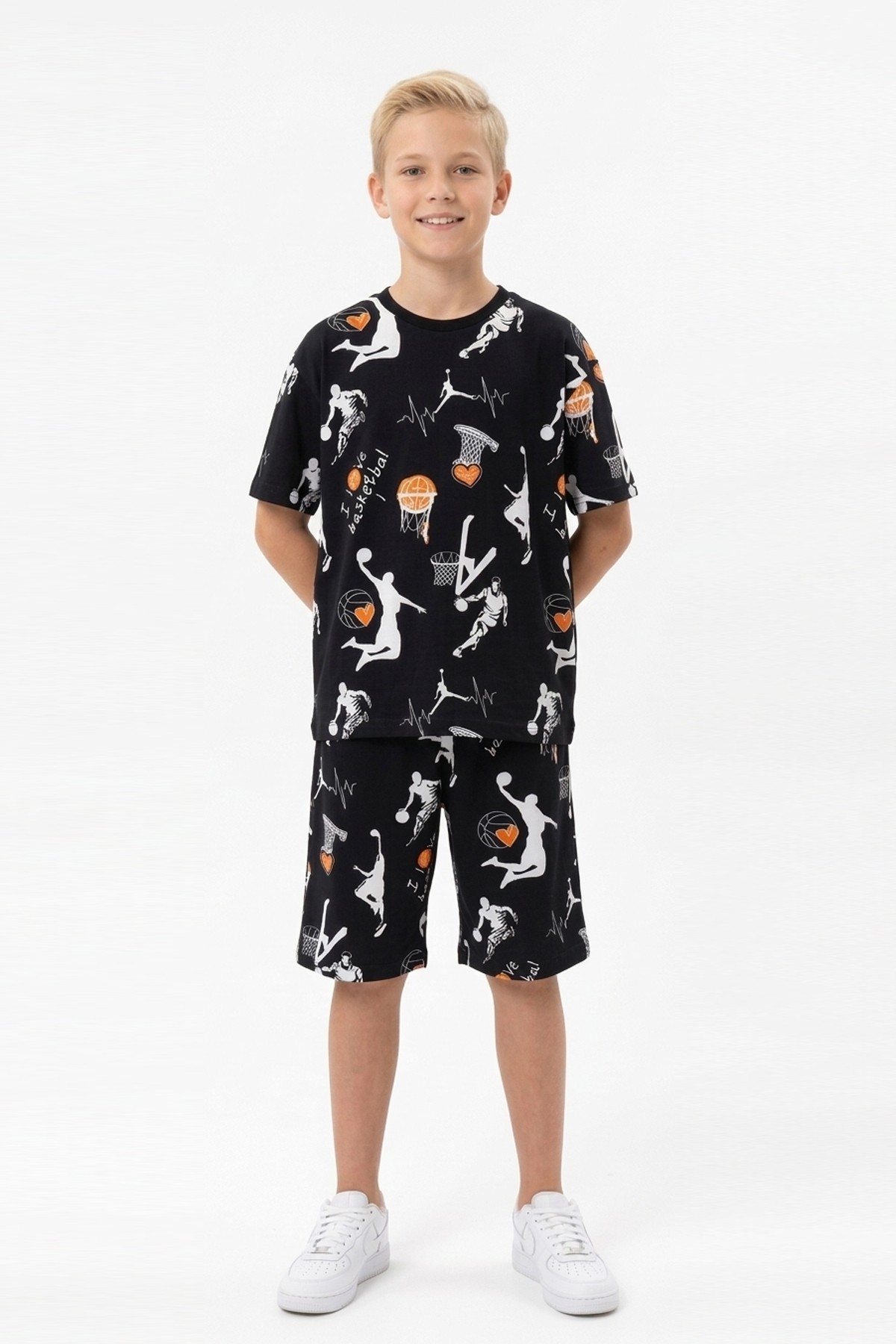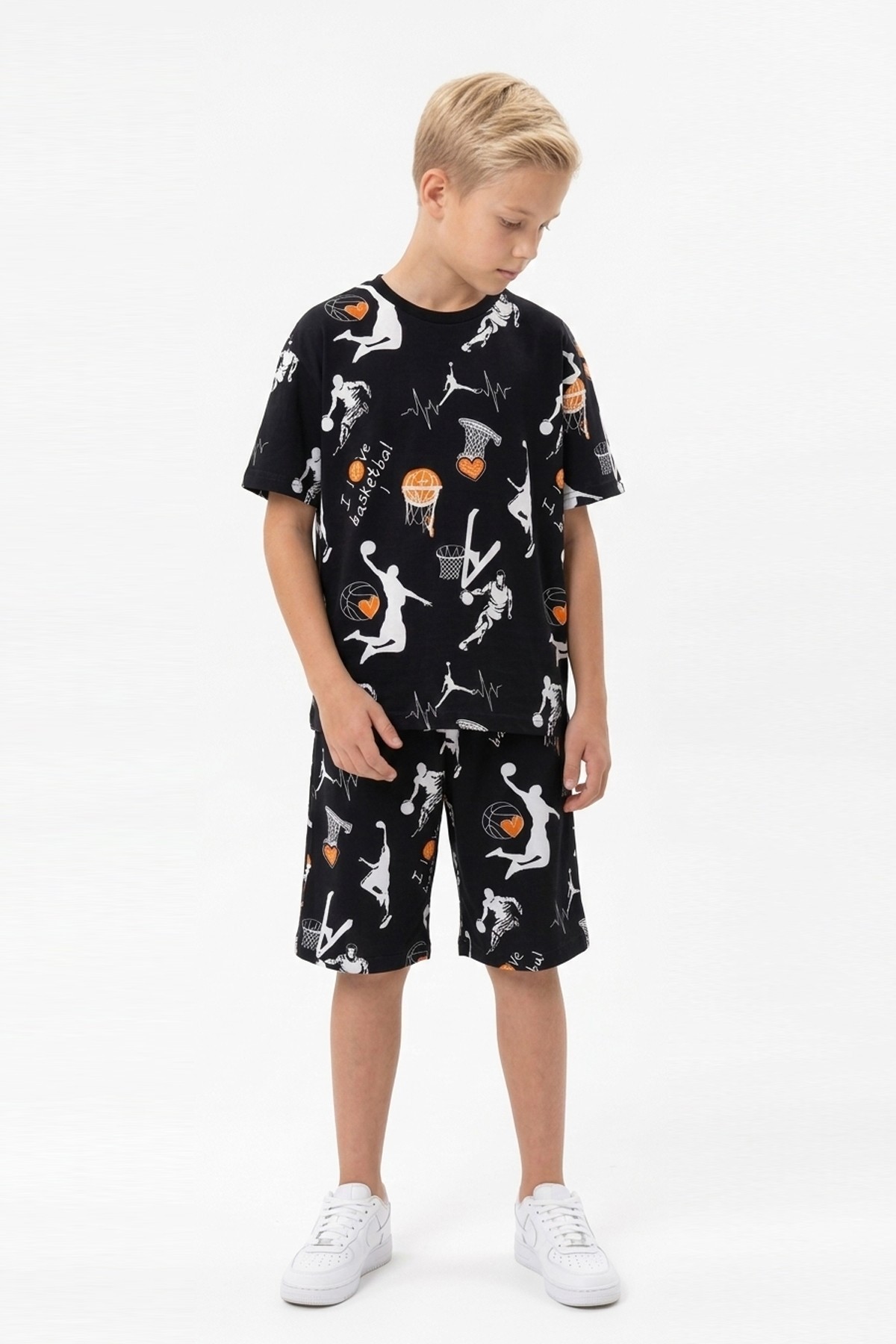 Garson Erkek Çocuk Basketbolcu ve Pota Desenli Kısa Kollu Şortlu Yazlık Takım