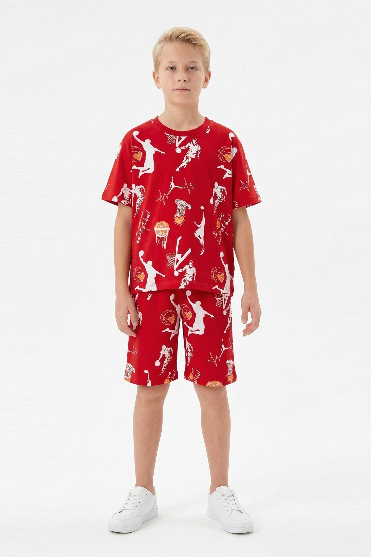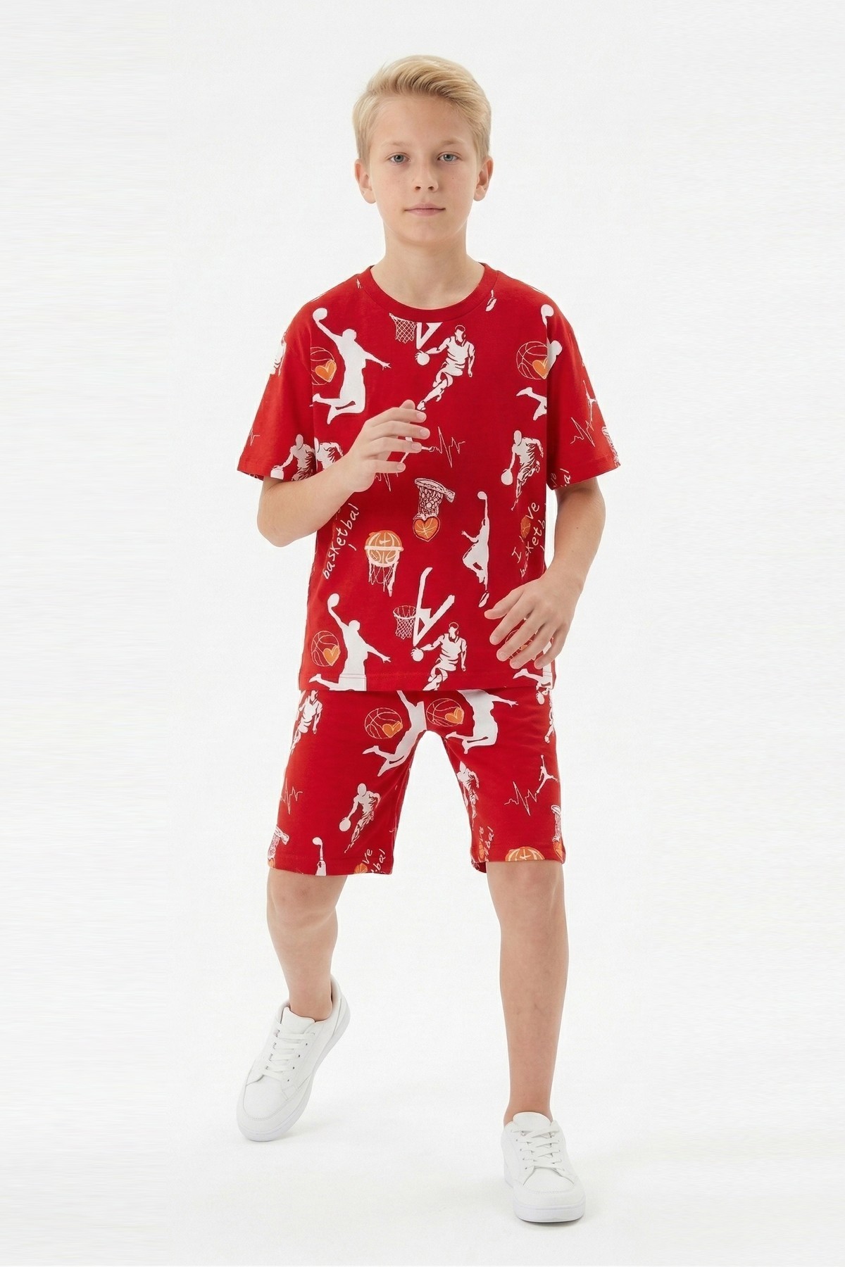 Garson Erkek Çocuk Basketbolcu ve Pota Desenli Kısa Kollu Şortlu Yazlık Takım