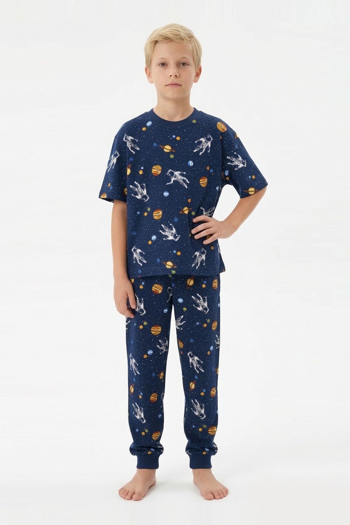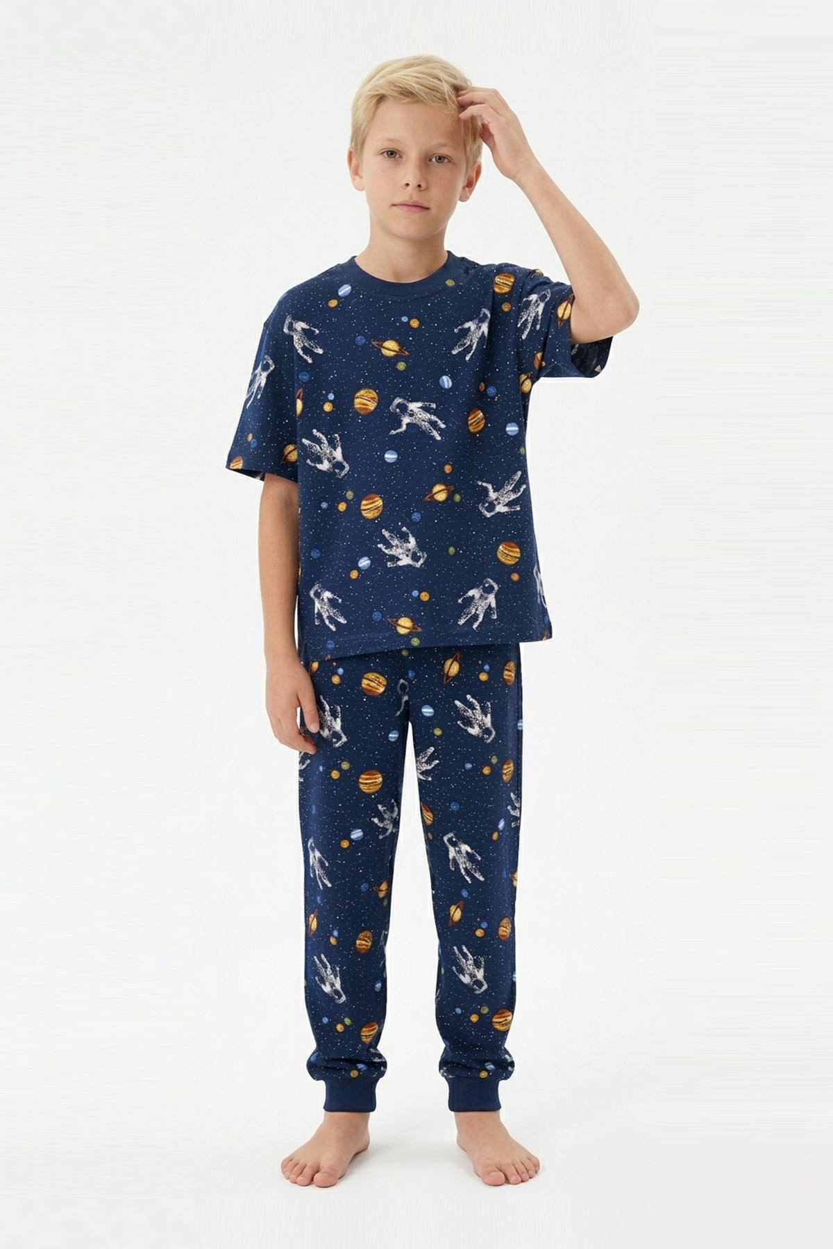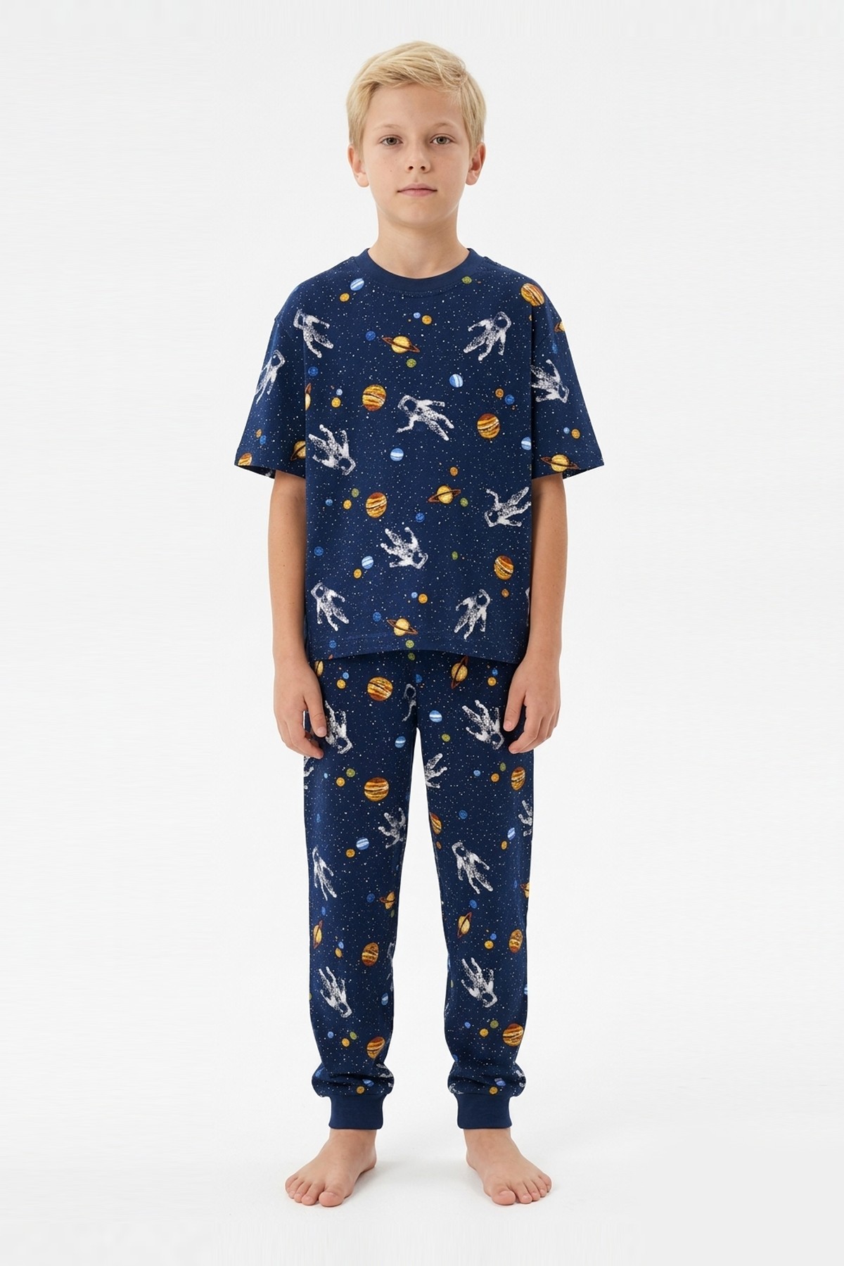 Garson Erkek Çocuk Astronot ve Gezegen Uzay Desenli %100 Pamuk Reaktif Boyalı Süprem Kumaş Kısa Kollu Pijama Takımı