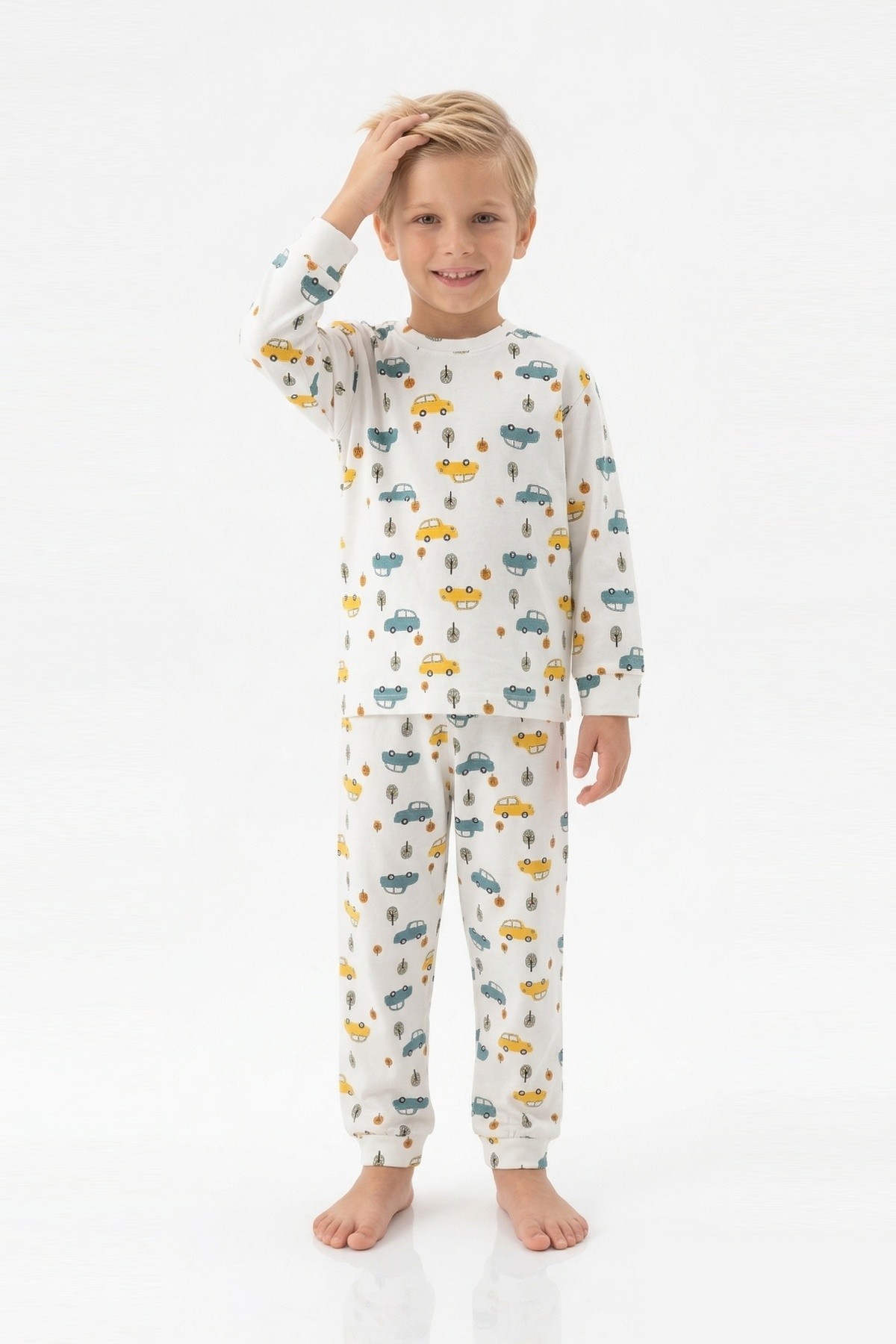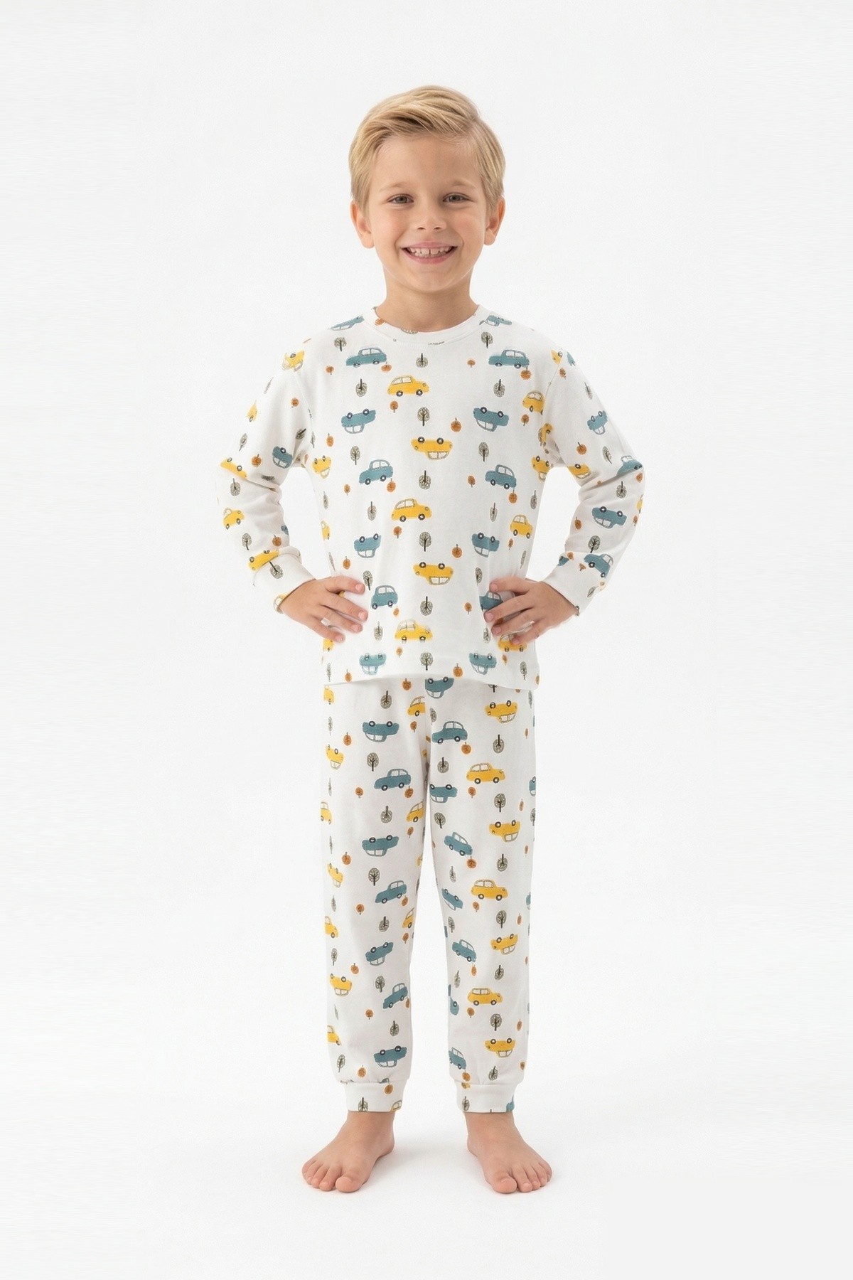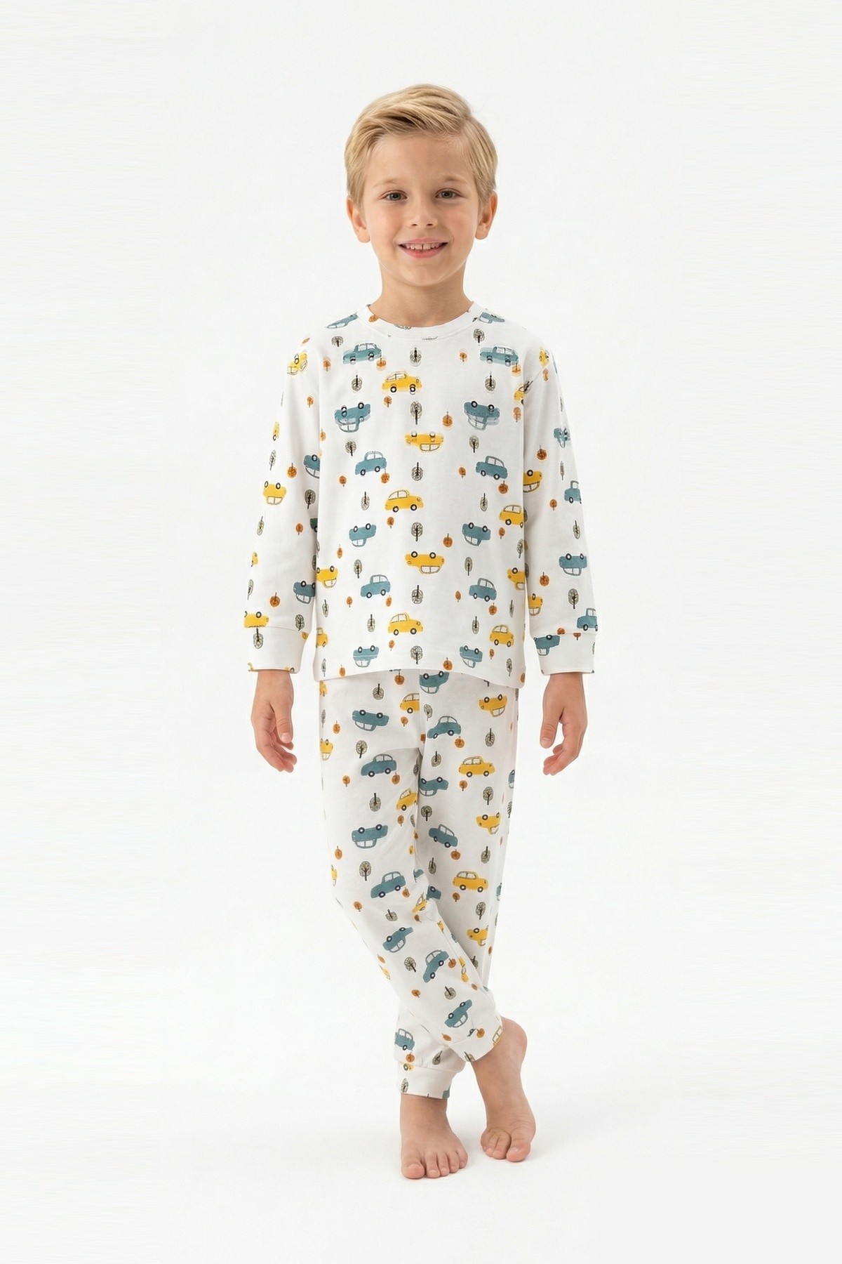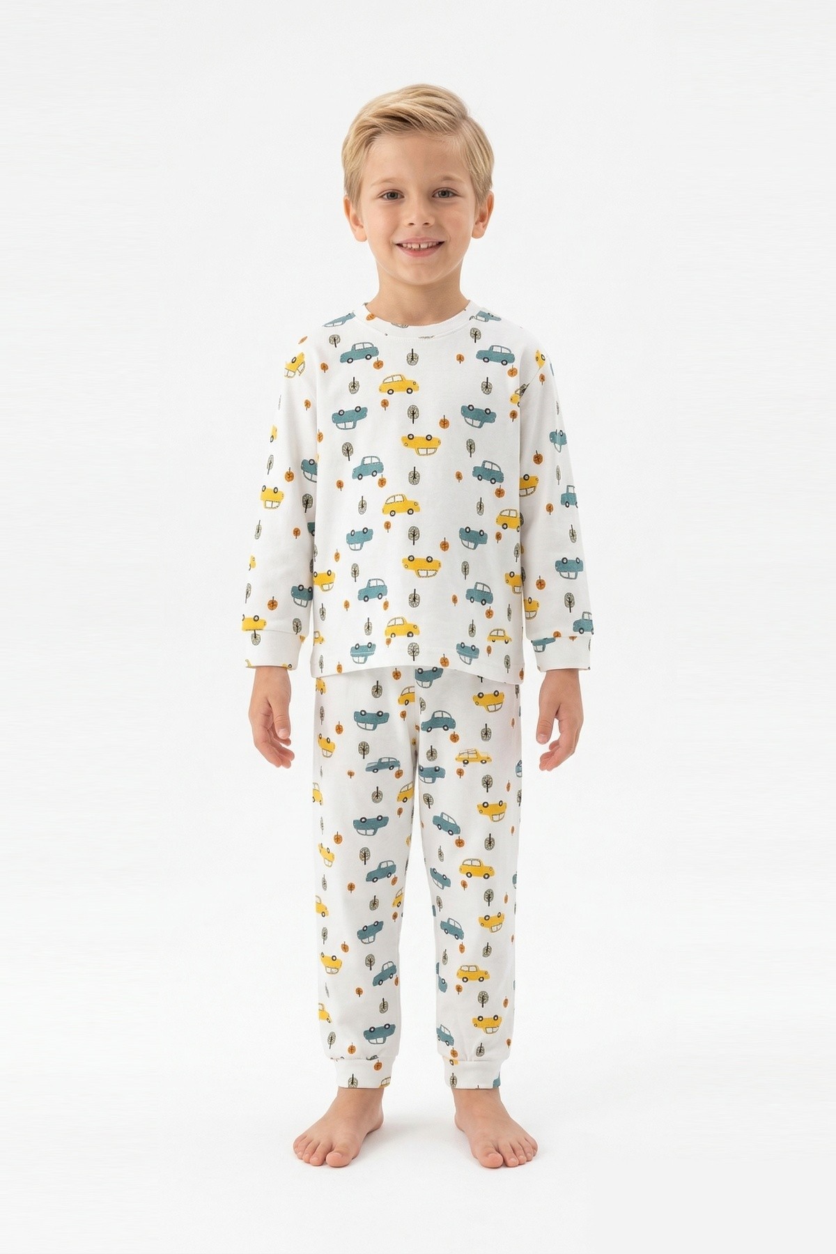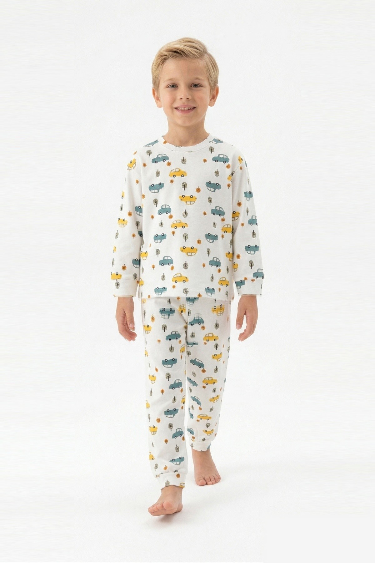 Erkek Çocuk Araba ve Ağaç Desenli %100 Pamuk Reaktif Boyama İnterlok Kumaş Uzun Kollu Pijama Takımı