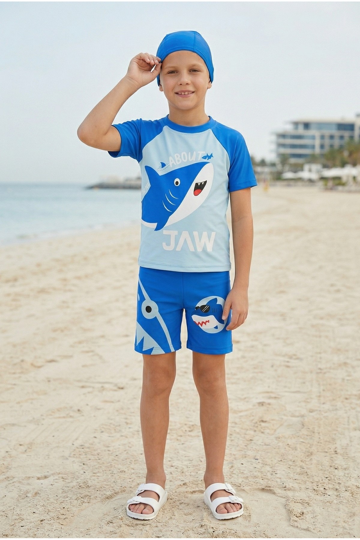 Erkek Çocuk Polyester + Elastan Köpekbalığı Baskılı Kısa Kollu Şort ve Bone Üçlü Mayo