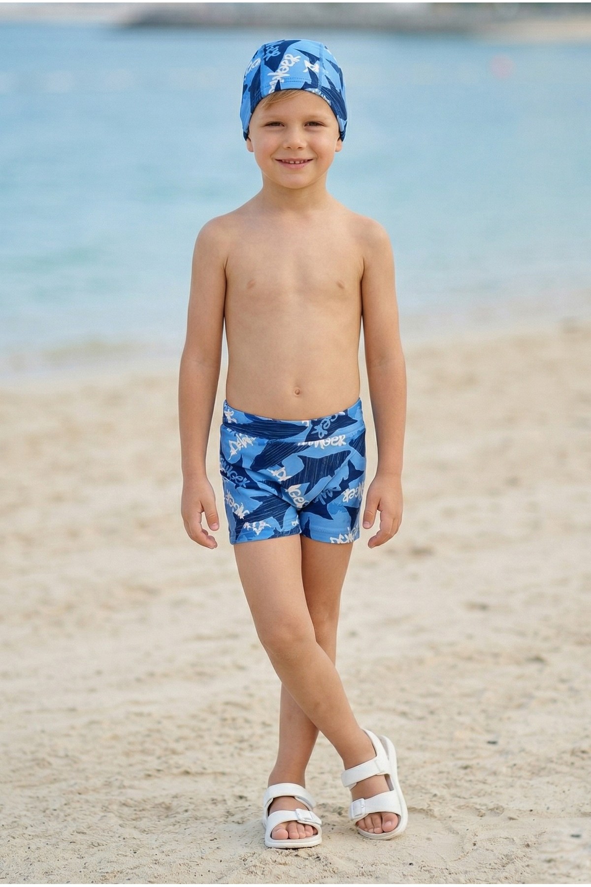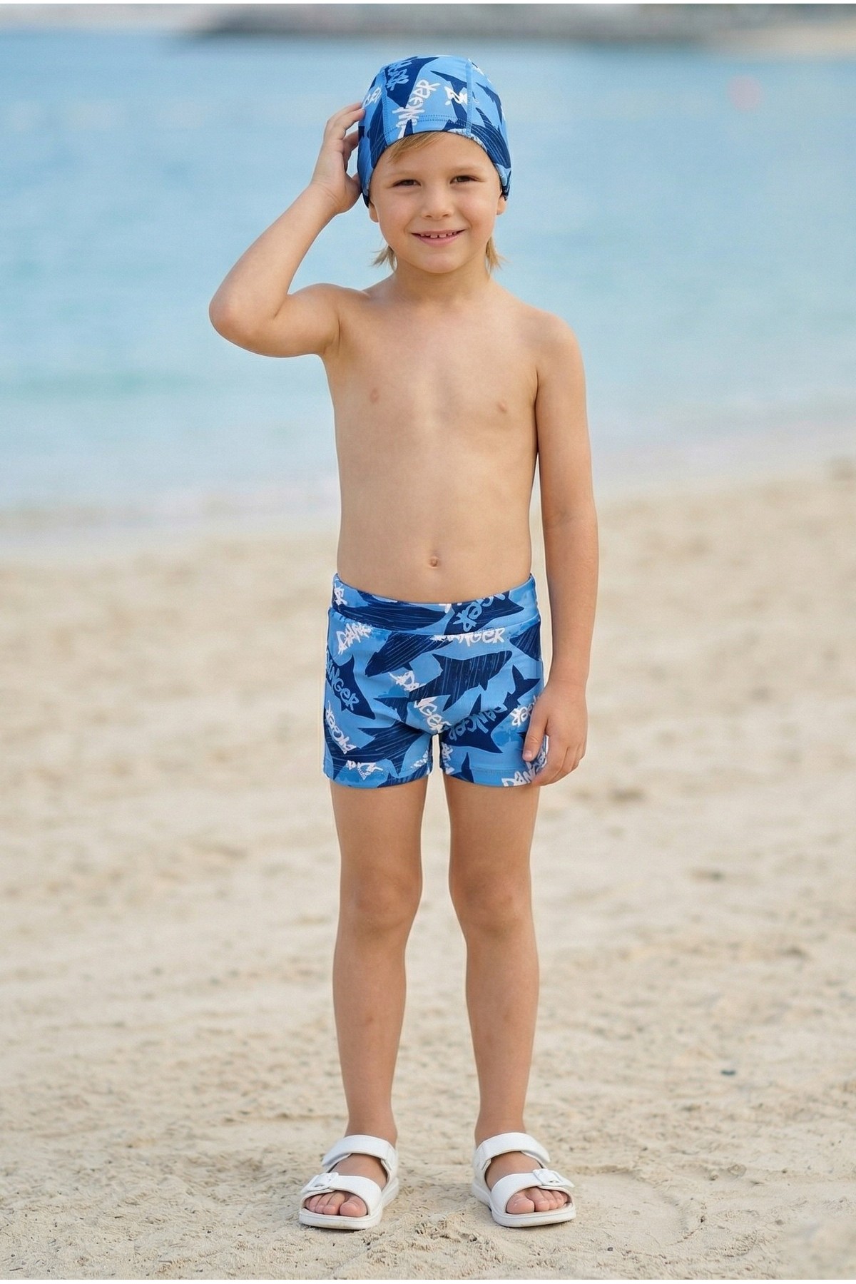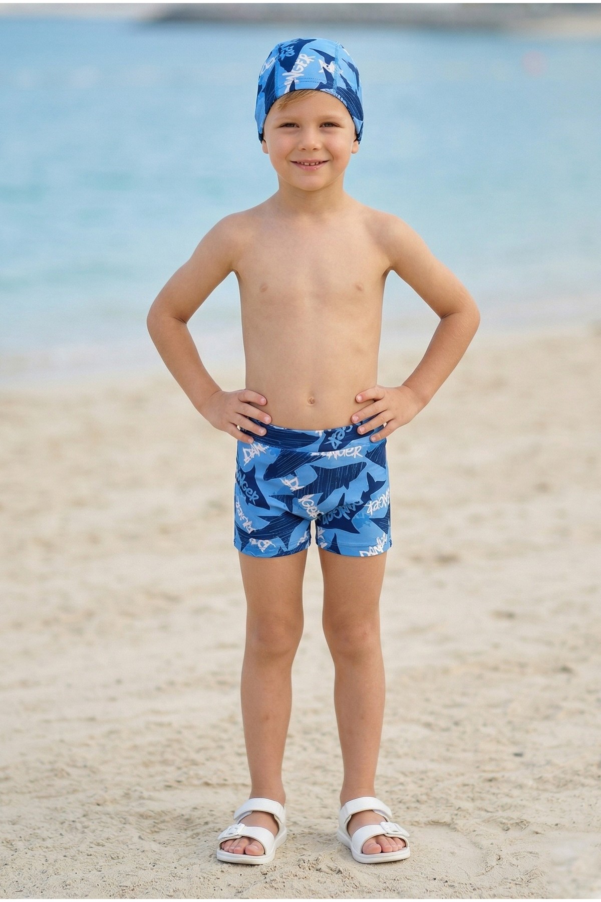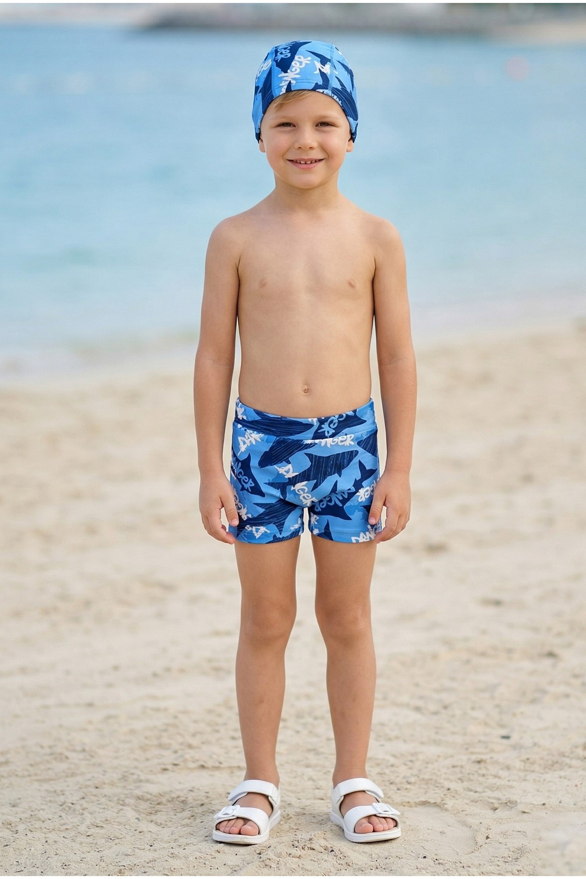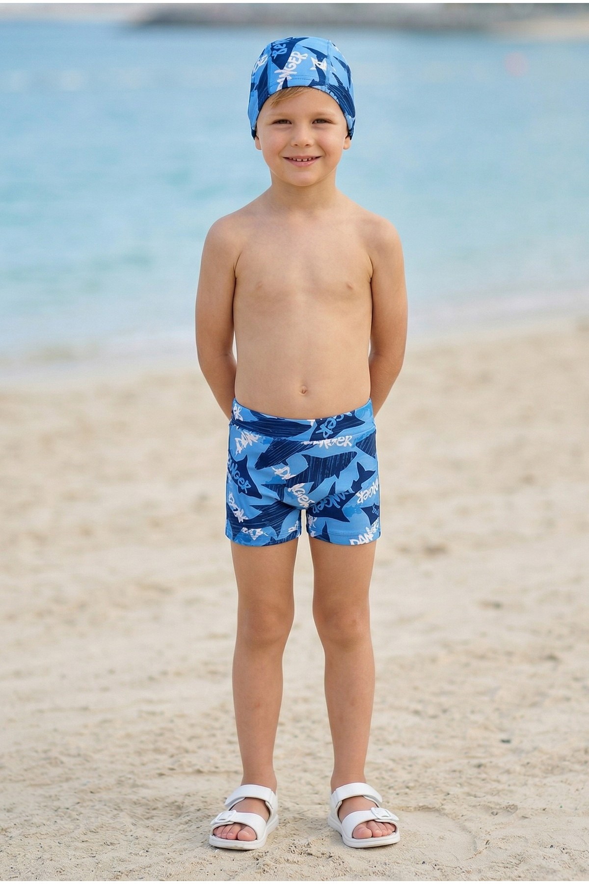 Erkek Çocuk Polyester + Elastan Baskılı Köpekbalığı Desenli Şort ve Bone İkili Mayo
