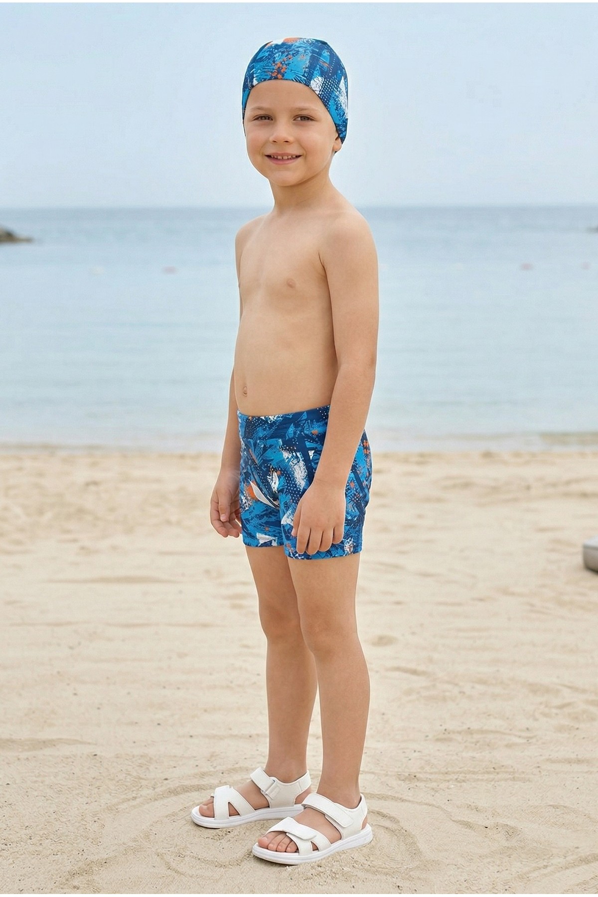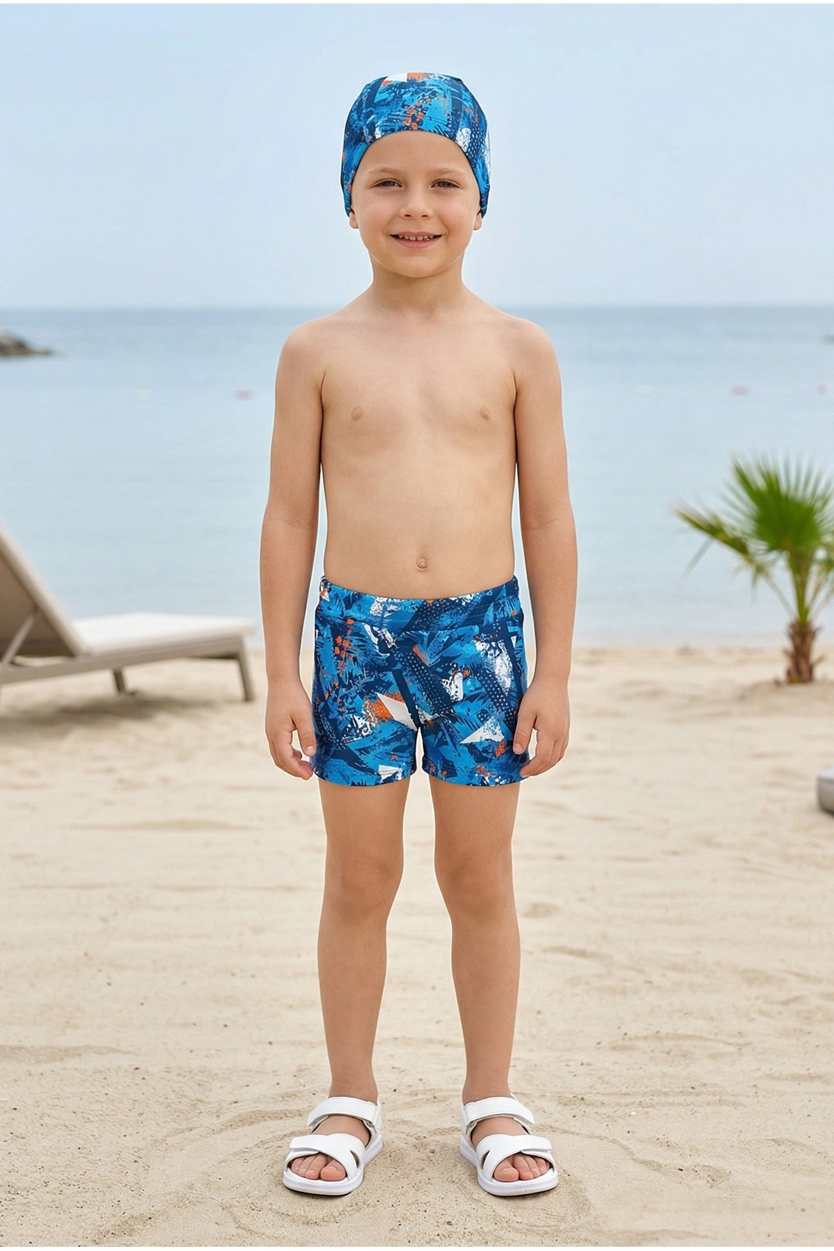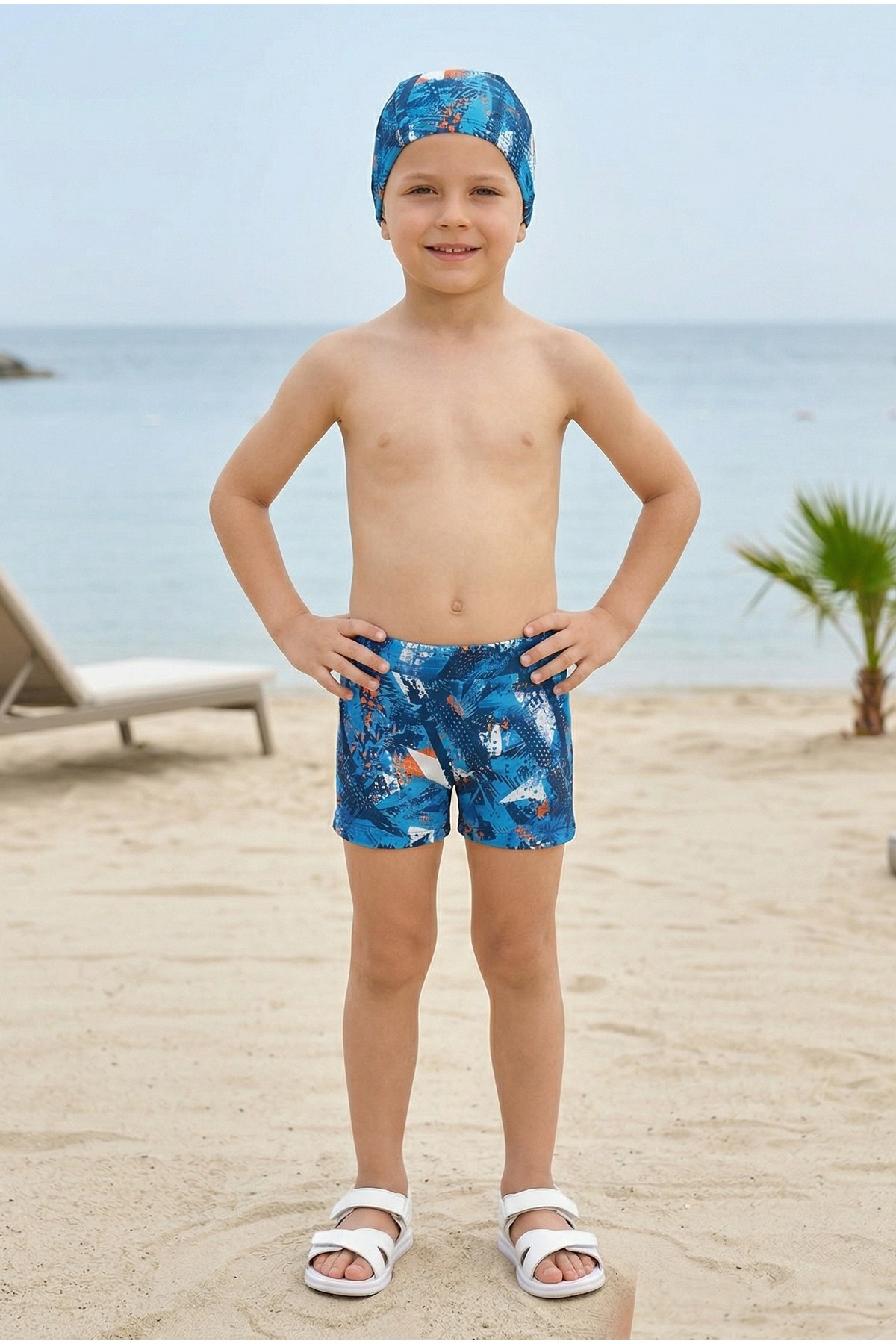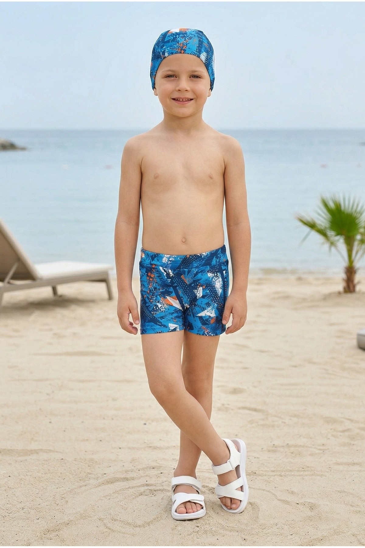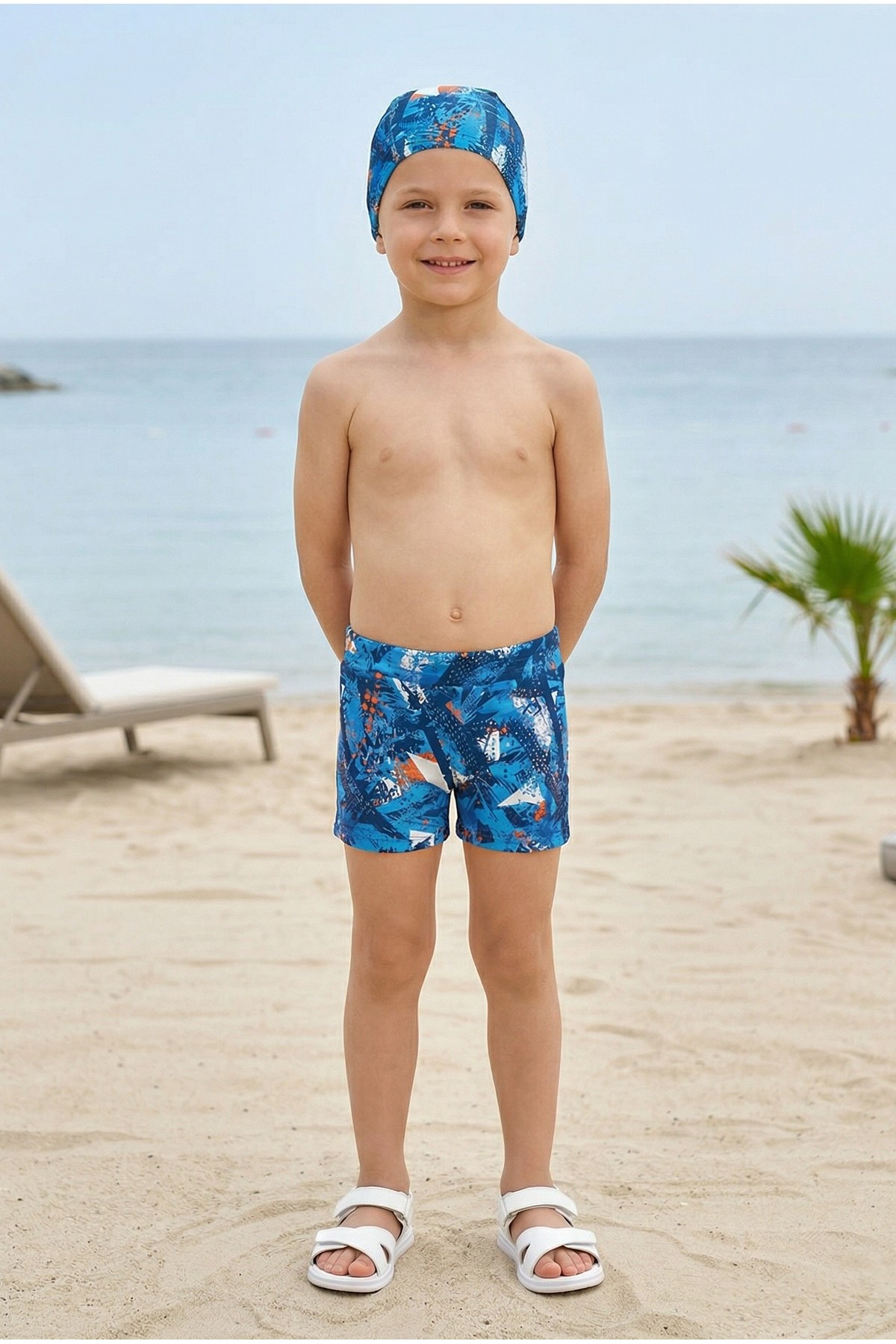 Erkek Çocuk Polyester + Elastan Geometrik Desenli Şort ve Bone İkili Mayo