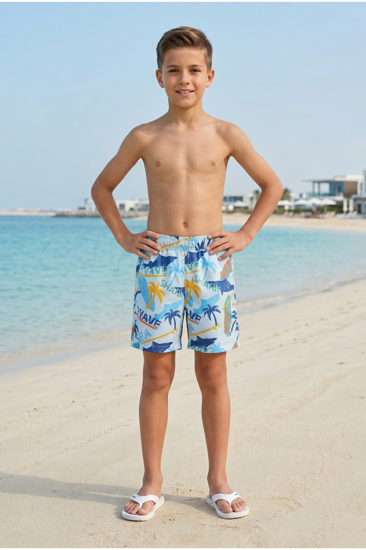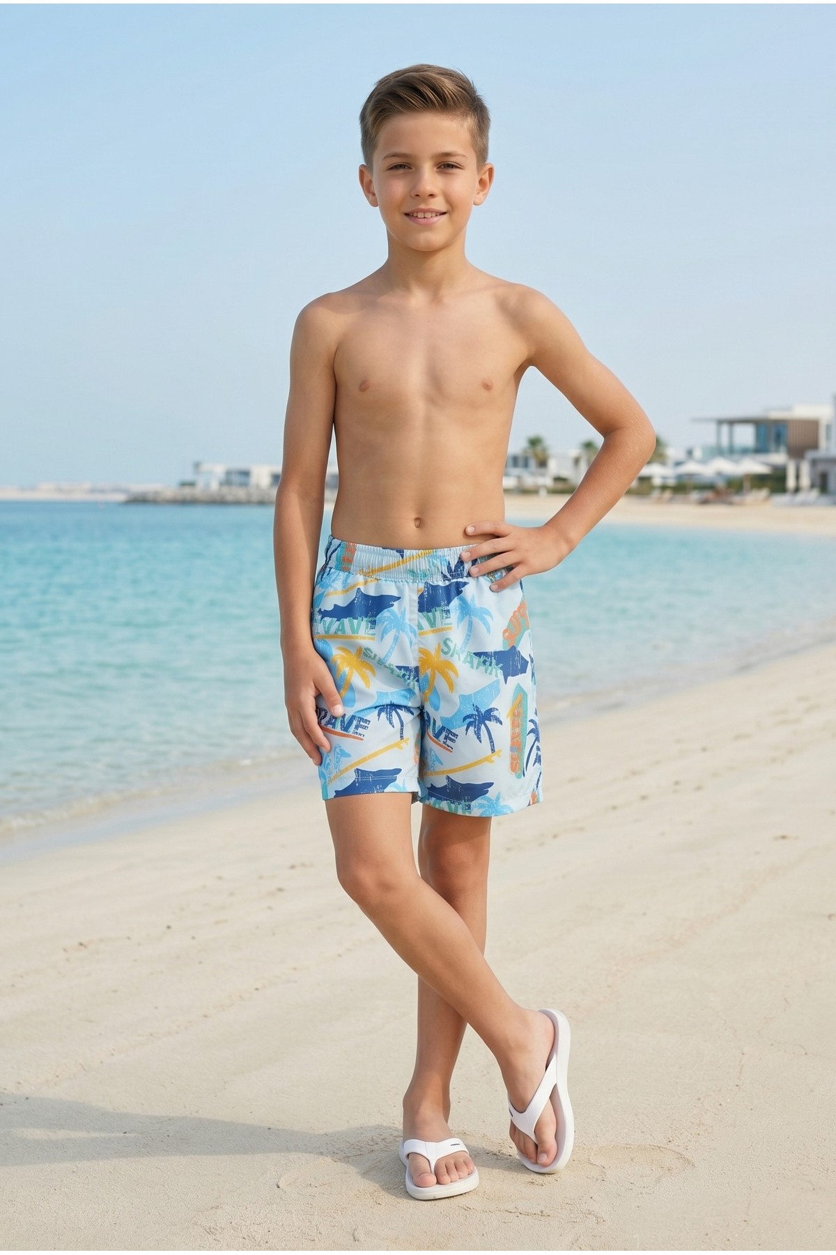 Erkek Çocuk Polyester + Elastan Baskılı Lastikli Bel Cepli Deniz Şortu Mayo