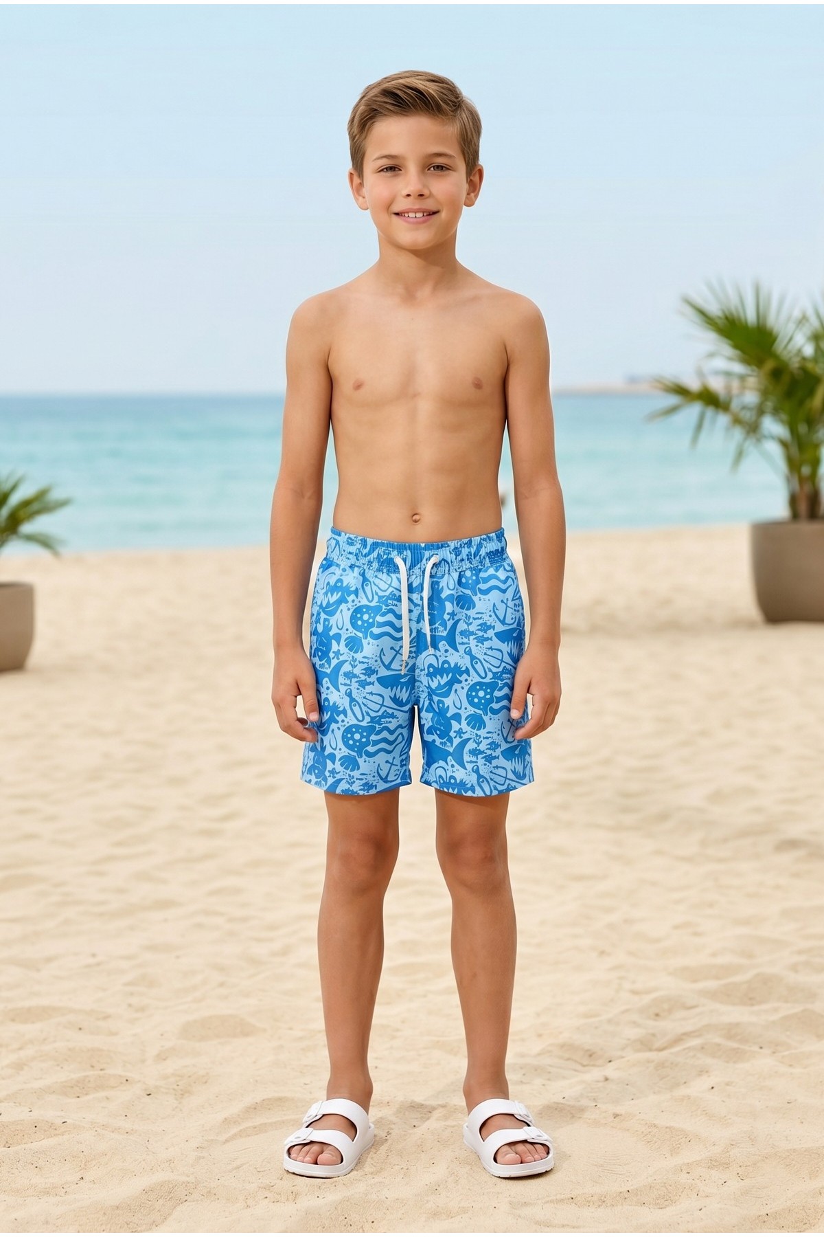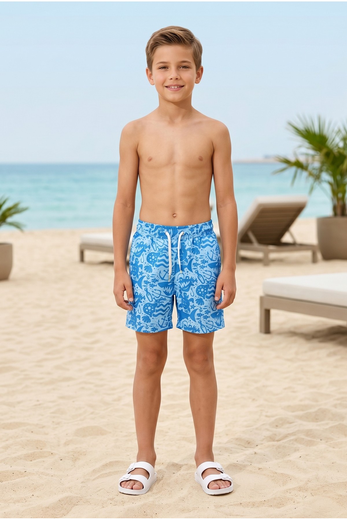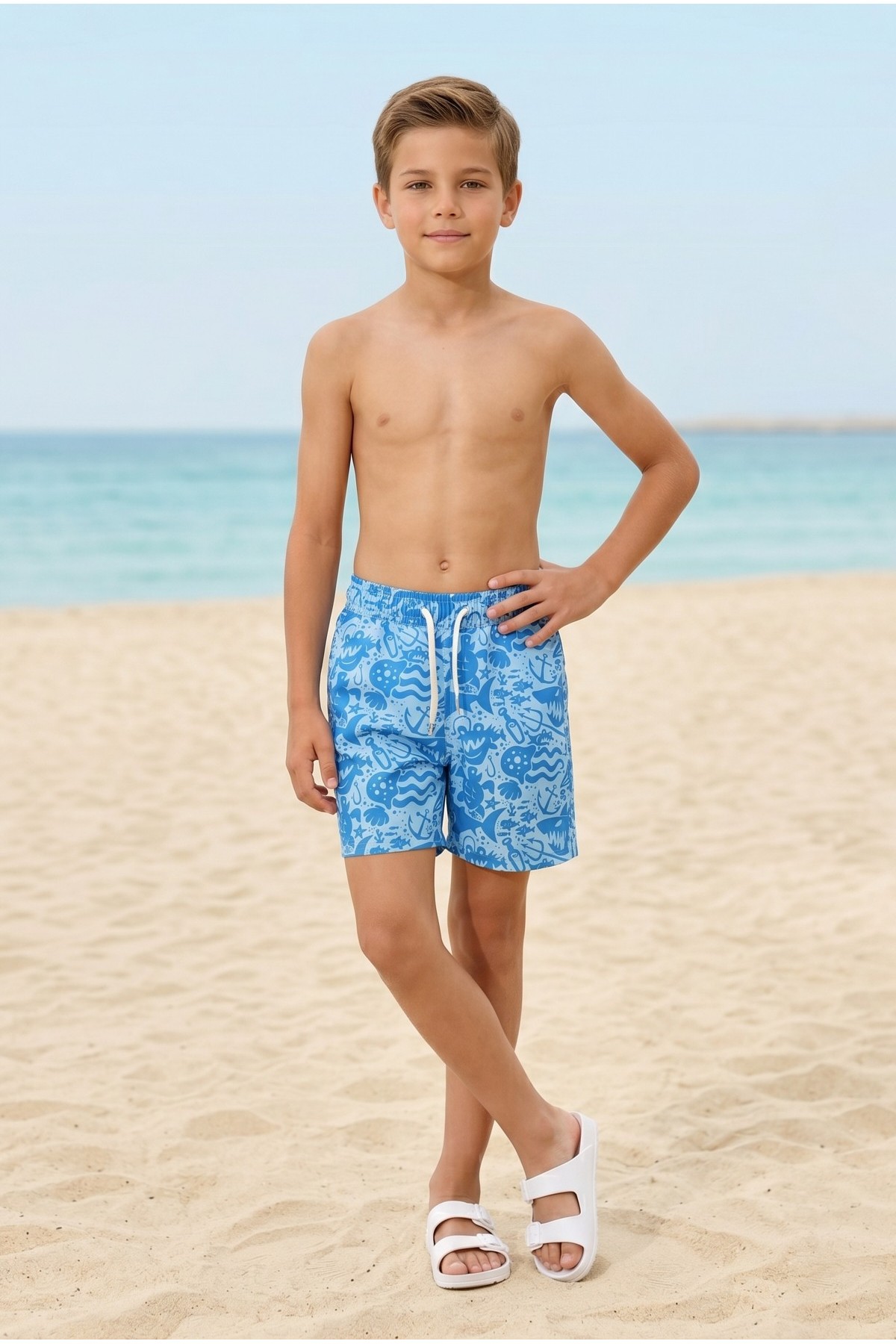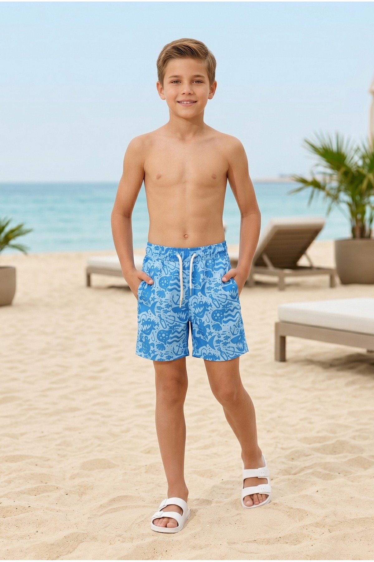 Erkek Çocuk Polyester + Elastan Baskılı Lastikli Bel Cepli Deniz Şortu Mayo