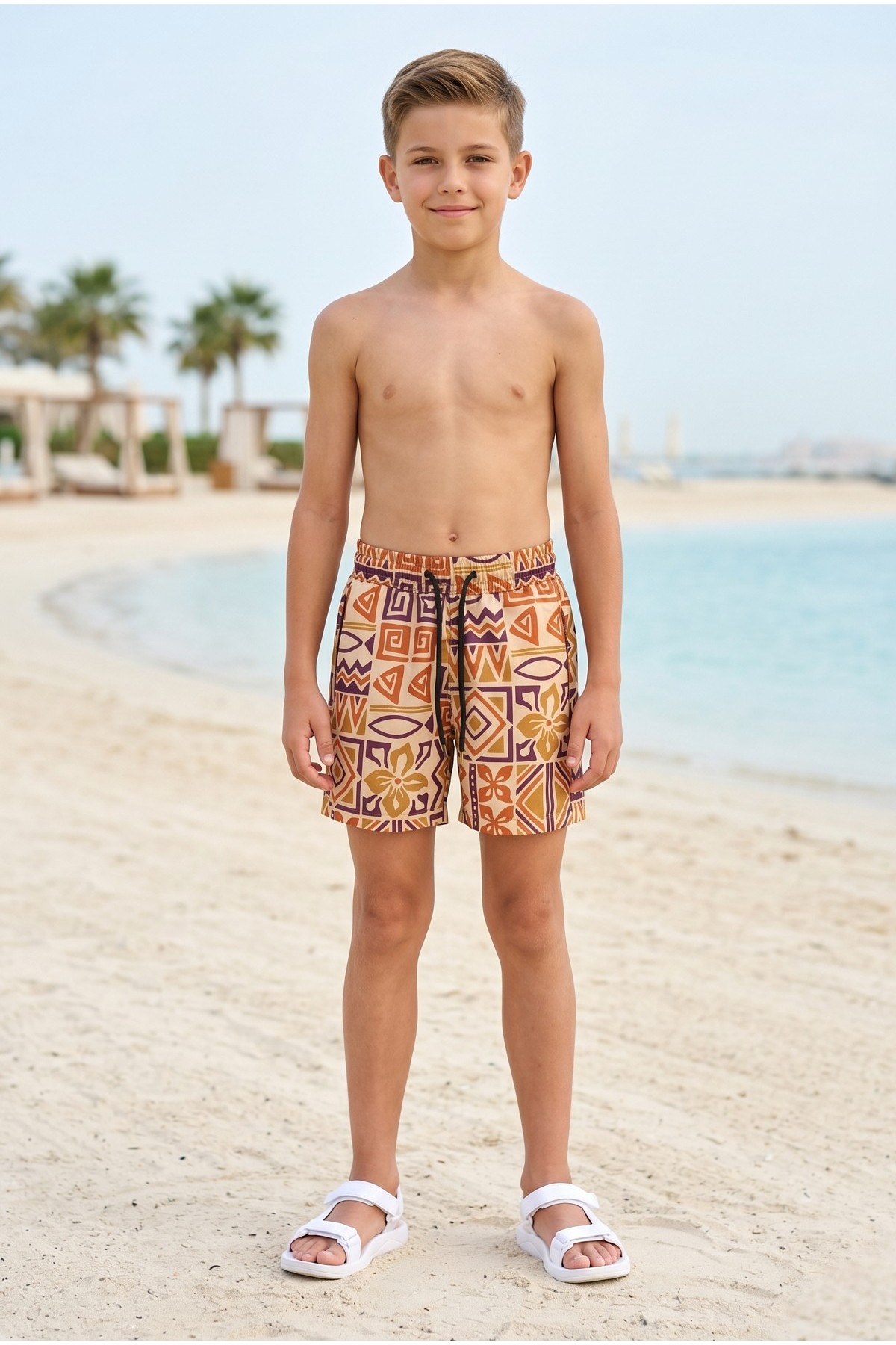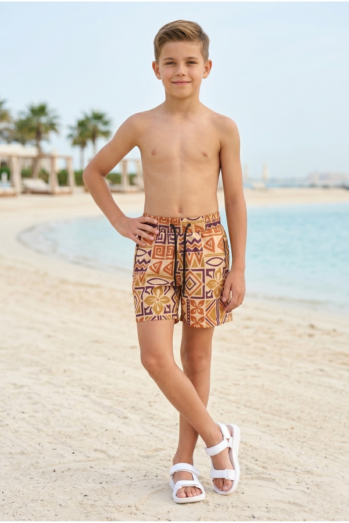 Erkek Çocuk Polyester + Elastan Baskılı Lastikli Bel Cepli Deniz Şortu Mayo