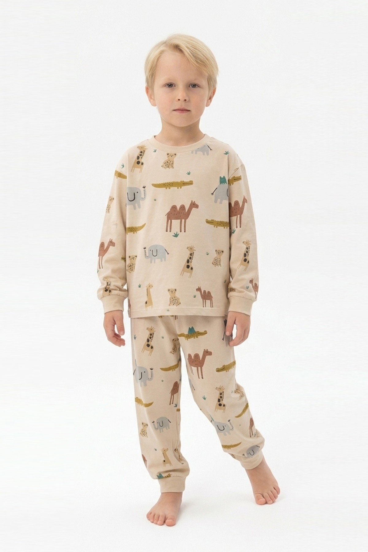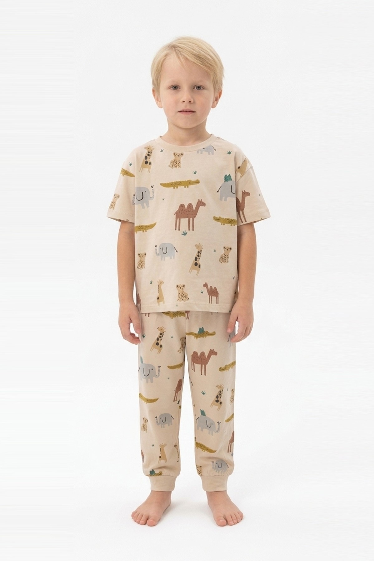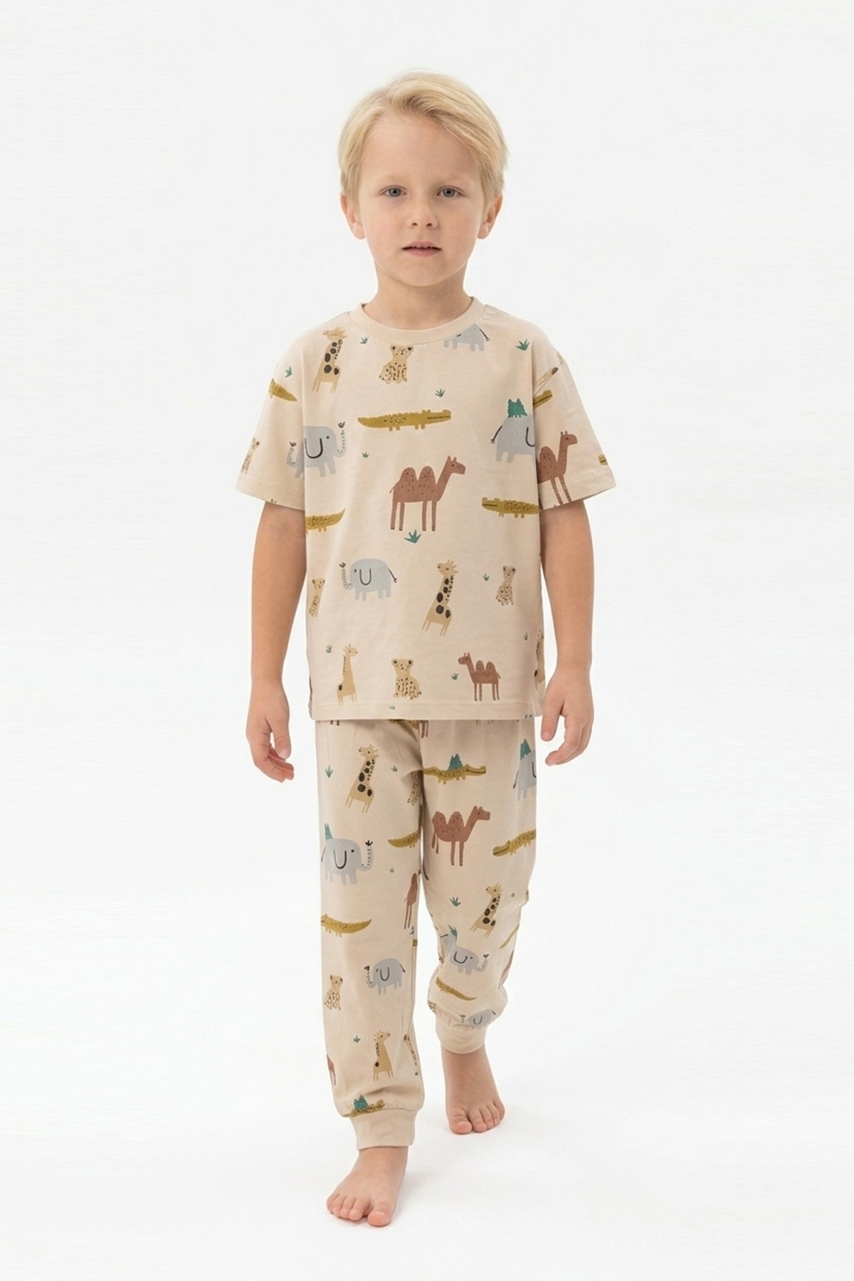 Erkek Çocuk Safari Hayvan Desenli  %100 Pamuk Reaktif Boyalı Süprem Kumaş Kısa Kollu Pijama Takımı
