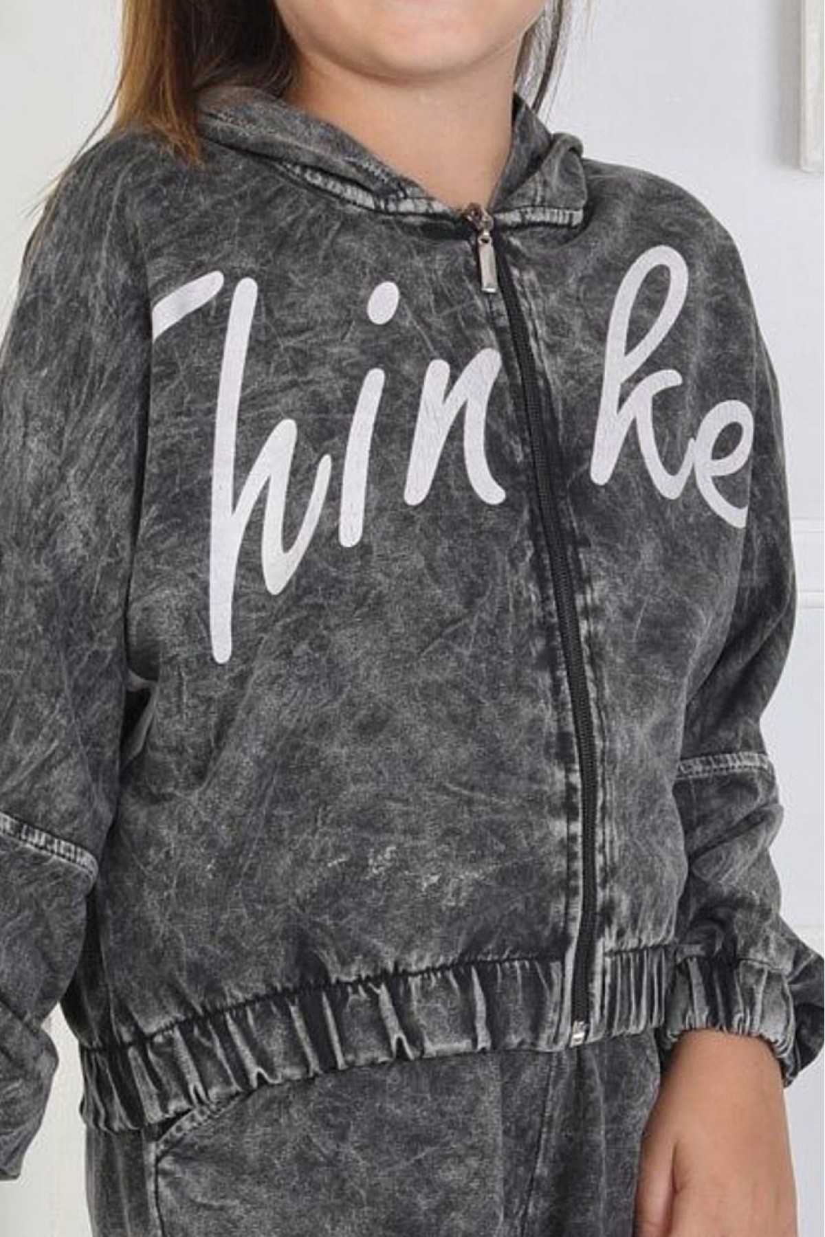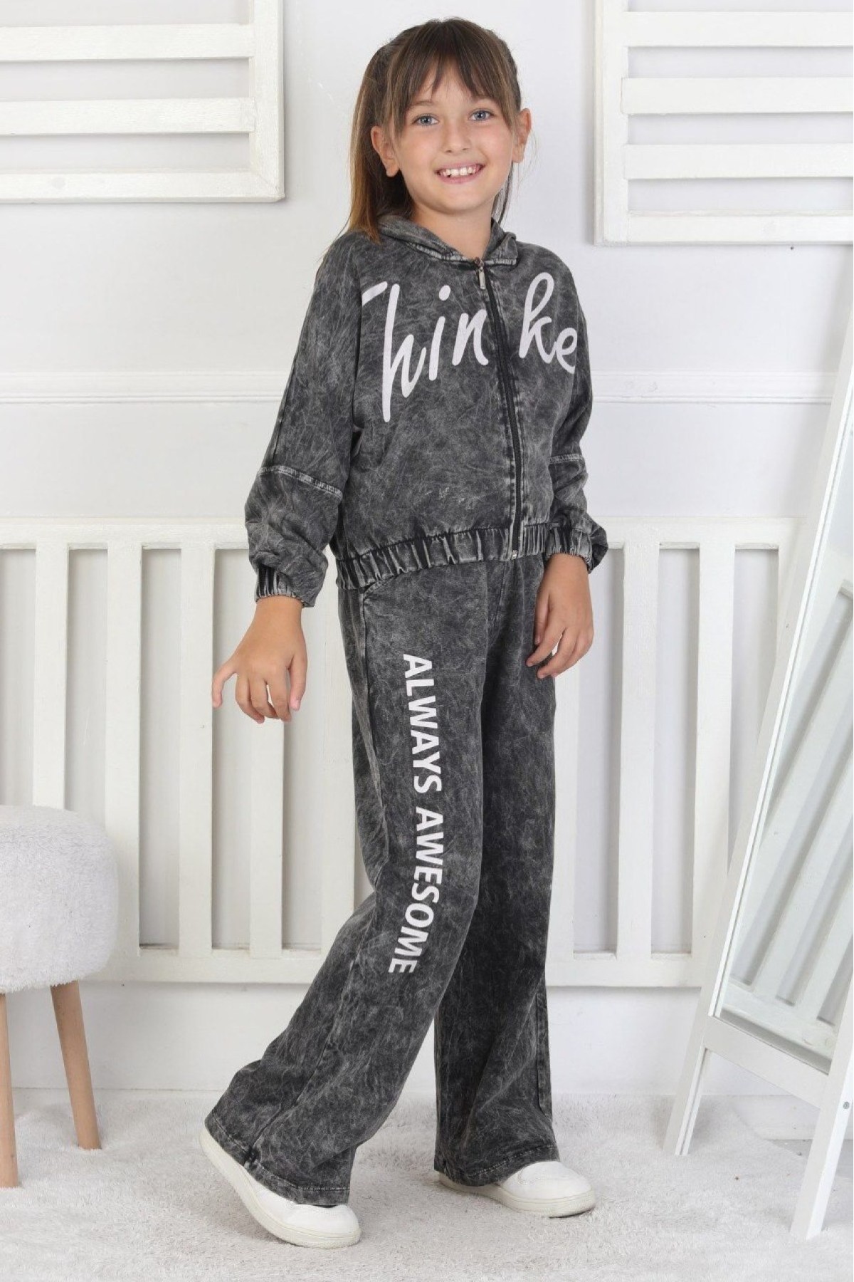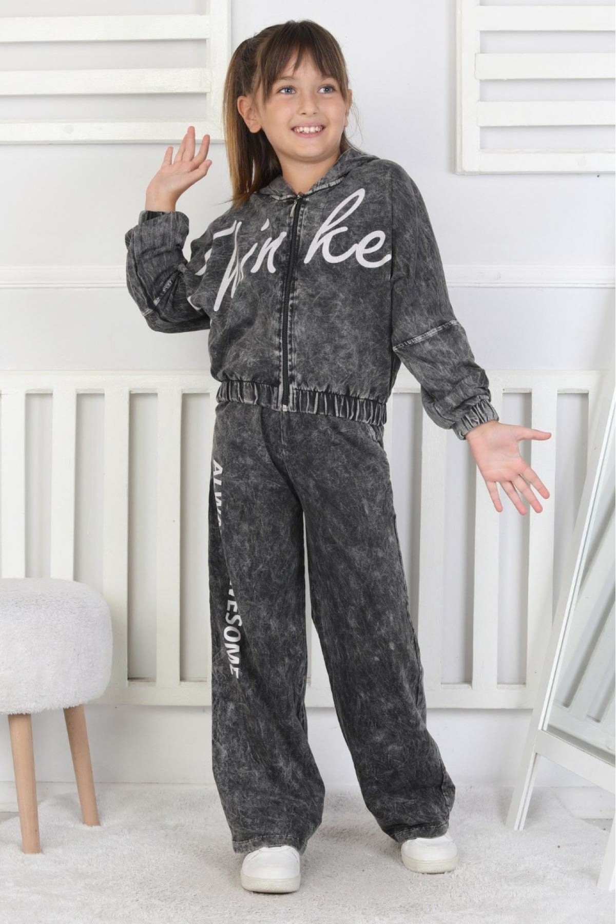 Yıkamalı Kapüşonlu Baskılı Kız Çocuk Takım