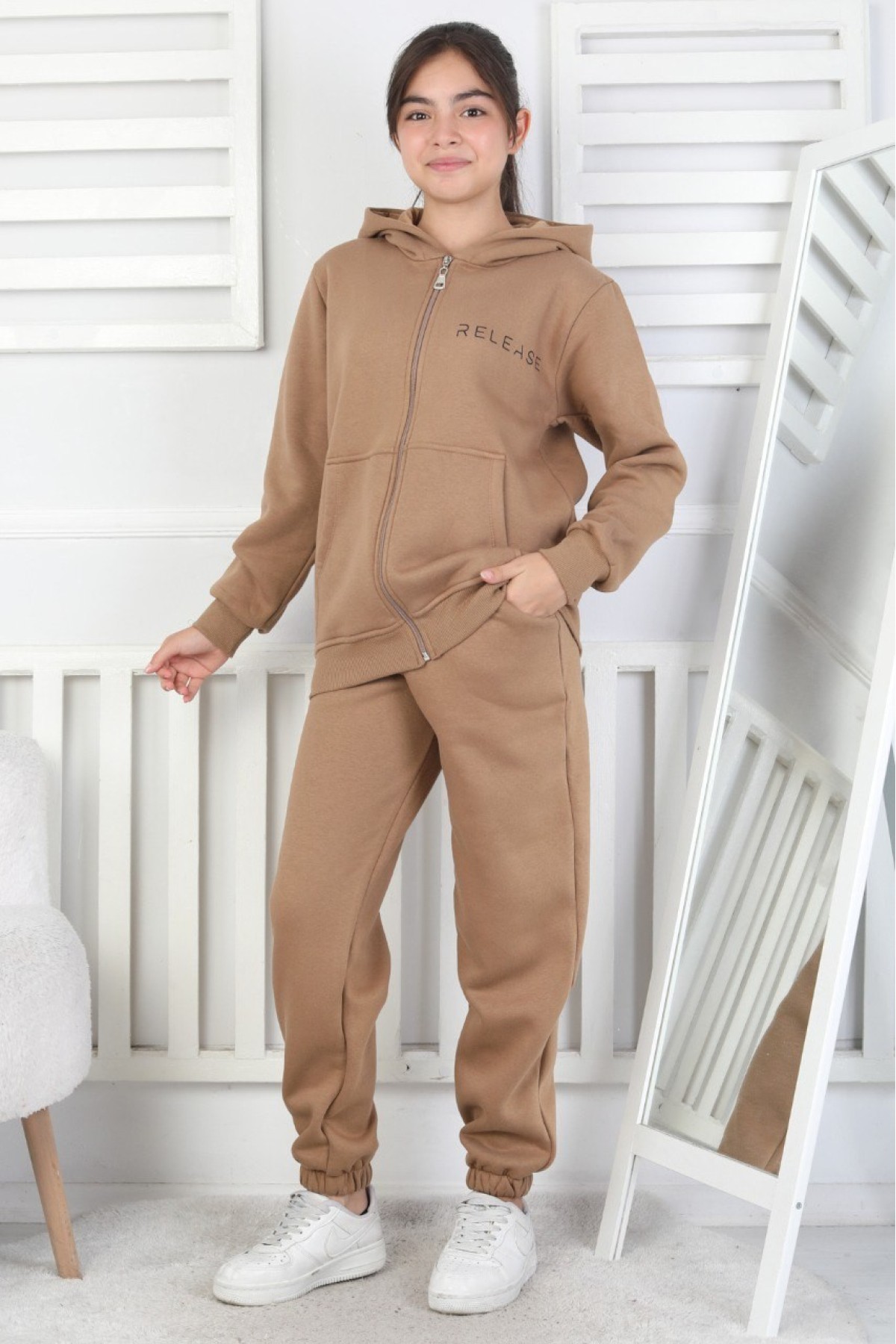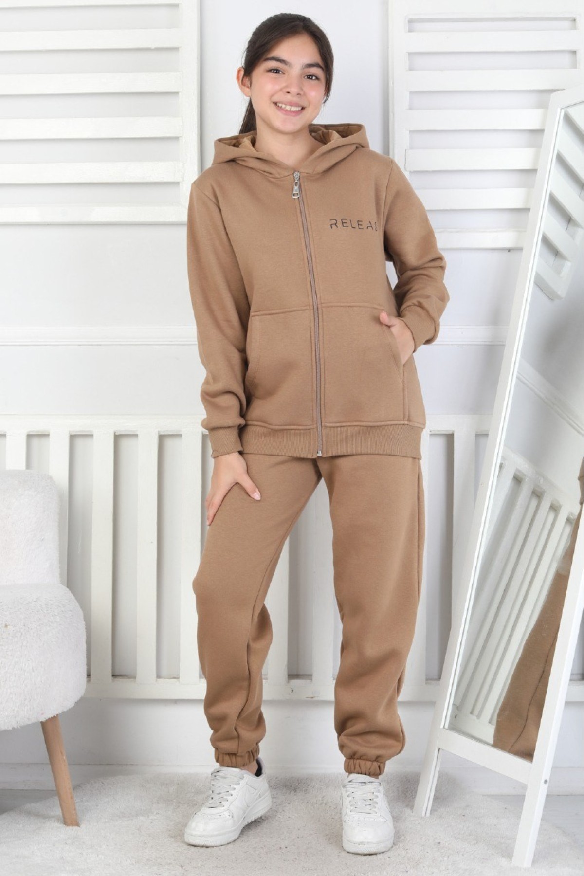 Şardonlu 3 İplik Kapşonlu Baskılı Kız Çocuk Takım