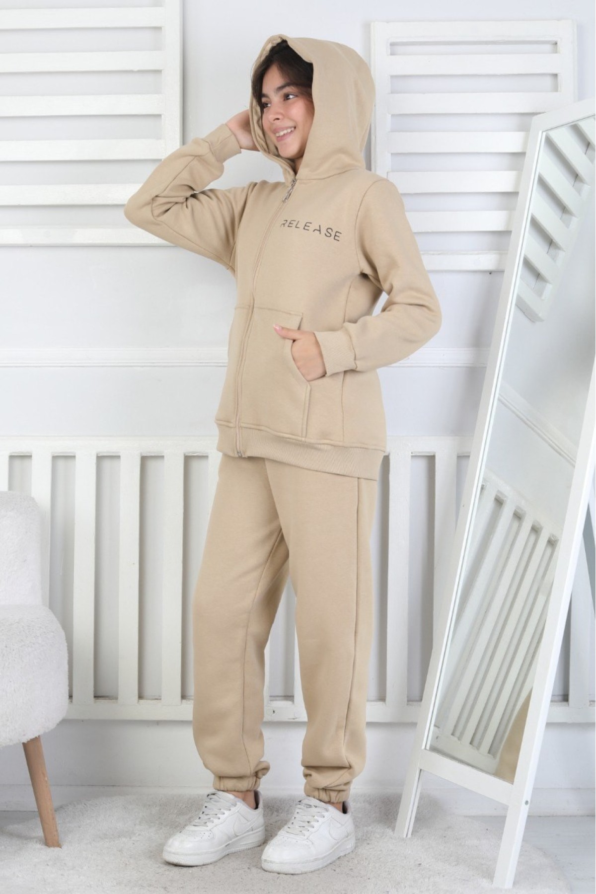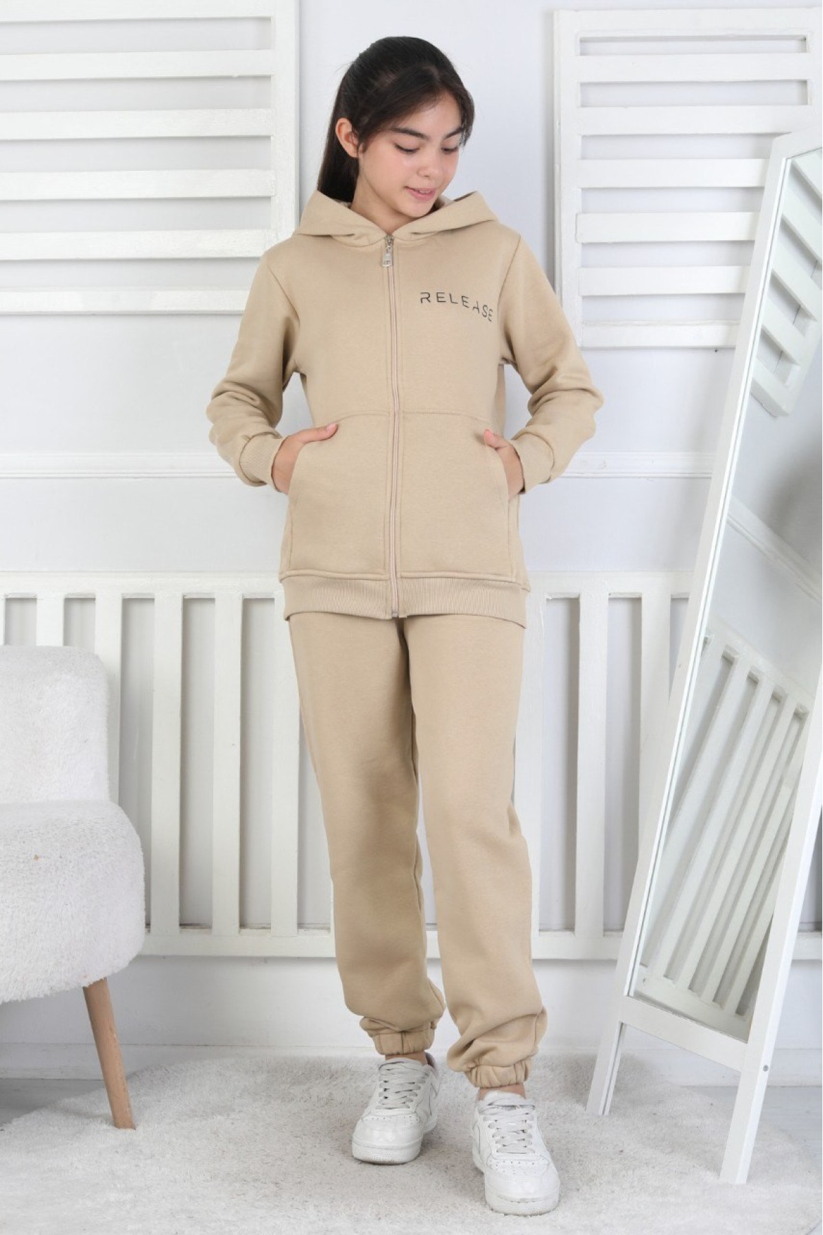 Şardonlu 3 İplik Kapşonlu Baskılı Kız Çocuk Takım
