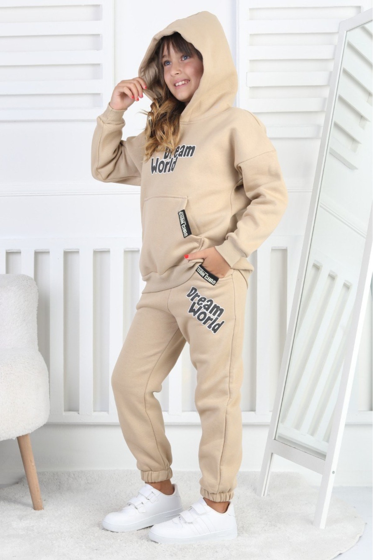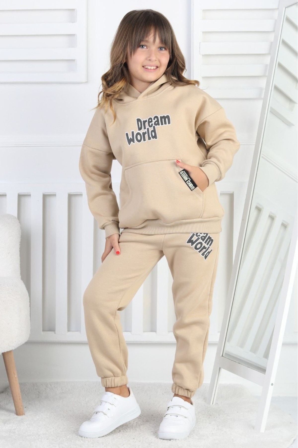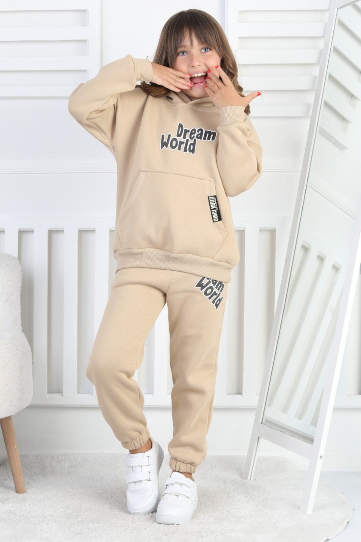 Şardonlu 3 İplik Baskılı Kapşonlu Kız Çocuk Takım