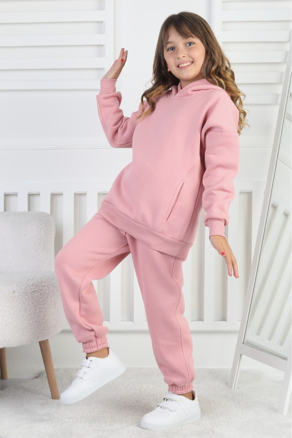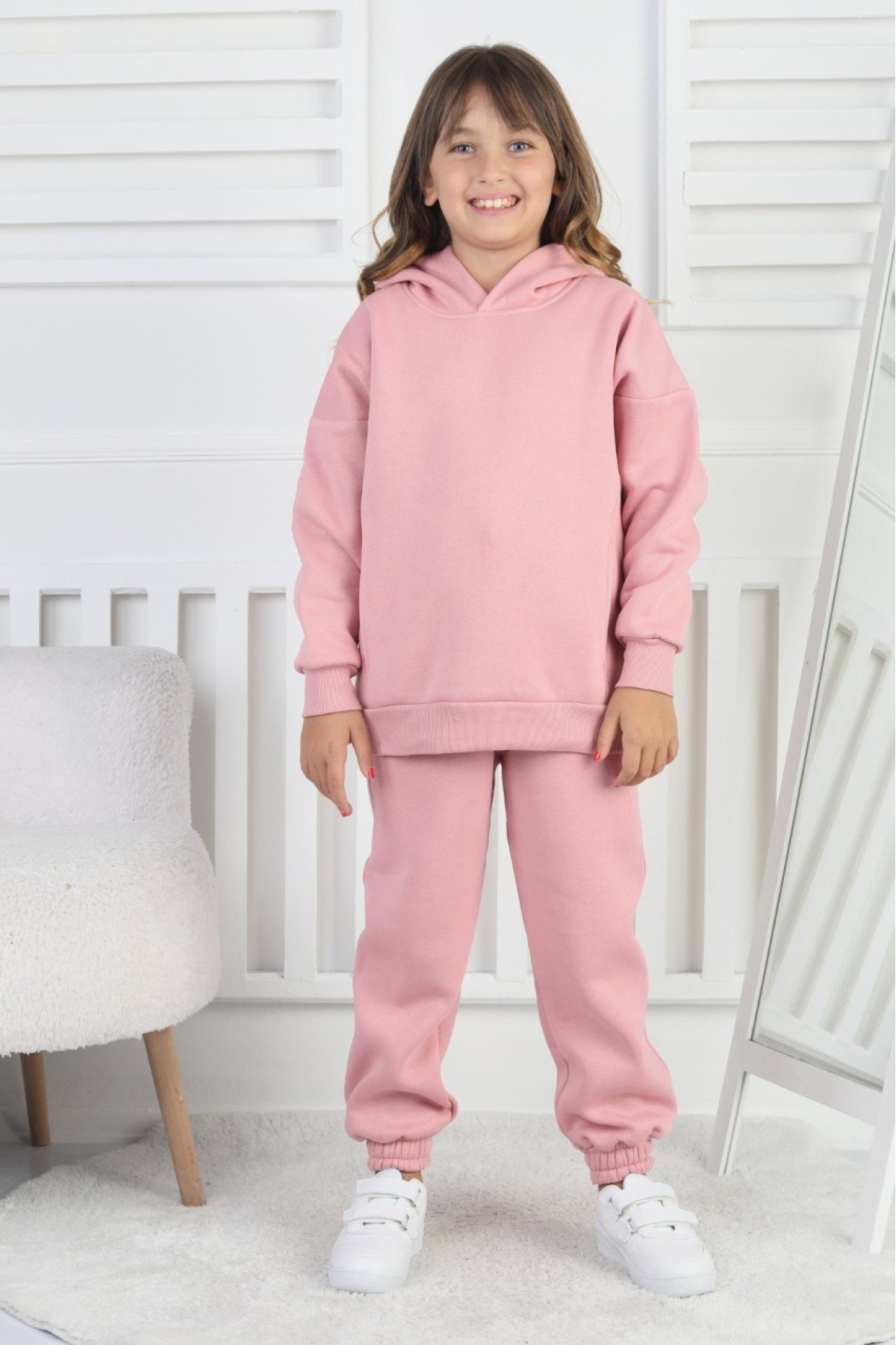 Şardonlu 3 İplik Baskılı Kapşonlu Kız Çocuk Takım